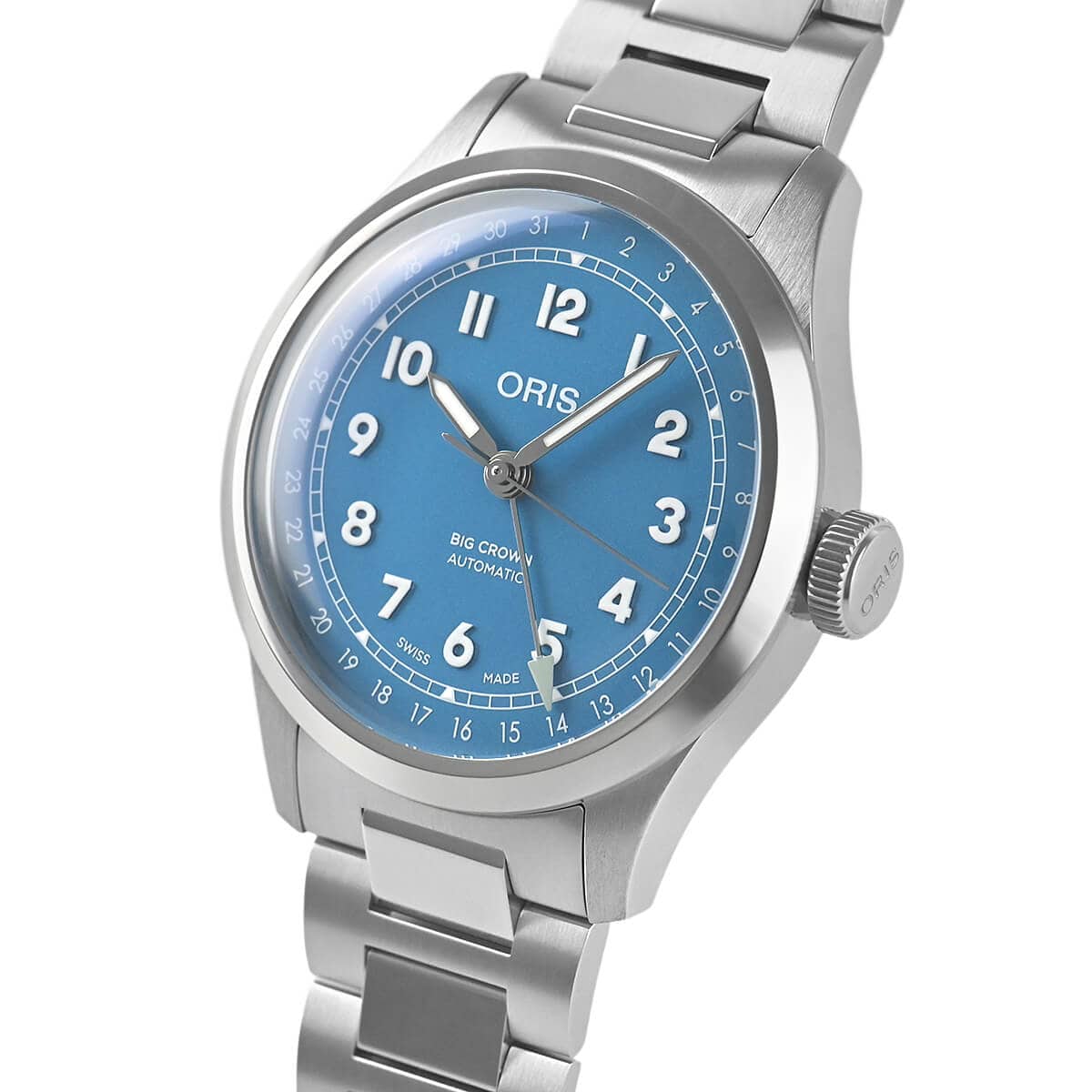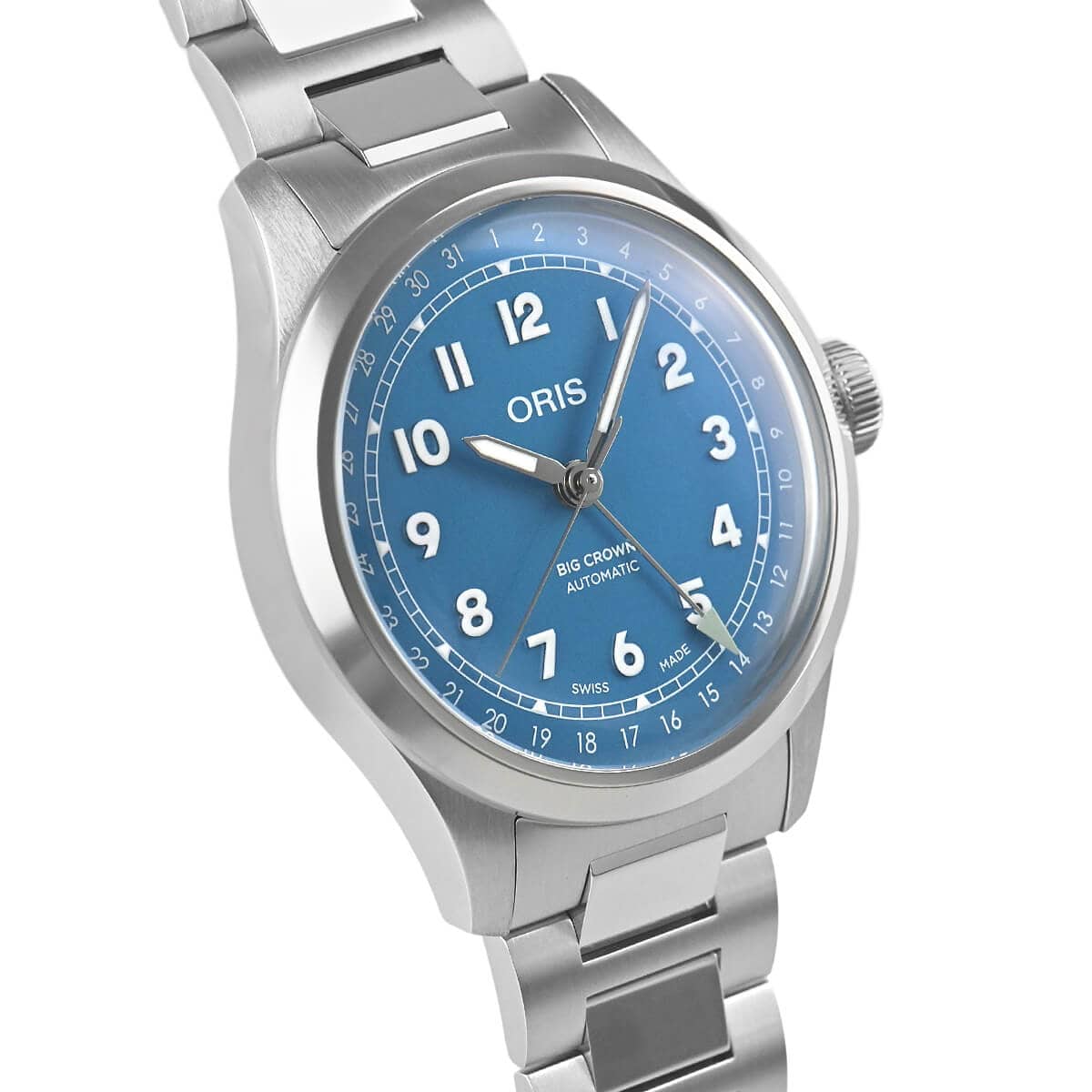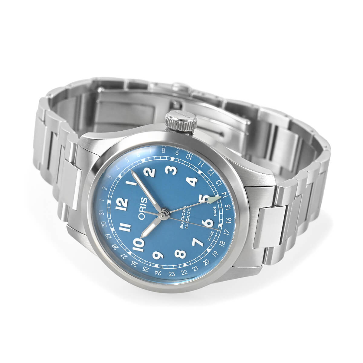 オリスの定番モデル「ビッグクラウン ポインターデイト」。シンプルなデザインで視認性に優れ、シースルバックからはムーブメントを眺める事が出来ます。