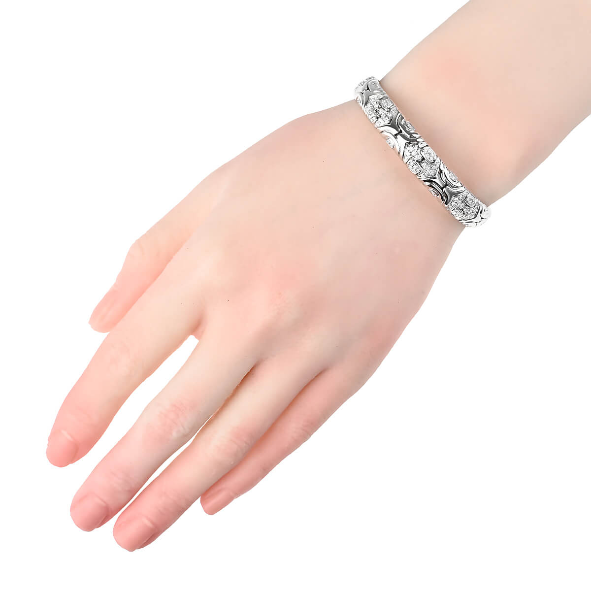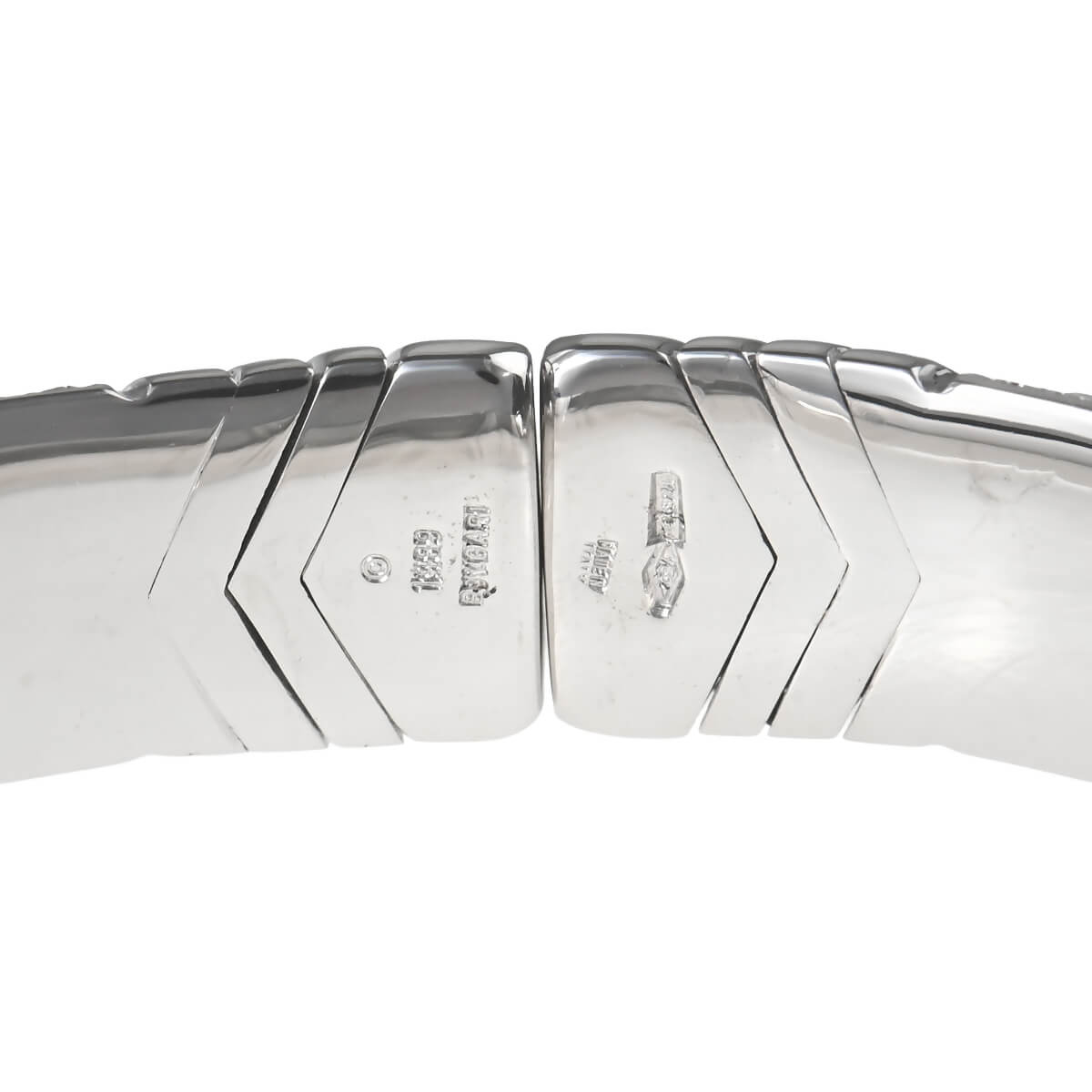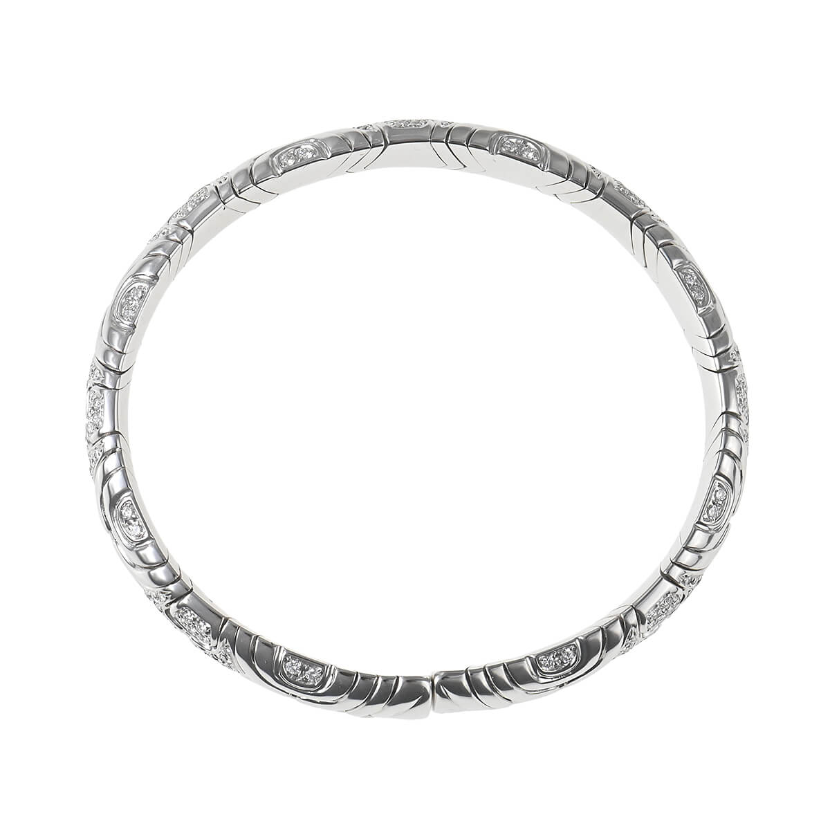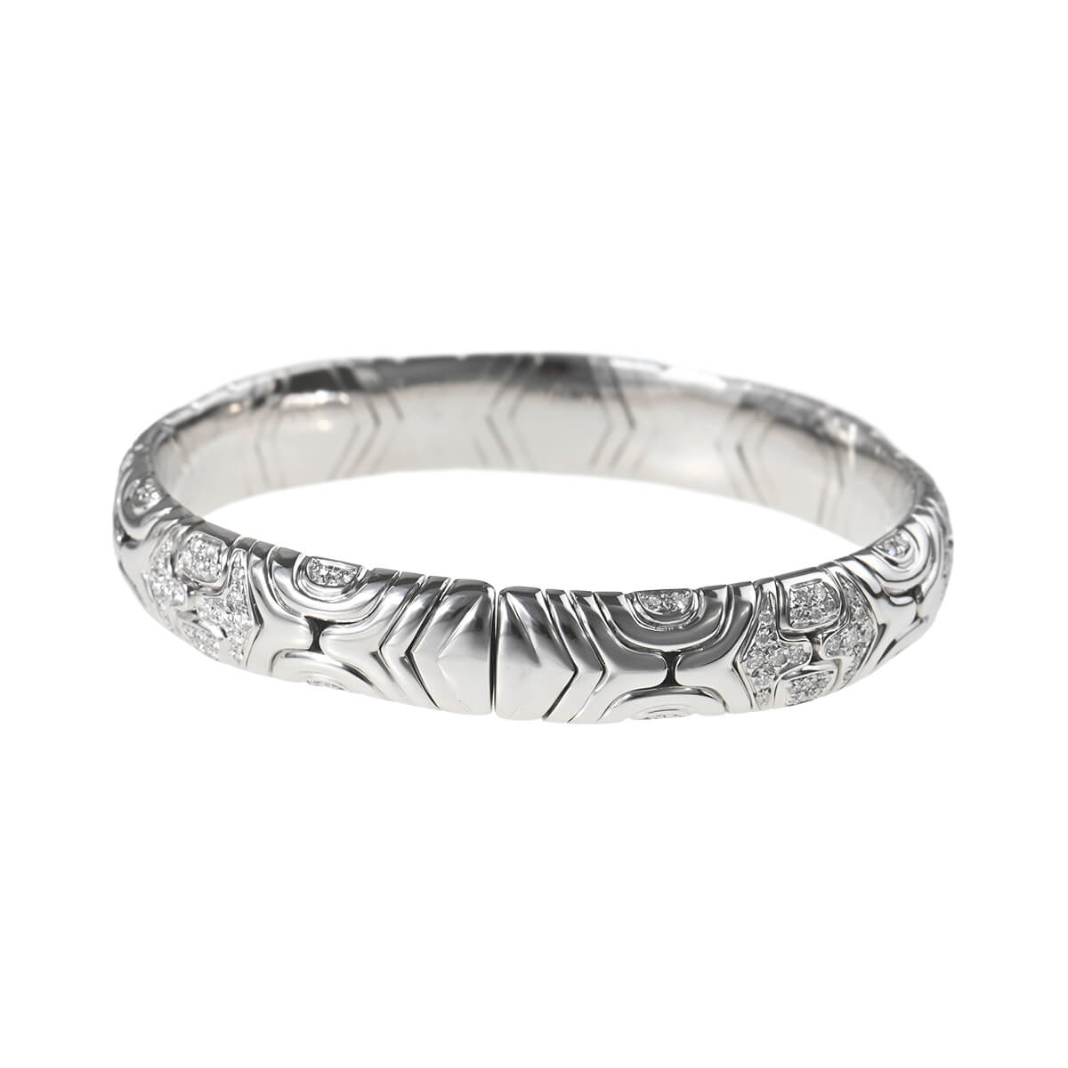 1970年代から80年代にかけて人気を博した、『BVLGARI(ブルガリ)』を象徴するヴィンテージ・コレクションのひとつ「アルベアーレ(Alveare)」コレクション。イタリア語で“蜂の巣”を意味するこのコレクションは、蜂の巣からインスピレーションを得たモジュールが連なる幾何学的なデザインが印象的。ホワイトゴールドで形づくられたモジュールが連なり、輪を描いたバングル。幾何学模様を描いたパーツには交互にパヴェダイヤモンドが敷き詰められています。重厚感がありながら、着け心地の良さも感じられる、ヴィンテージジュエリーならではの魅力にあふれたハイジュエリーです。