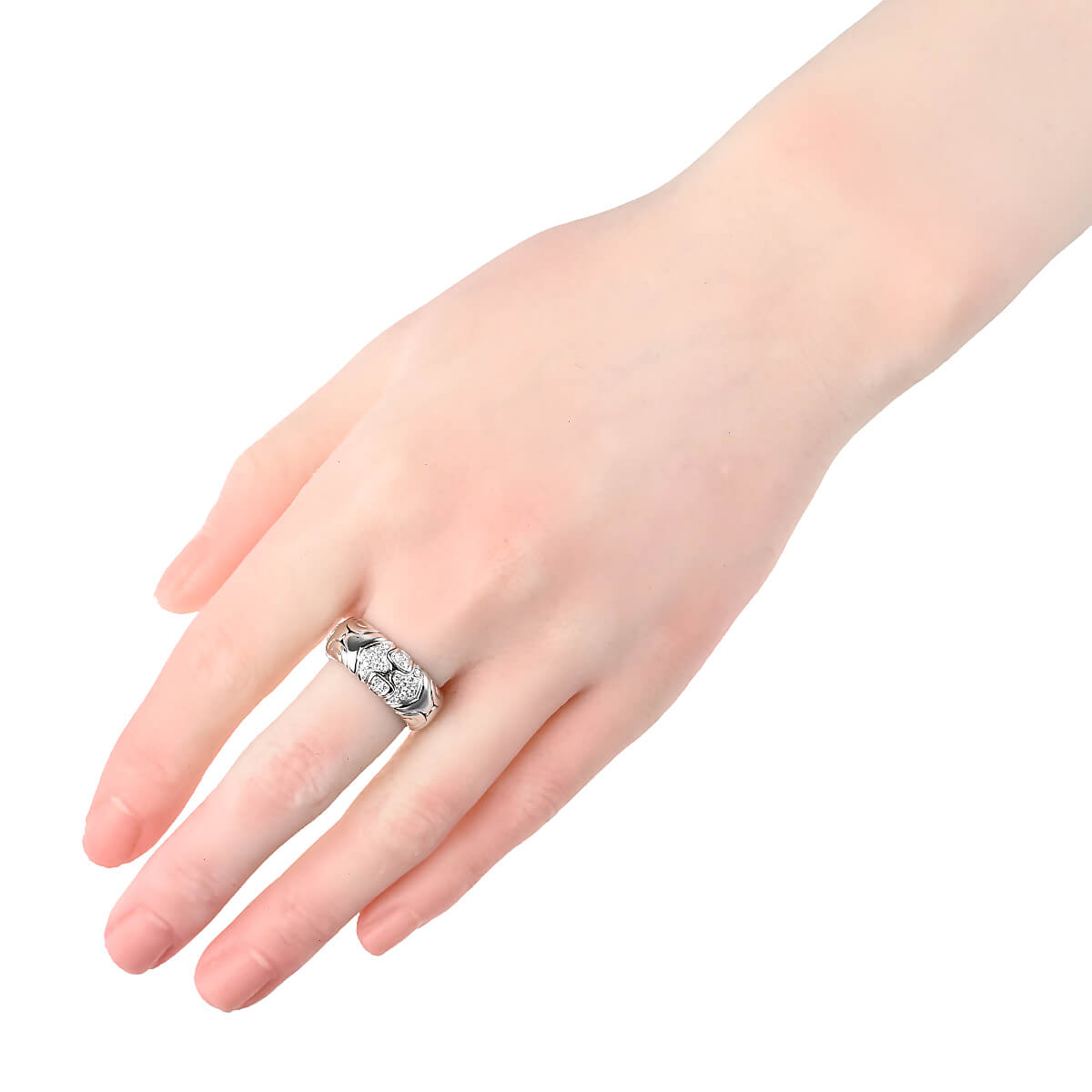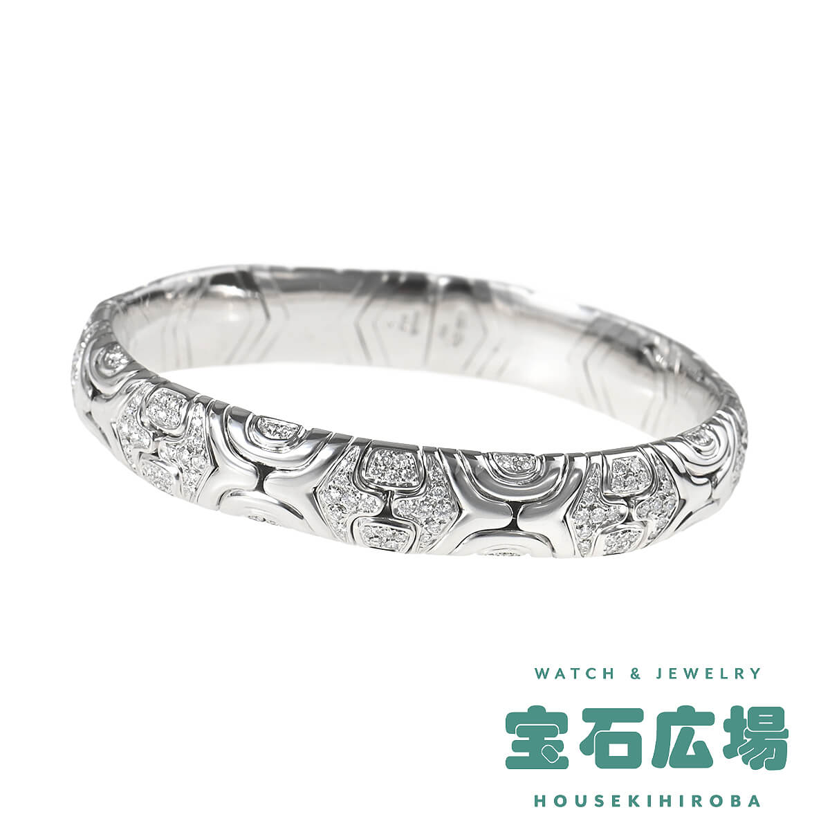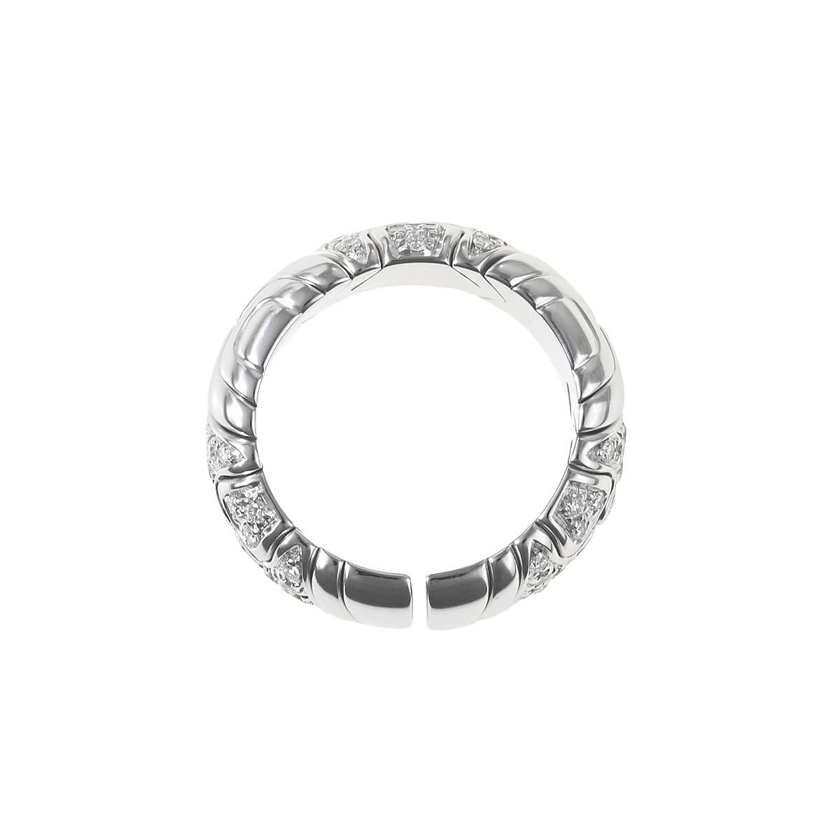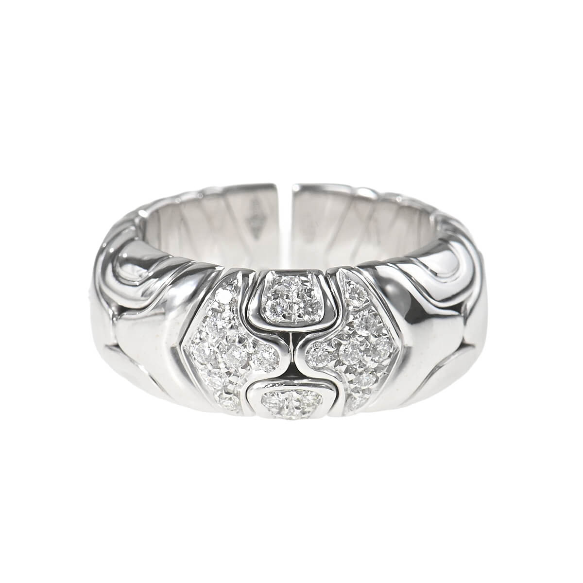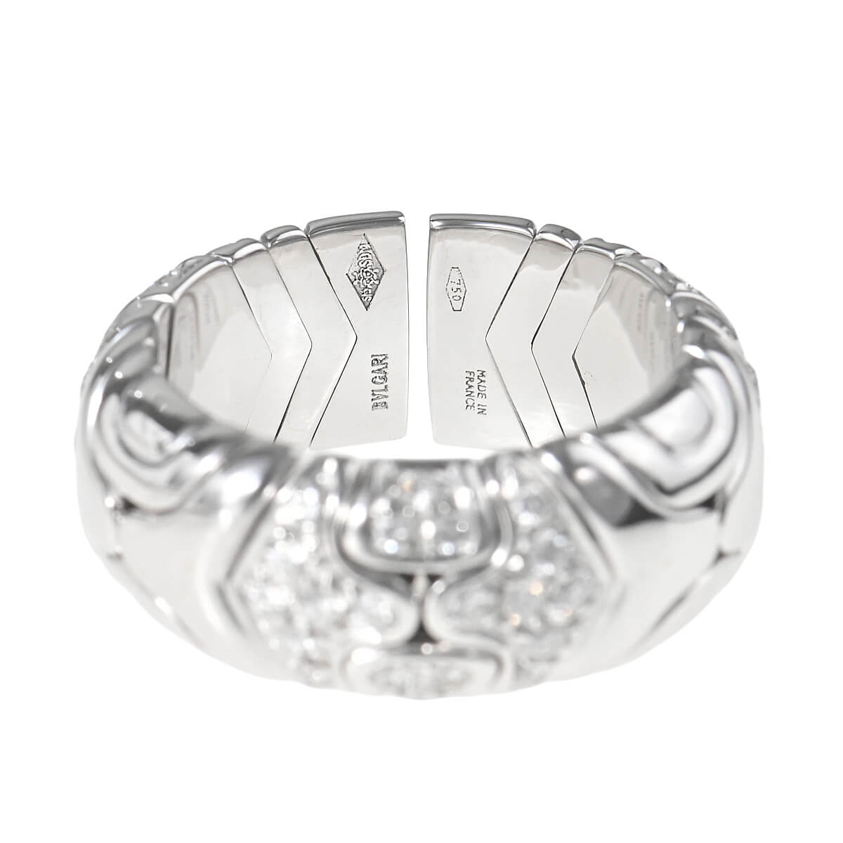 1970年代から80年代にかけて人気を博した、『BVLGARI(ブルガリ)』を象徴するヴィンテージ・コレクションのひとつ「アルベアーレ(Alveare)」コレクション。イタリア語で“蜂の巣”を意味するこのコレクションは、蜂の巣からインスピレーションを得たモジュールが連なる幾何学的なデザインが印象的。ホワイトゴールドで形づくられたモジュールが連なり、輪を描いたリング。幾何学模様を描いたパーツには交互にパヴェダイヤモンドが敷き詰められています。重厚感がありながら、着け心地の良さも感じられる、ヴィンテージジュエリーならではの魅力にあふれたハイジュエリーです。