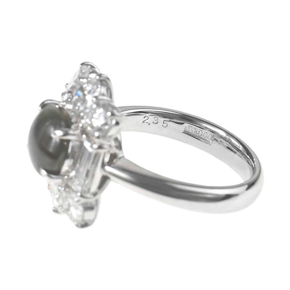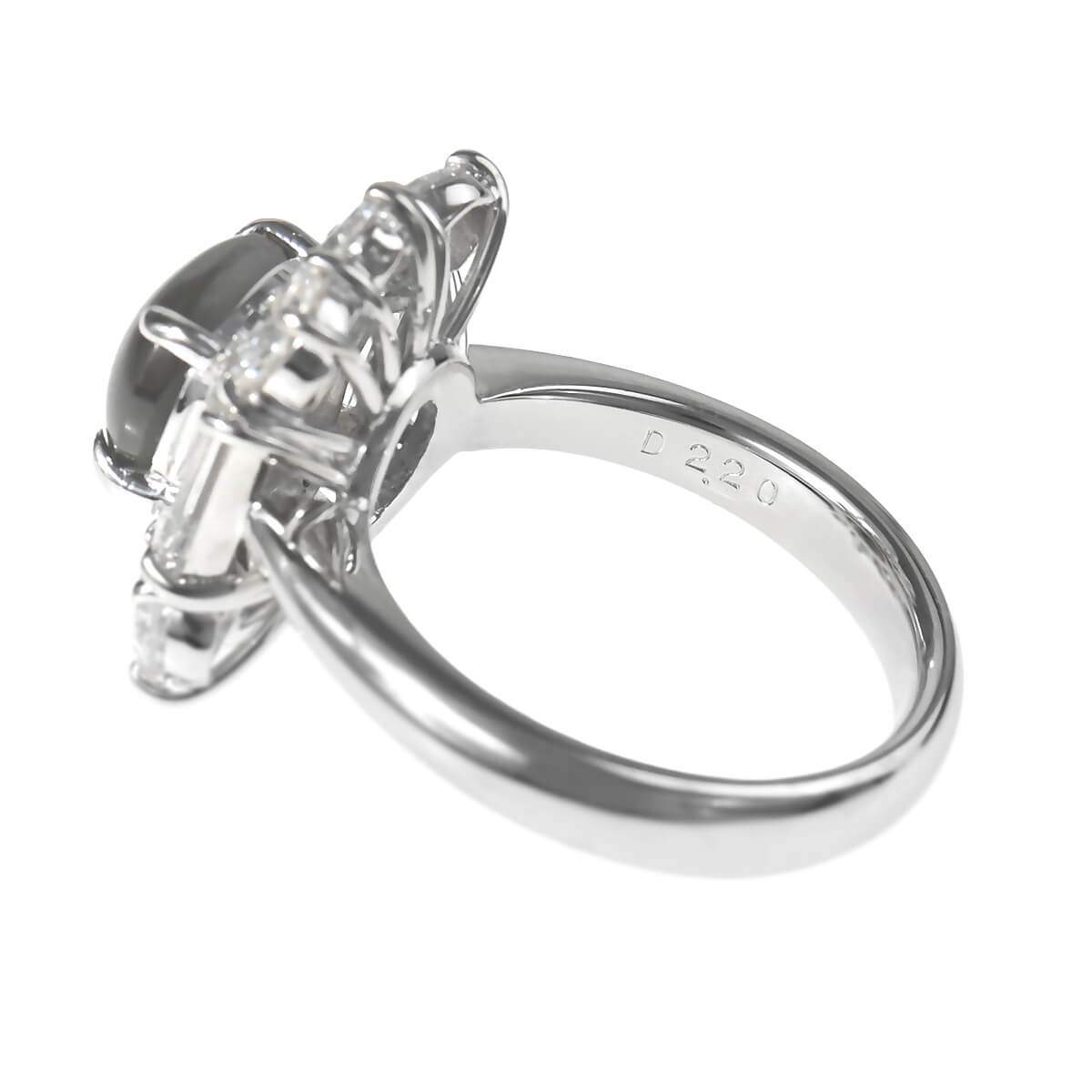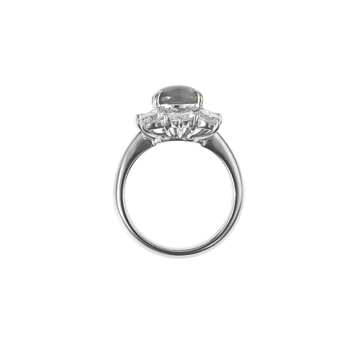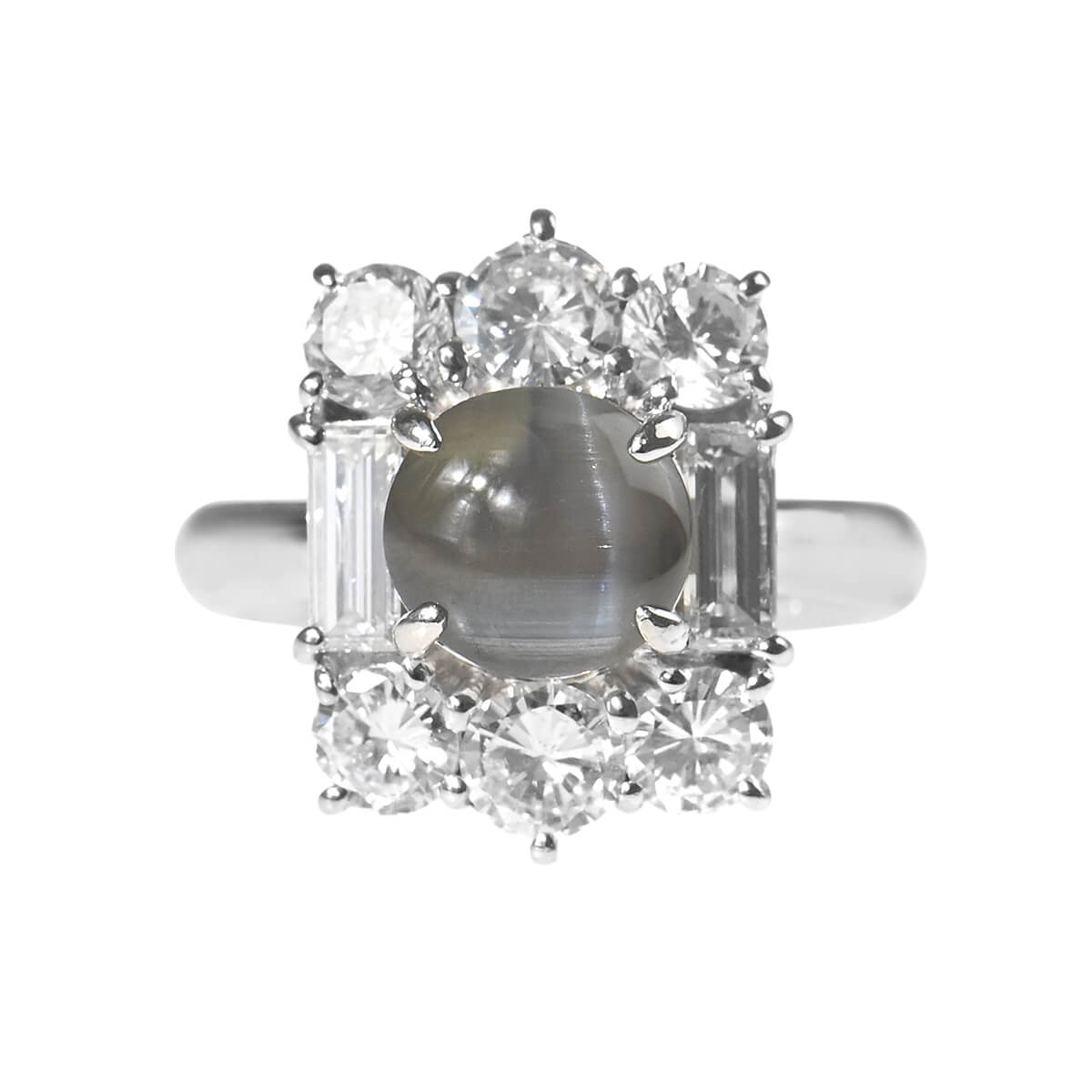 ロシアでは“皇帝の宝石”とも呼ばれ、“神様のいたずら”と称されるほどに宝石の神秘性を代表する宝石アレキサンドライトに、神秘的に浮かび上がる魅惑的なシャトヤンシー(猫目)を宿した、奇跡の宝石「アレキサンドライトキャッツアイ」。変色効果をもつアレキサンドライトは自然光で美しい緑・青緑・青色を見せ、白熱光下では、赤紫色から赤色に変色をおこす、他の宝石には見られない性質をもっています。産出量が少なく、その希少性から世界で最も高価な宝石の1つに数えられているこの宝石の、魔法のような色の移ろいの中に、愛くるしくも魔性的でさえある猫の眼の情景を映し出す「アレキサンドライトキャッツアイ」は、まさに自然界の奇跡の結晶です。そんな希少な宝石、「アレキサンドライトキャッツアイ」がシェイプの異なるダイヤモンドに囲まれた、プラチナ製リング。クラシカルながら華やかで、神秘的な存在感を放つリングは、フォーマルな席や和装でのコーディネートにはもちろんデイリーのスタイリングのアクセントにしても素敵です。