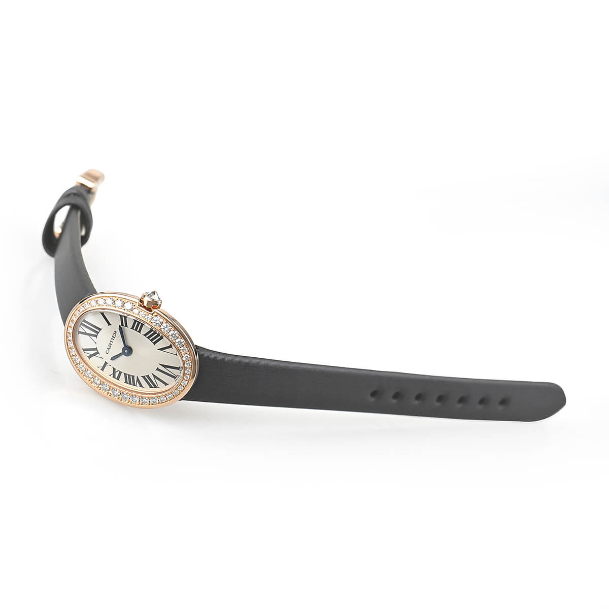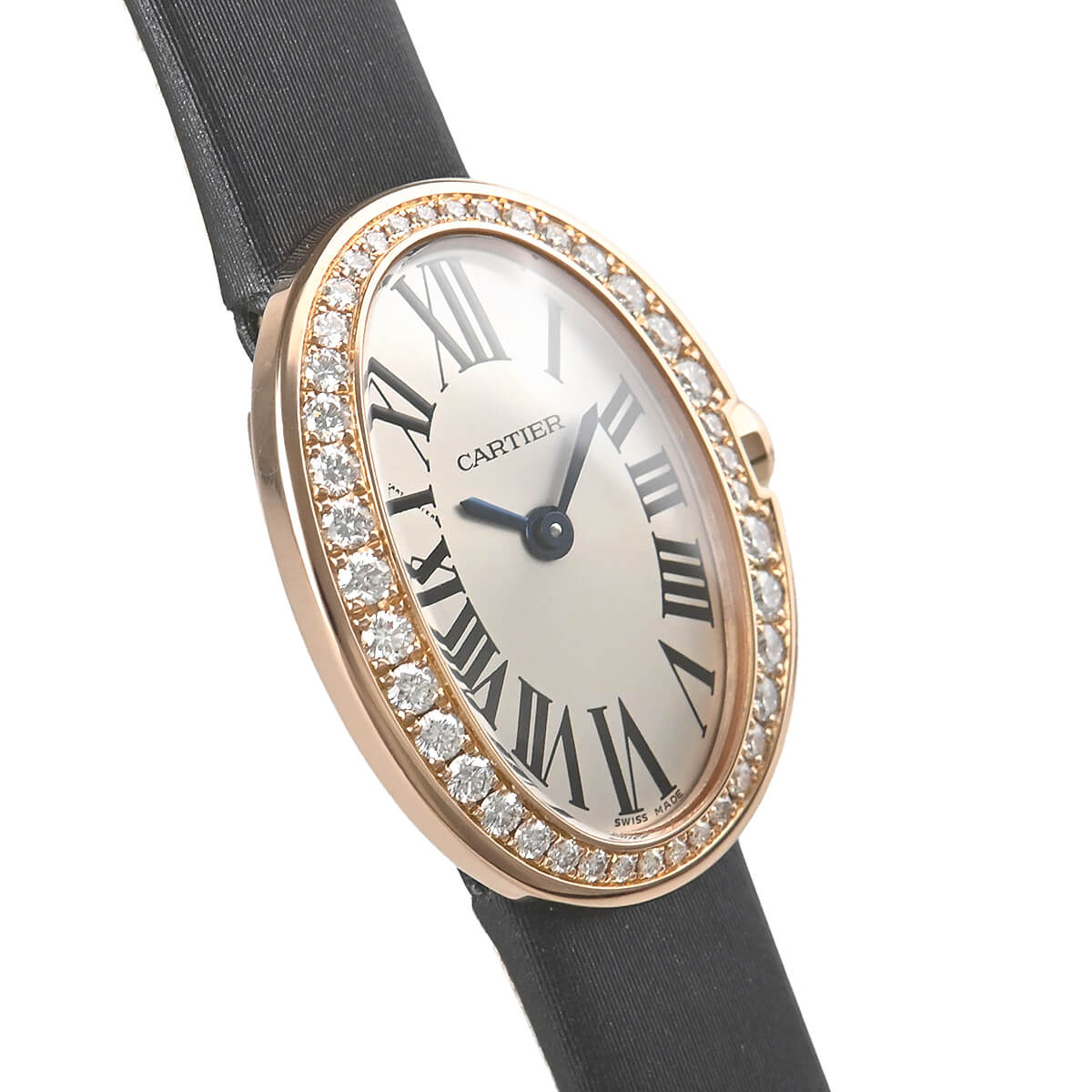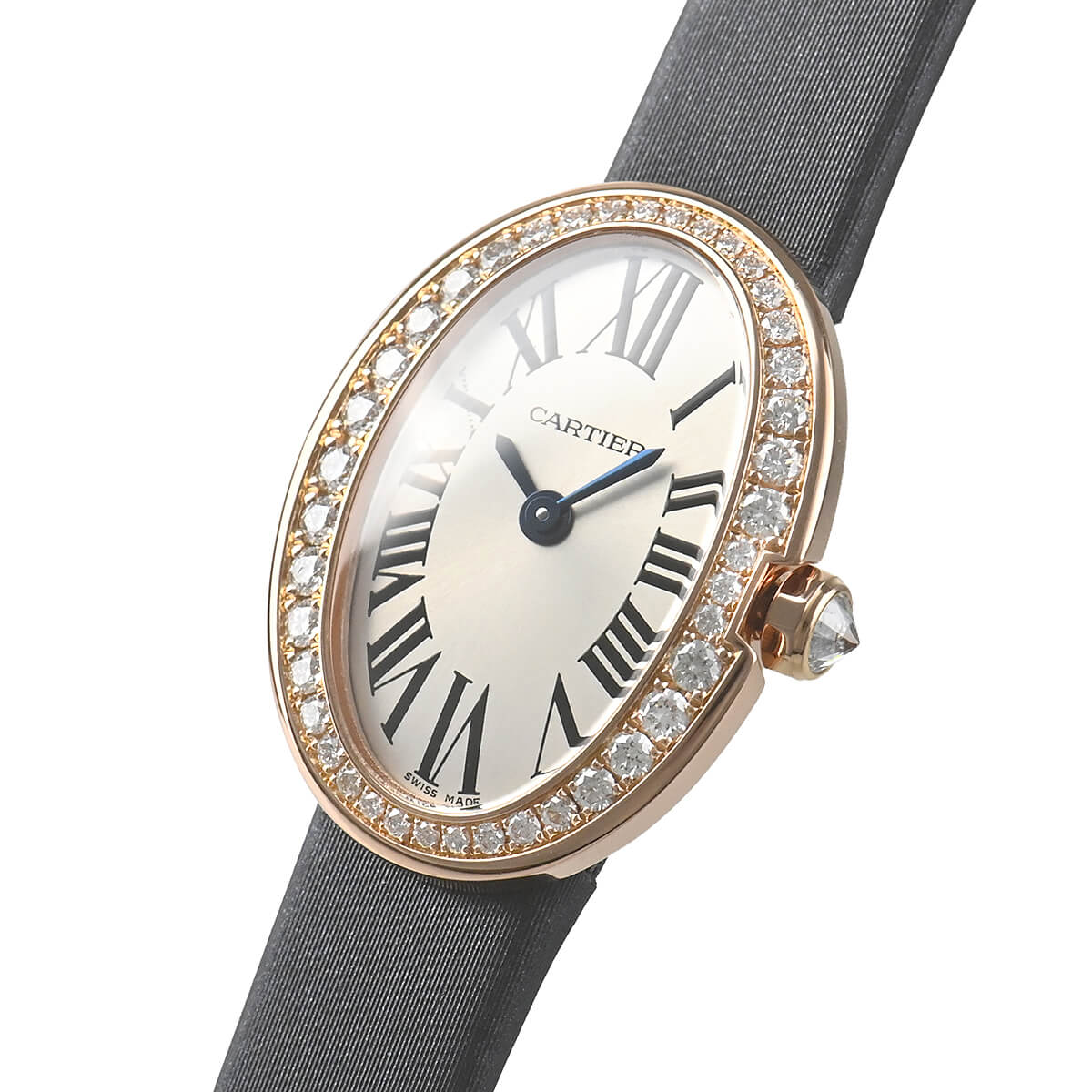 楕円の滑らかな曲線が女性らしさを演出する「ミニベニュワール」。こちらは美しいダイヤモンドをケースにセッティングしたモデル。