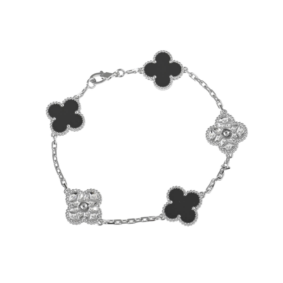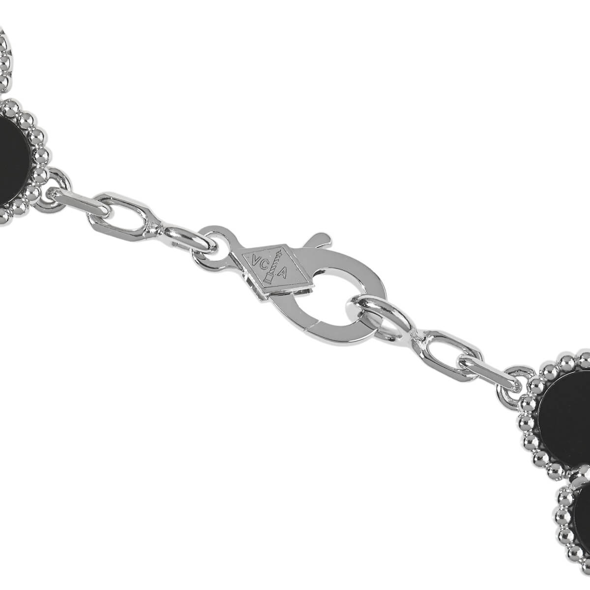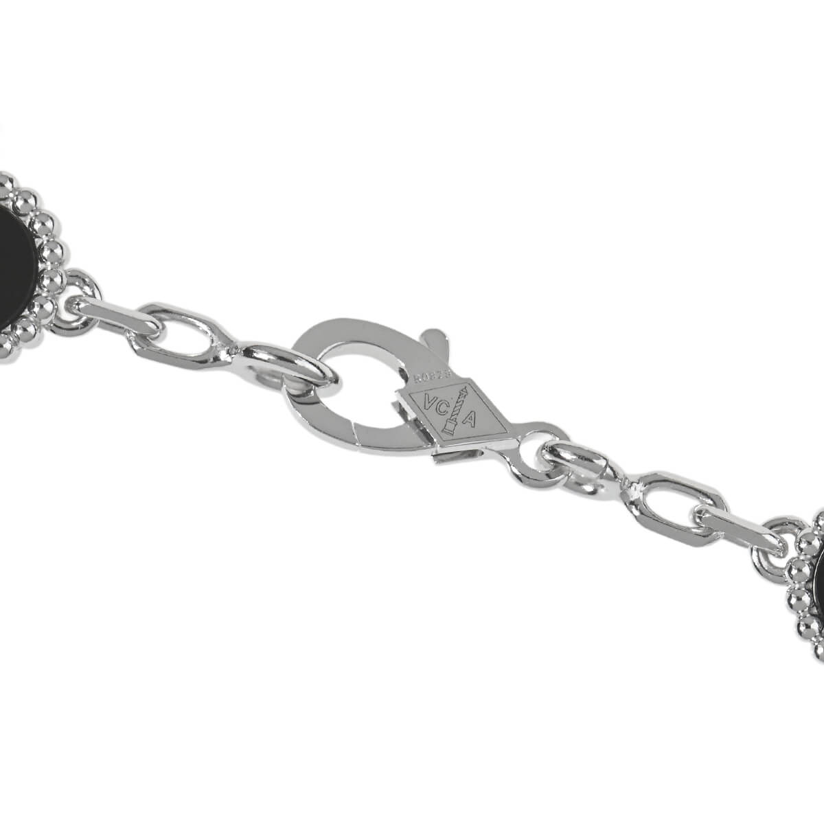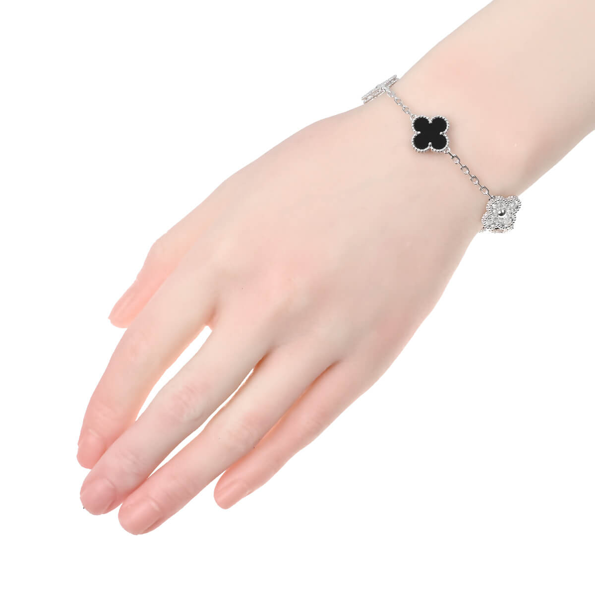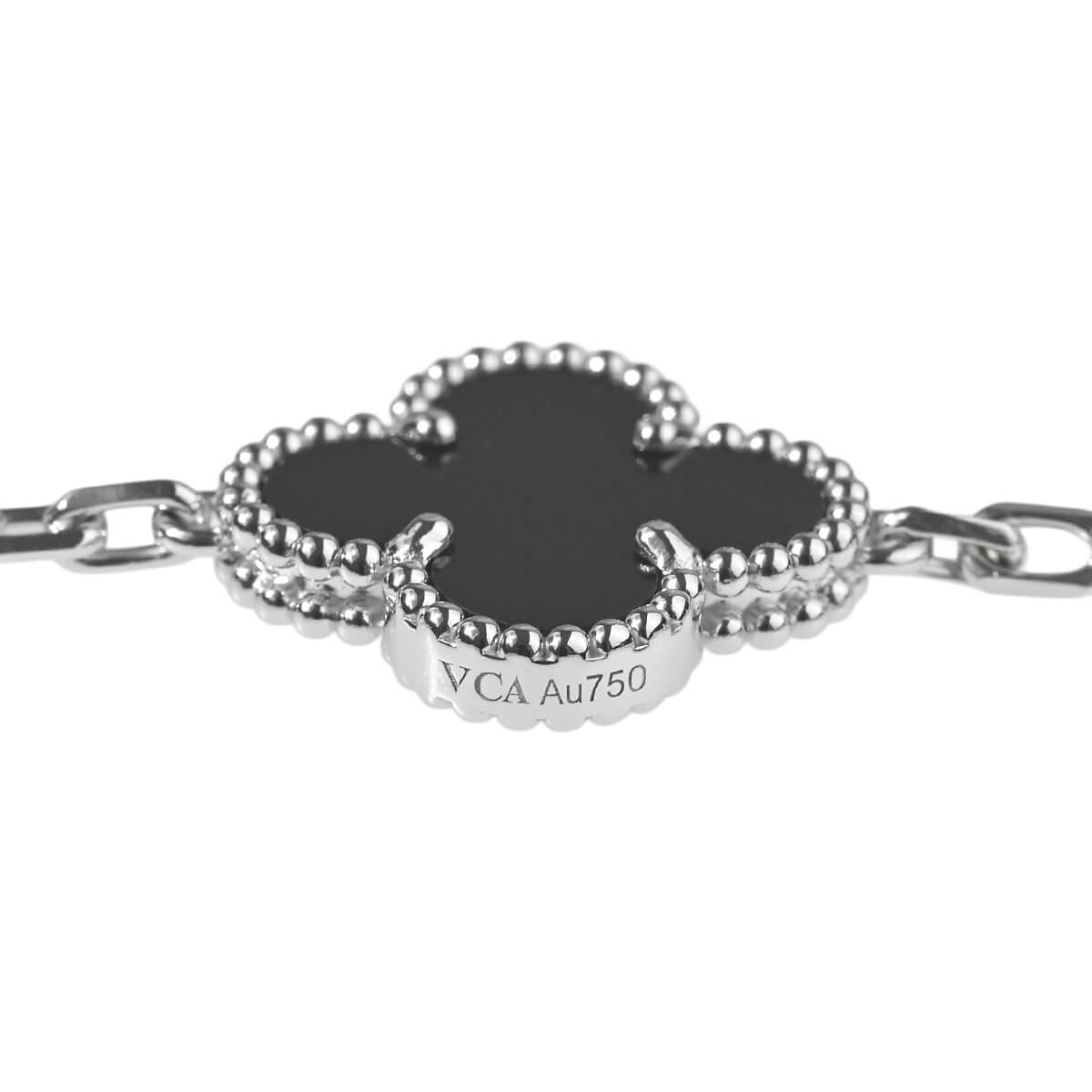 1968年に初めて誕生した幸運のシンボル「アルハンブラ」の特徴を受け継ぎ、『VanCleef&Arpels(ヴァンクリーフ&アーペル)』ならではの独創性と時を超えるエレガンスを湛える「ヴィンテージアルハンブラ」コレクション。5ピースのクローバーに交互にあしらわれた、美しく艶やかな漆黒のオニキスと極上の煌めきを放つダイヤモンドがこのうえなくエレガントで優美なコントラストを魅せる「ヴィンテージアルハンブラ」ホワイトゴールド製ブレスレット。定番コレクションながら定番モデルとは違う、洗練された大胆な華やかさをもつ、ひときわ目を引く存在感を放つブレスレットは、身に着けるだけで特別な気分に。たくさんつけてもしつこくなく、むしろ“素敵”にまとまる、不思議な個性をもつアルハンブラコレクションの中でも、ドラマティックな存在感たっぷりの特別感あふれるハイジュエリーです。