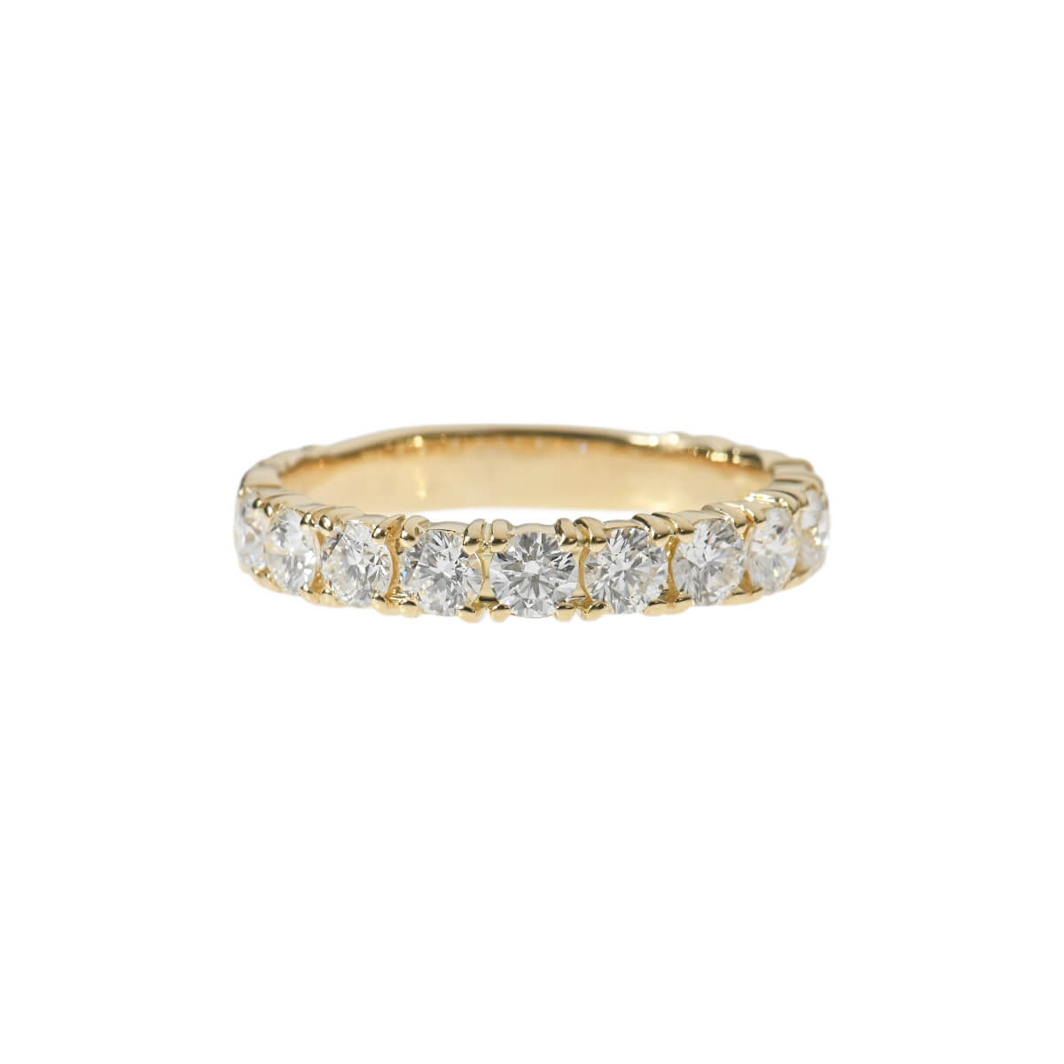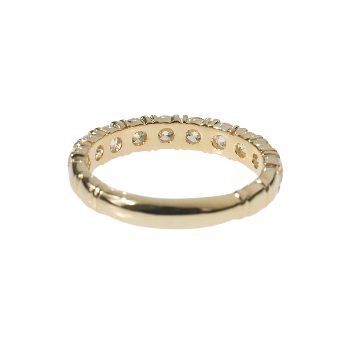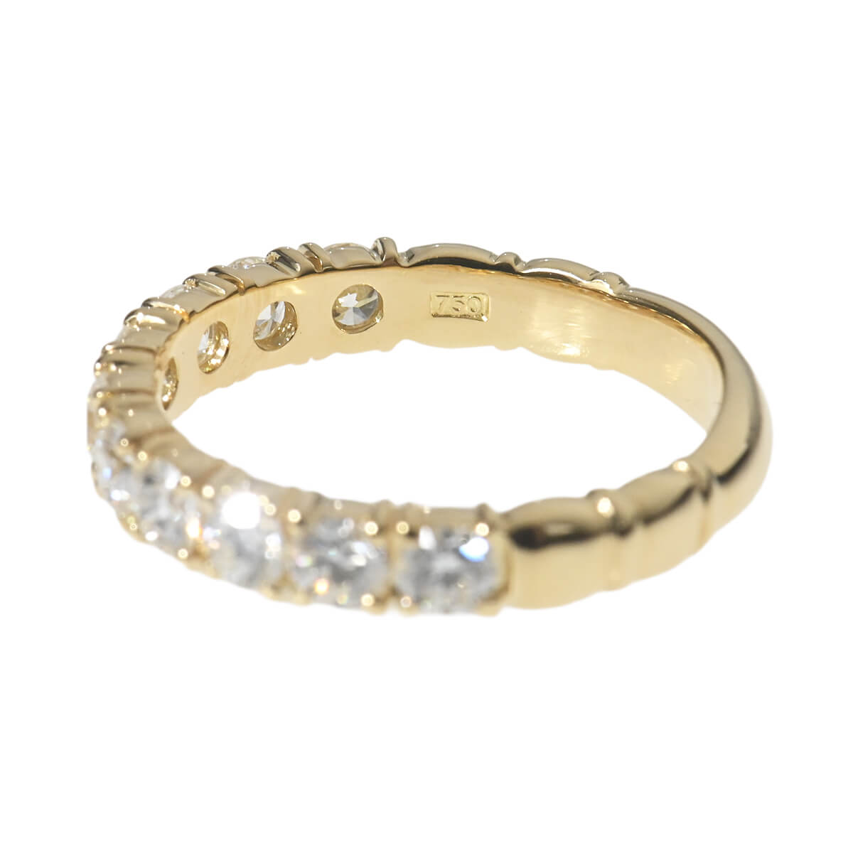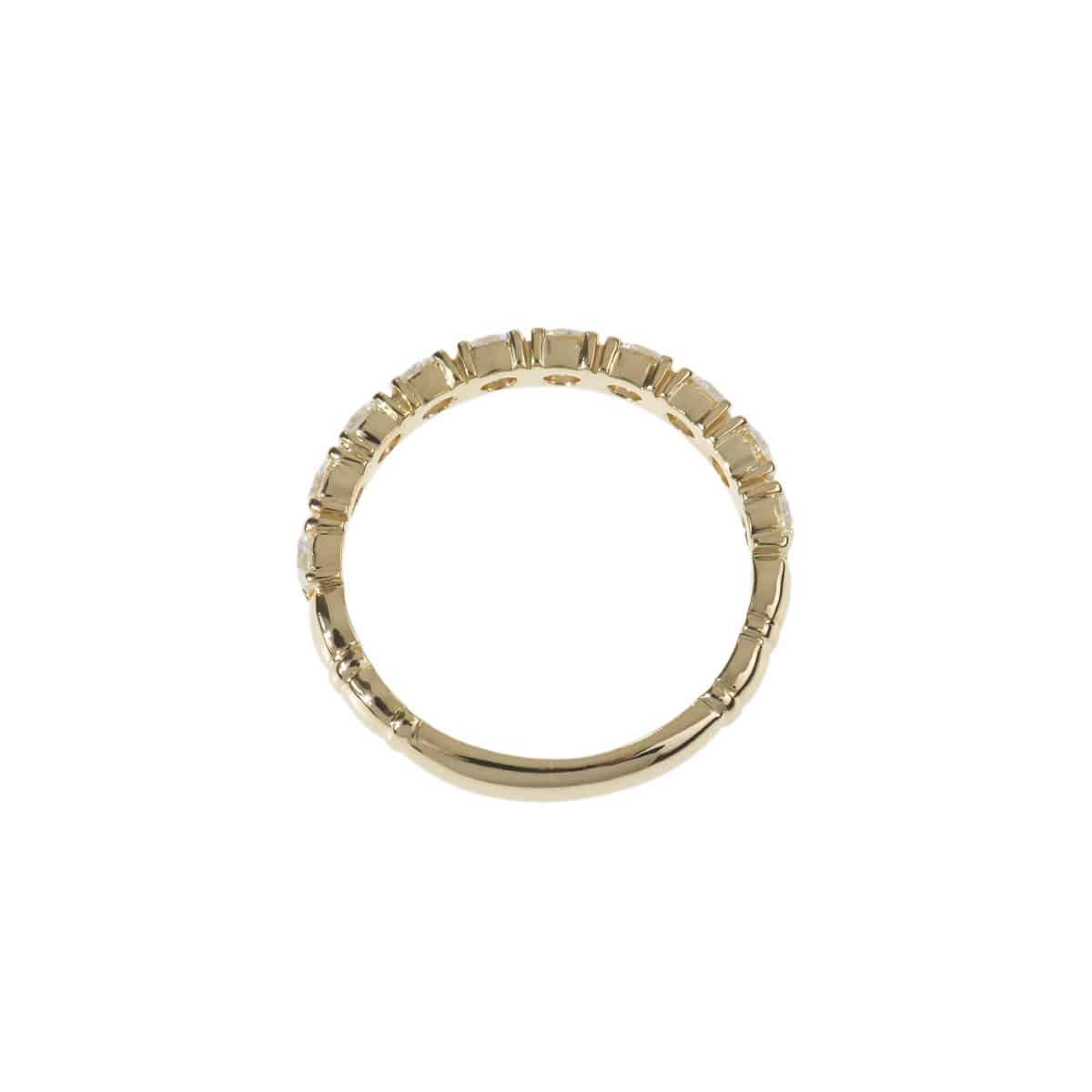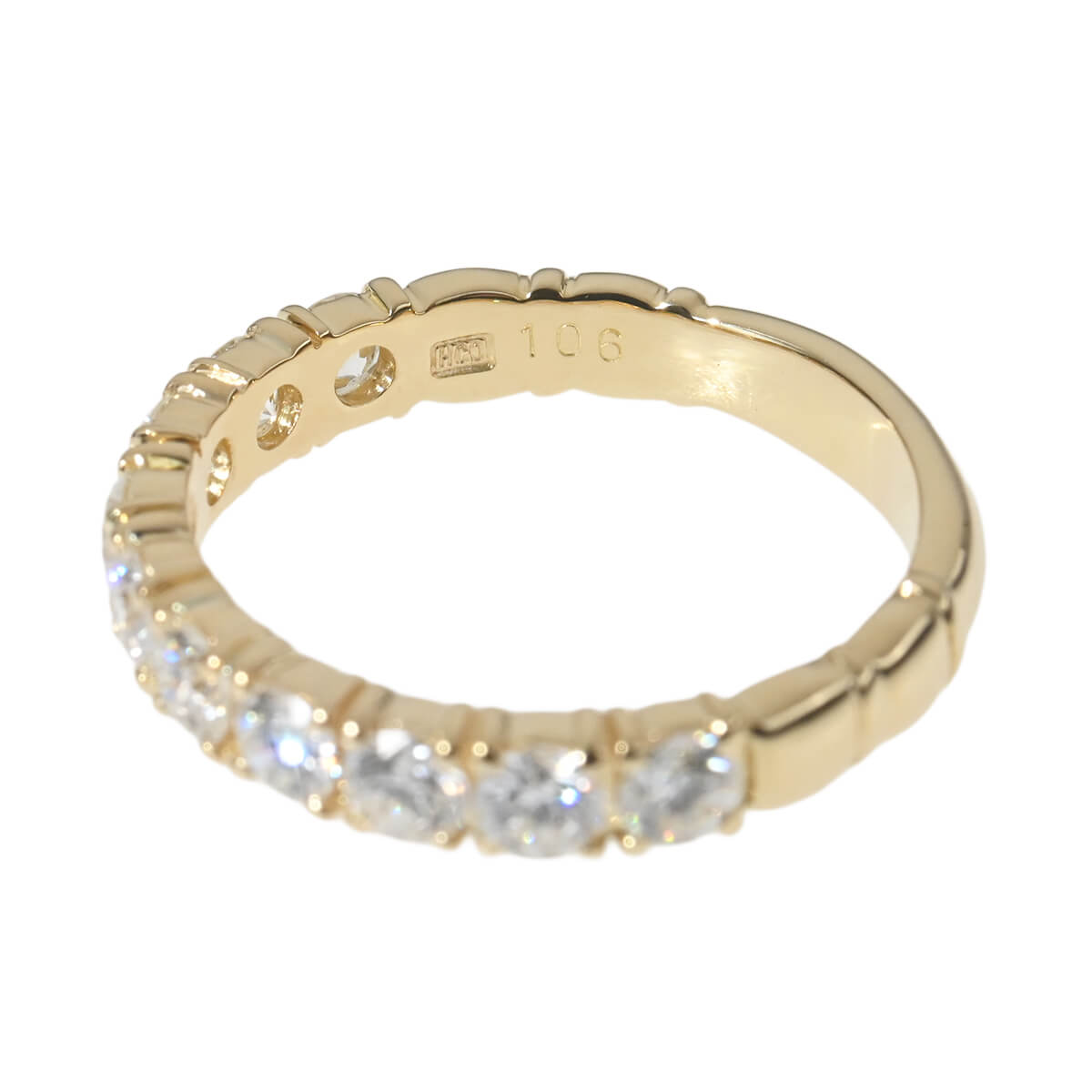 「クイーン」や「ウォルサム」をはじめ、「ステファン・ハフナー」や「トレベール」といった、芸術性が高く上質なジュエリーブランドの輸入、卸売をしていた日本の商社『H&Co. 平和堂貿易』。日本におけるジュエリー、腕時計のパイオニアともいわれていた平和堂は、オリジナルジュエリーのクオリティの高さも素晴らしく、デザインの優美さでも高い評価を得ています。トータル1.060ctものダイヤモンドが連なる、イエローゴールド製ハーフエタニティリング。繊細なプロング・セッティングで配されたラウンドダイヤモンドが煌めき、美しい輝きのラインを描いています。程よい存在感のダイヤモンドラインが美しいハーフエタニティリングは、これひとつでも、レイヤードしても。どんなシーンやスタイリングにもマッチして、指先でさりげなくも確かな存在感を放つ、美しく上質なダイヤモンドジュエリーです。