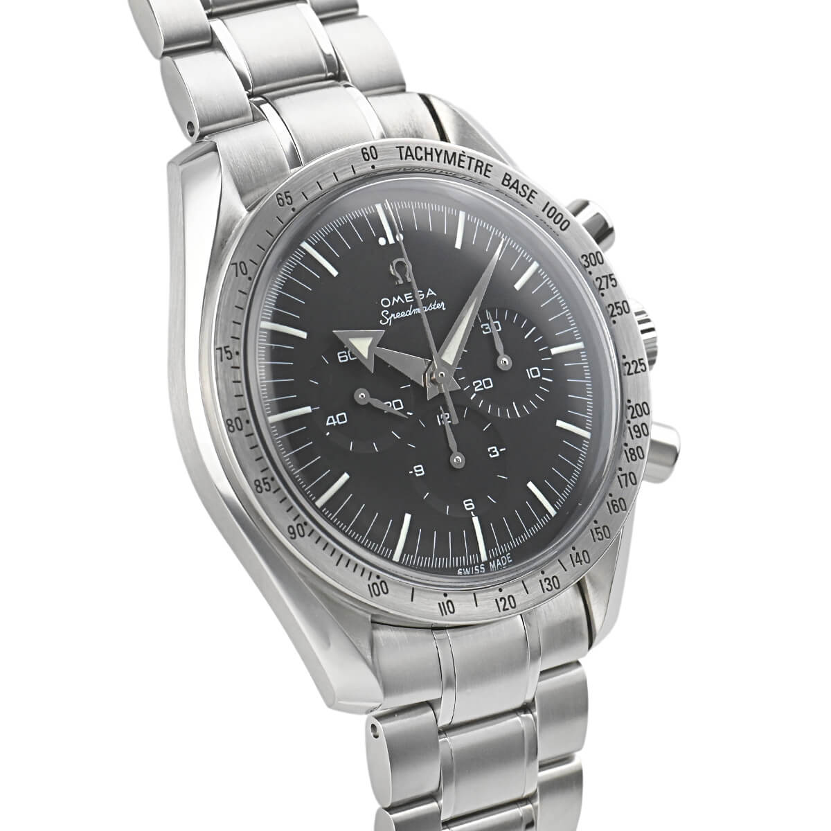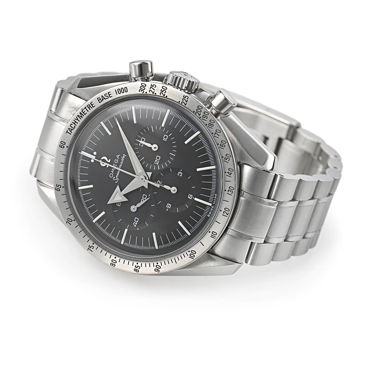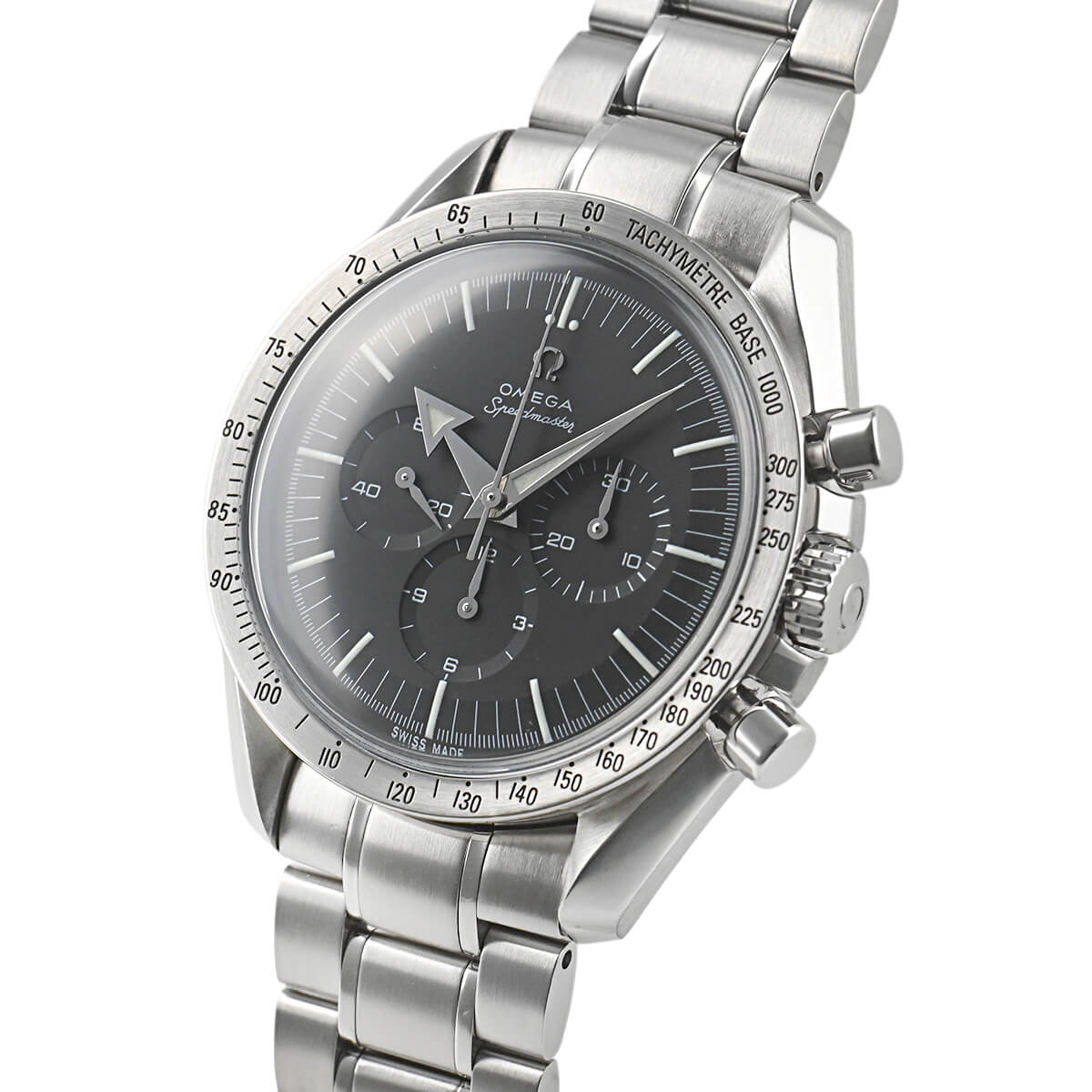 1957年に誕生した初代スピードマスターの復刻モデル「3594-50」。他のモデルとは違い、ステンレスのベゼルやアロー針などの特徴があります。