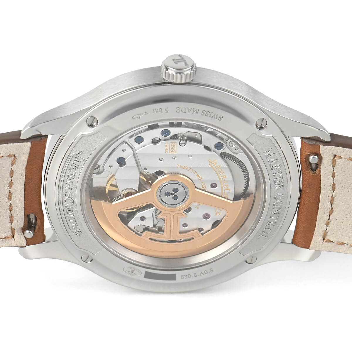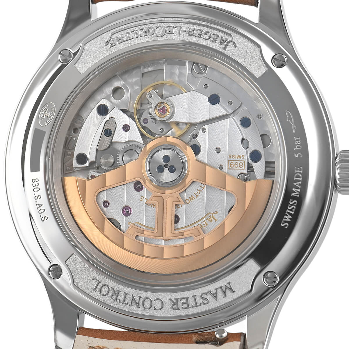 こちらの「マスターコントロールデイト」は、1950年代に人気を博したジャガールクルトが製造したシンプルなラウンドモデルを再解釈したモデル。シースルーバックから覗くムーブメントには、シリコン製脱進機を採用し、70時間のロングパワーリザーブを実現した自社キャリバー899ACを搭載しています。