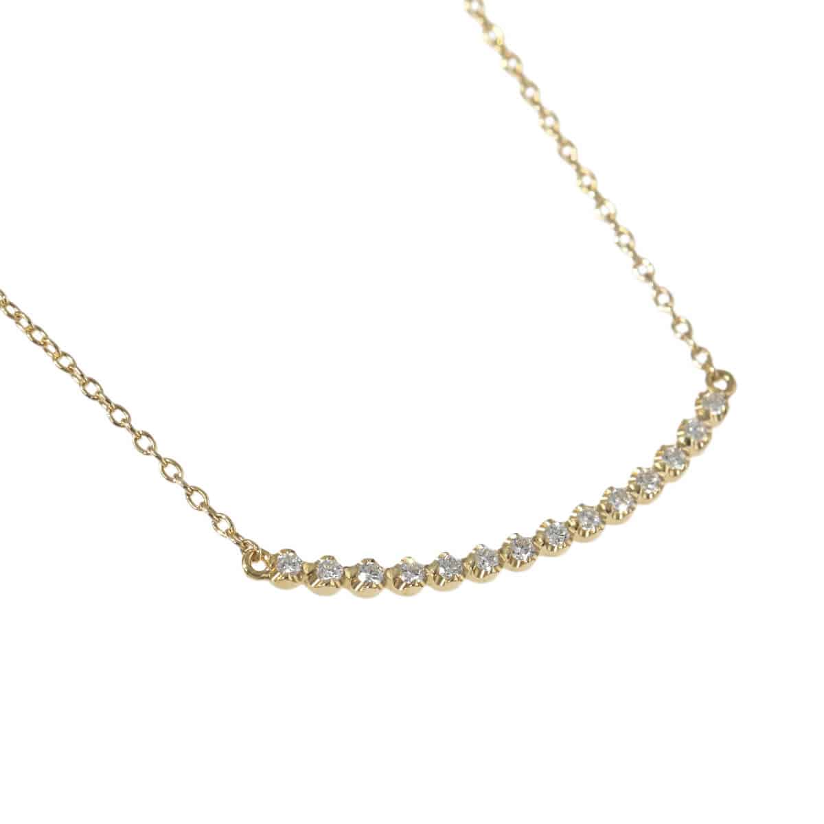 儚く無垢な美しさを追い求め、描き続けることが原点のジュエリーブランド『AHKAH(アーカー)』のラグジュアリーライン「vivian couture(ヴィヴィアンクチュール)」。ヴィヴィアンクチュールのジュエリーは、“素肌にダイヤ、タトゥーのように身にまとうジュエリー”というコンセプトのもと、ダイヤモンドの輝きを最大限活かせるようにデザインされています。トータル0.1ctのきらめくダイヤモンドをゆるやかな曲線上にあしらった、「ビリーブユー」イエローゴールド製ネックレス。キラキラと繊細に輝くゴールドチェーンにデザインされたエレガントなダイヤモンドラインが、デコルテにぴったりと寄り添い、体の一部のように肌身離さず着けられる肌に溶け込んで煌めくファインジュエリーです。