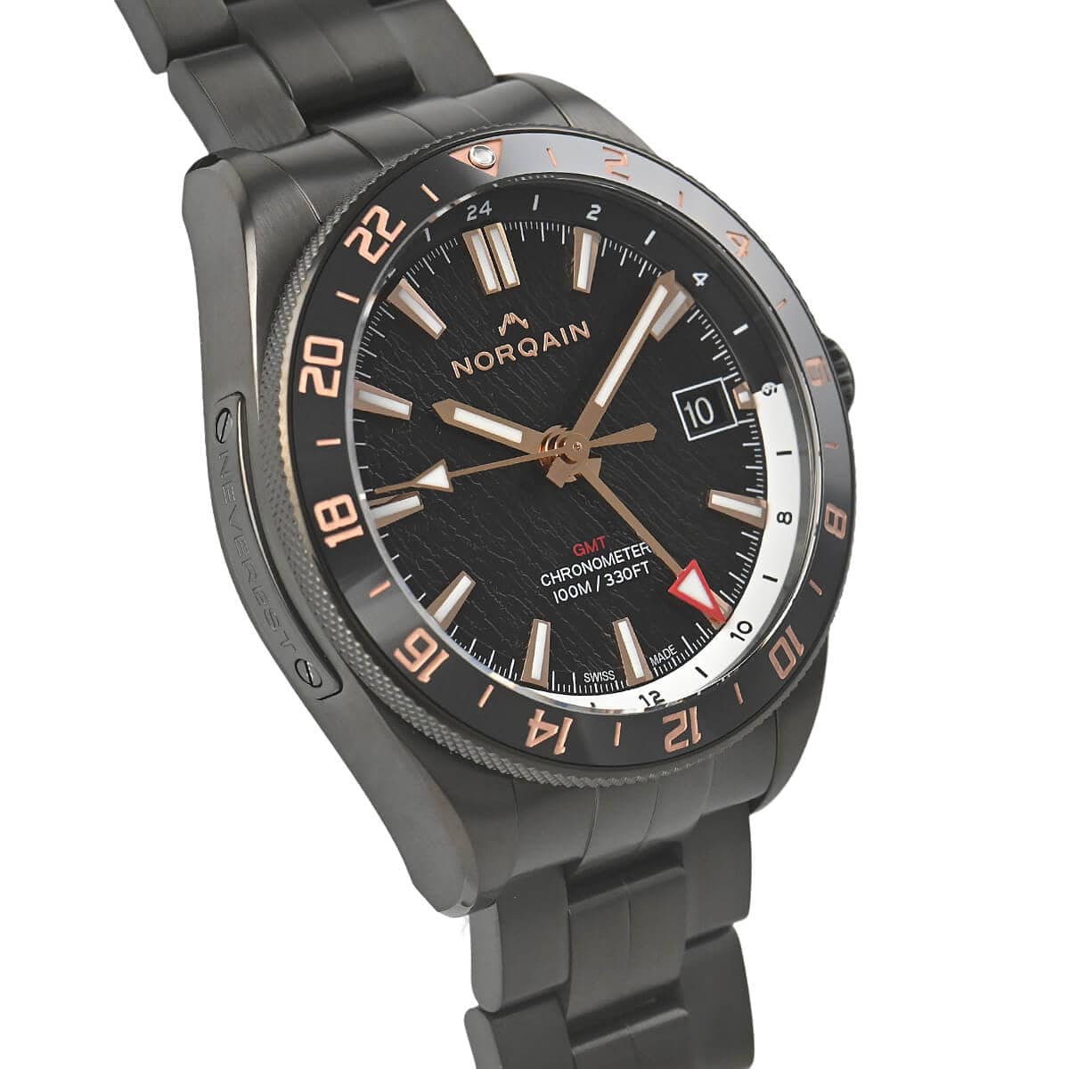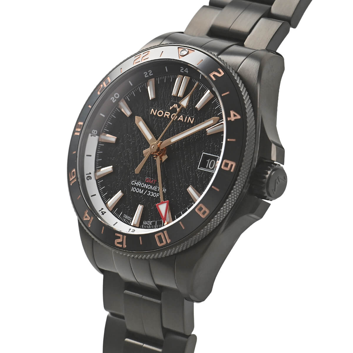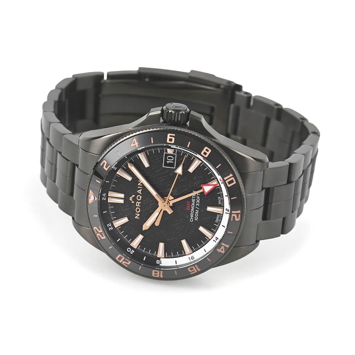 注目の新進ブランド、ノルケインの「アドベンチャー ネベレストGMT」。現代的なケースサイズの41mmを採用。