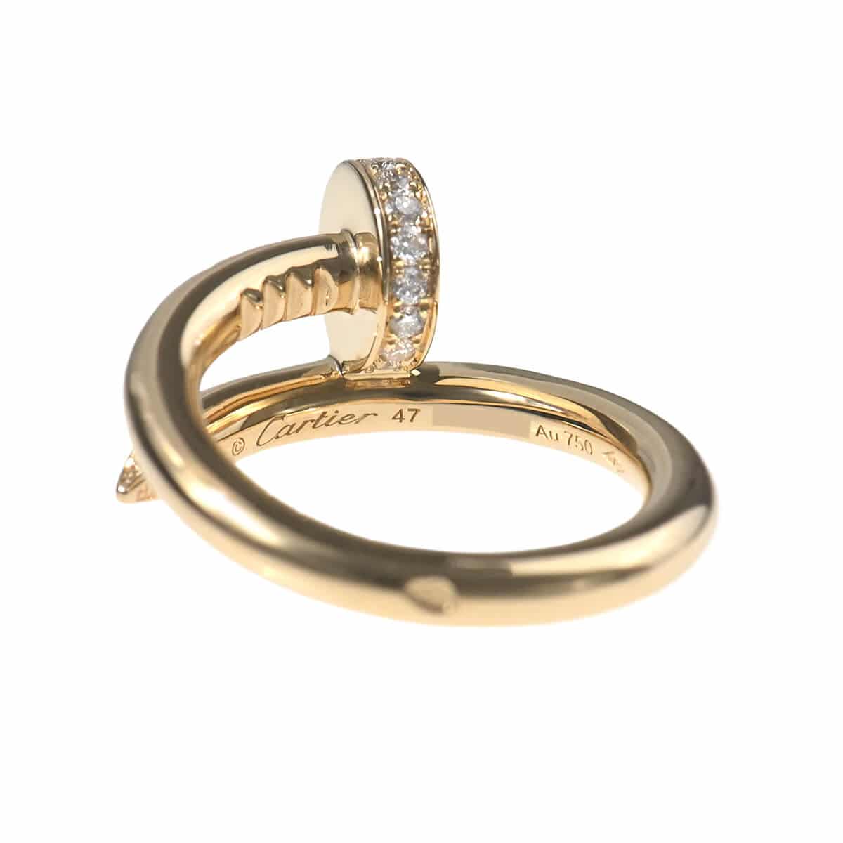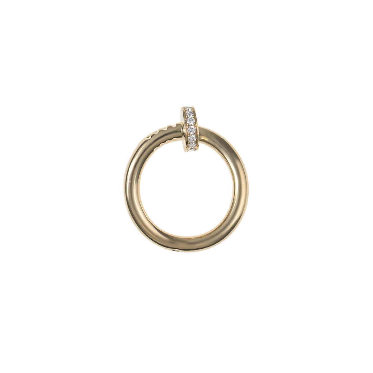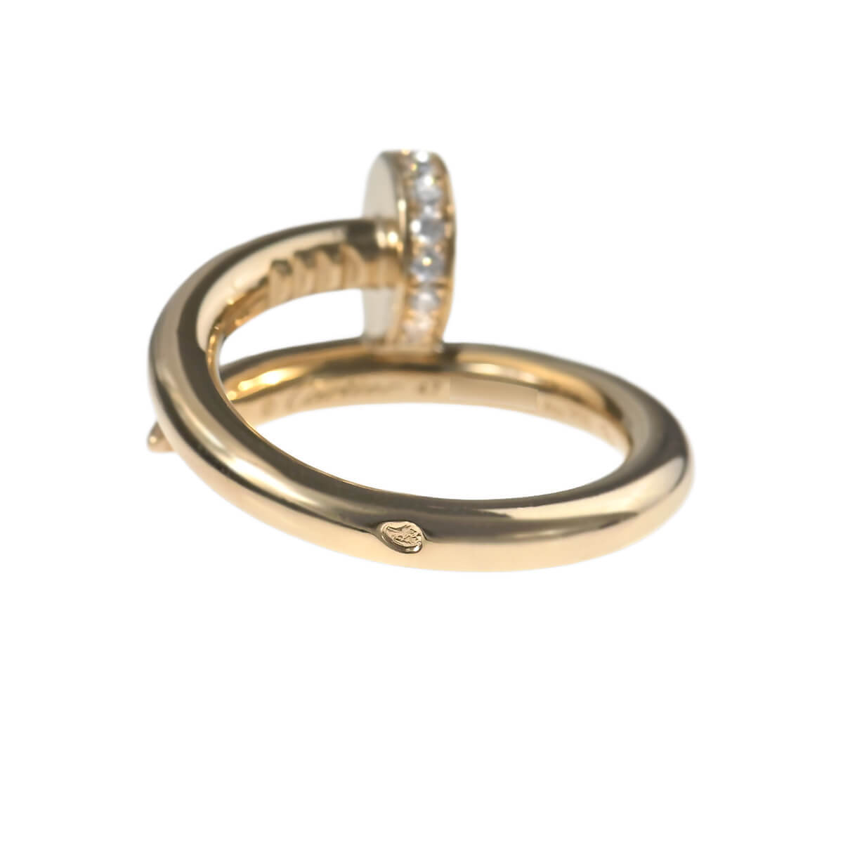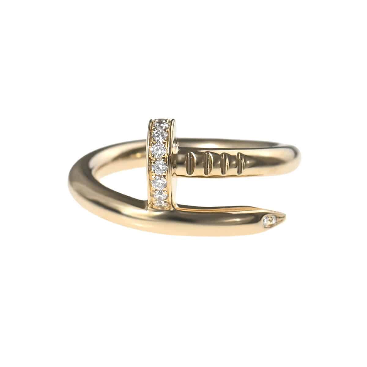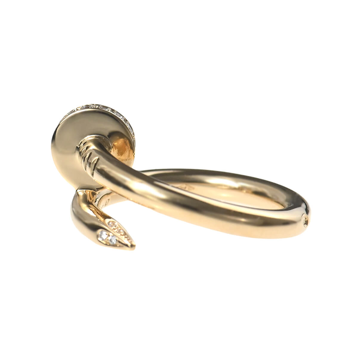 1970年代にニューヨークでデザインされた、1本の釘を意味する『Cartier(カルティエ)』「ジュスト アン クル」コレクション。釘がイメージさせる反骨精神、衝動やエネルギーがプレシャスマテリアルとシックなデザインで表現されたイエローゴールド製リングです。先駆的で大胆かつモダンなデザインに仕上げられた、カルティエの際立つ創作の力でジュエリーに姿を変えた釘をモチーフにしたリング。釘モチーフのヘッドまわりと先端にダイヤモンドをあしらった、計算しつくされた曲線デザインが、指先でカルティエらしい洗練された煌めく存在感を放ちます。