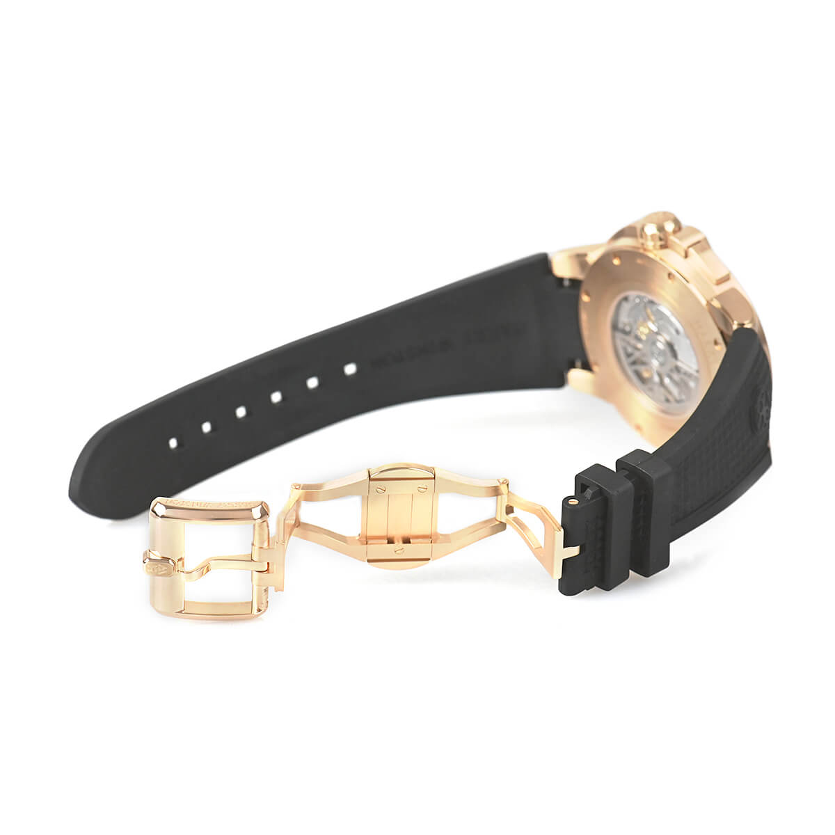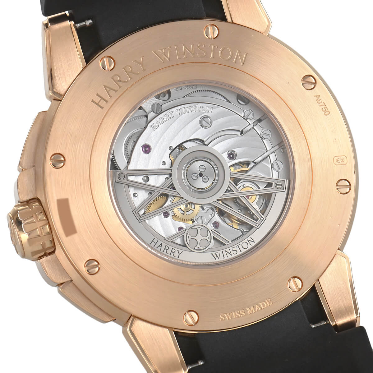 ローズゴールドケースの裏蓋はシースルーバックとなっておりますので、丁寧に仕上げられた自社製キャリバー「HW3502」がご覧頂けます。