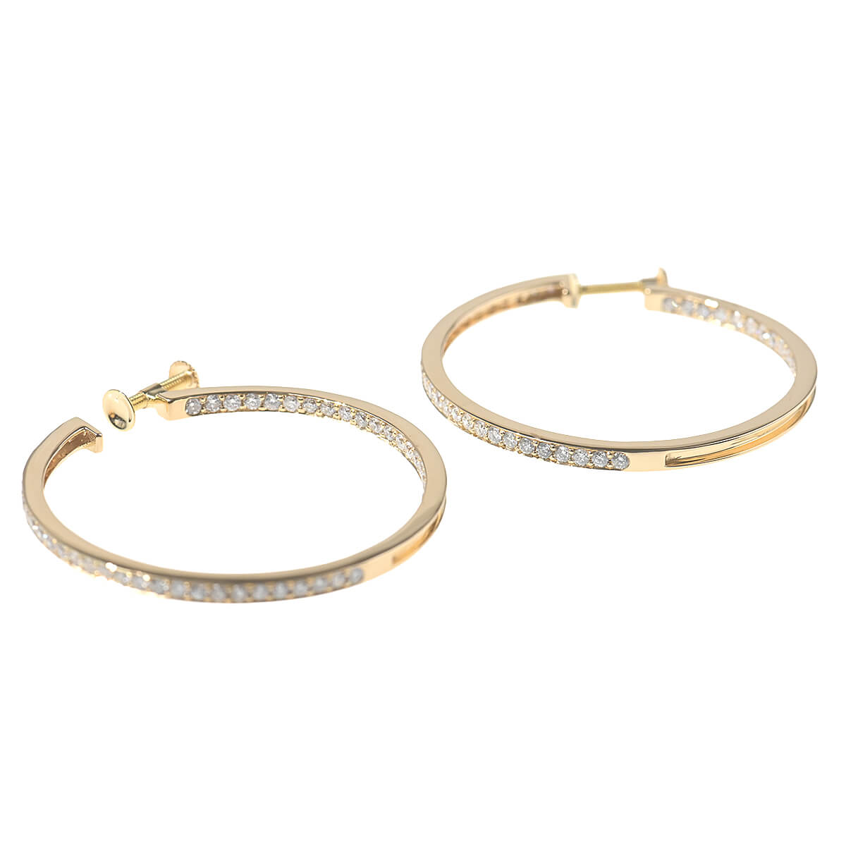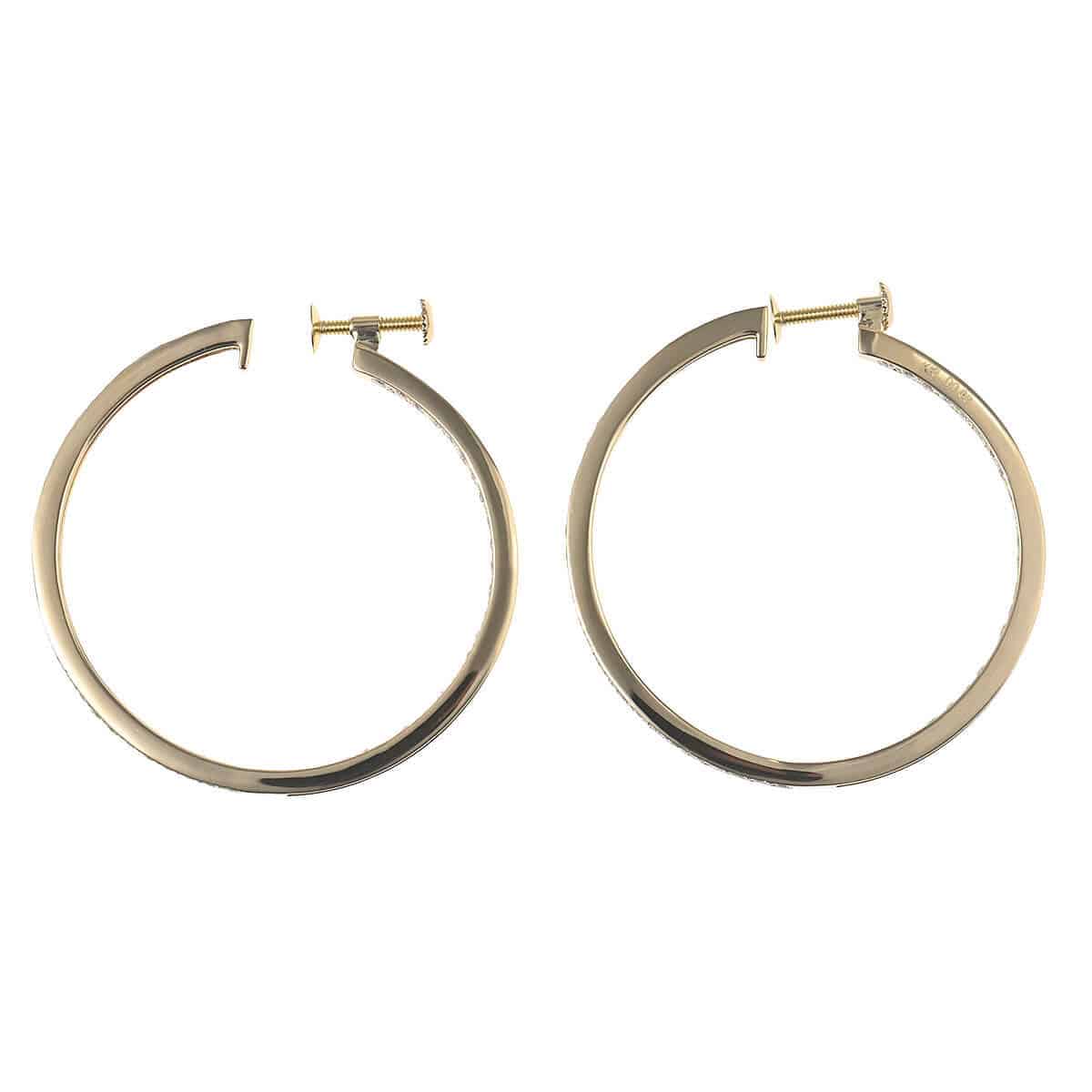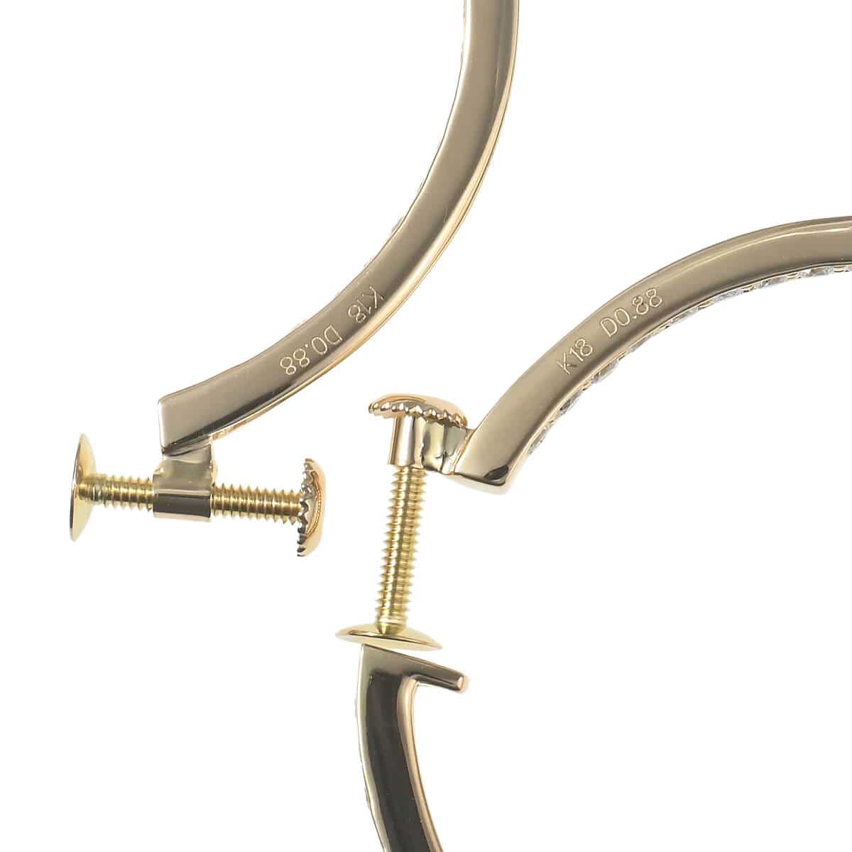 それぞれ0.88ct、トータル1.76ctものダイヤモンドのきらめきで描かれたフープが、フェイスラインを飾るイエローゴールド製イヤリングです。正面から見えるフープの裏側にまでダイヤモンドがあしらわれた美しいこだわりと、シンプルであるからこそ引き立つ洗練された美しさをもつイヤリング。耳元で光を放つダイヤモンドラインが日常にさりげなくも本物の煌めきを添えてくれる、エレガントで優美なダイヤモンドジュエリーです。