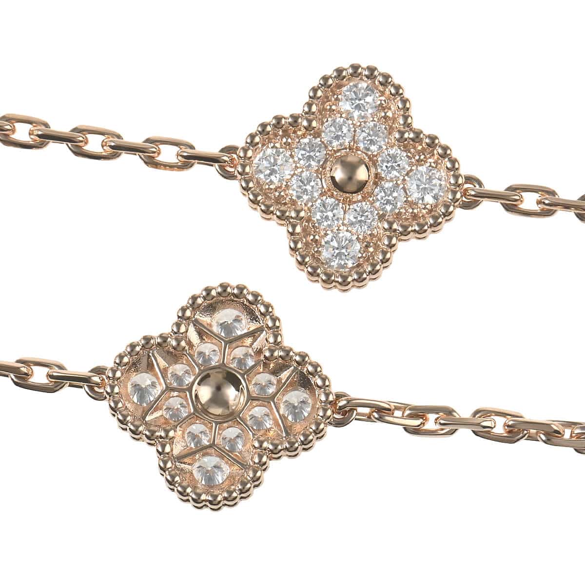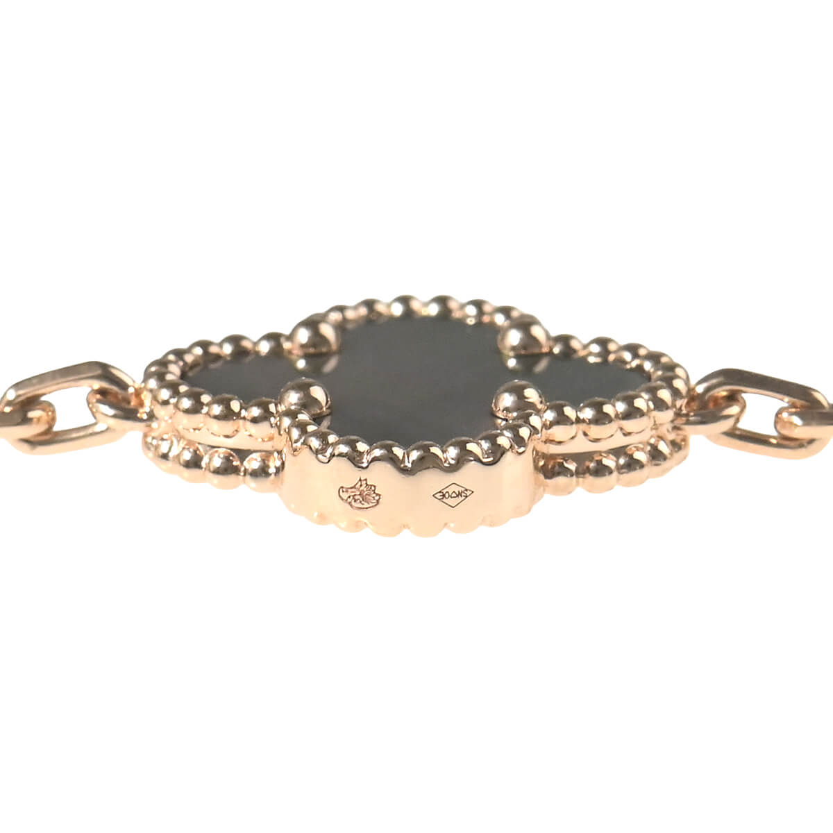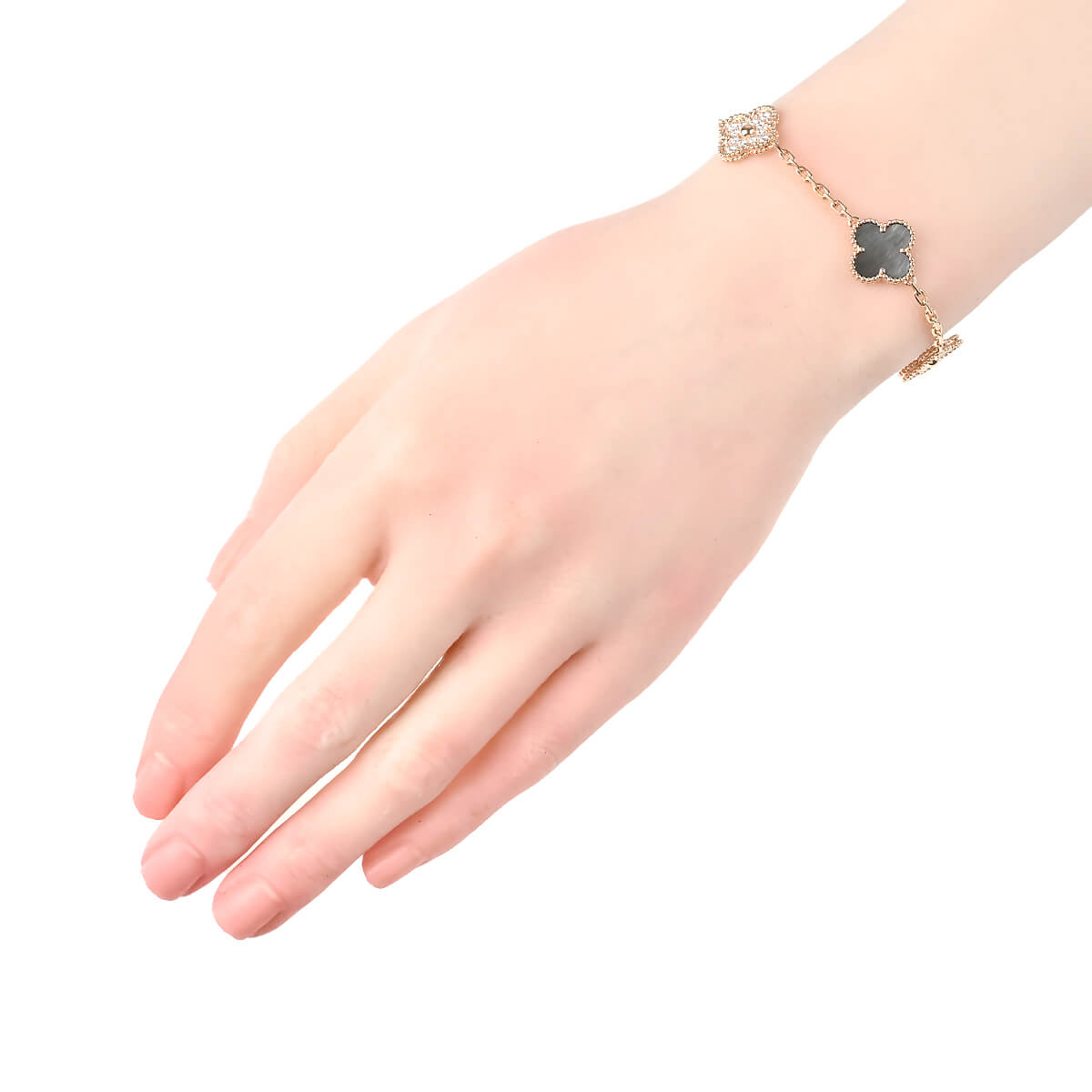 1968年に初めて誕生した幸運のシンボル「アルハンブラ」の特徴を受け継ぎ、『VanCleef&Arpels(ヴァンクリーフ&アーペル)』ならではの独創性と時を超えるエレガンスを湛える「ヴィンテージアルハンブラ」コレクション。柔らかく優しげな光沢を放つグレーシェルと極上の煌めきを放つダイヤモンドのクローバーが交互にあしらわれた、「ヴィンテージアルハンブラ」ローズゴールド製ブレスレットです。独特の繊細さと果実を思わせるような温かみをまとったローズゴールドと、シルバーグレーのニュアンスをもつグレーマザーオブパール、そして極上の煌めきを放つダイヤモンドがこのうえなくエレガントで華やかなコントラストを魅せています。たくさんつけてもしつこくなく、むしろ“素敵”にまとまる、不思議な個性をもつアルハンブラコレクションの中でも、ミステリアスで上品な穏やかな光に満ちた、ひときわ目を引く存在感を放つ、特別感あふれるハイジュエリーです。