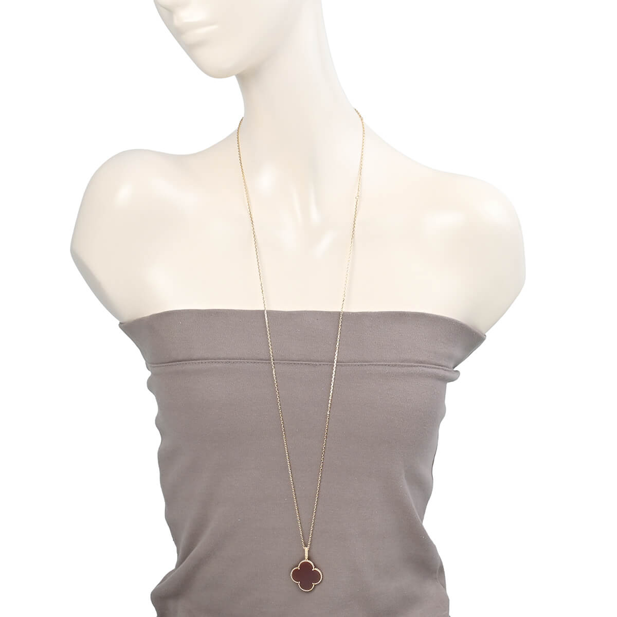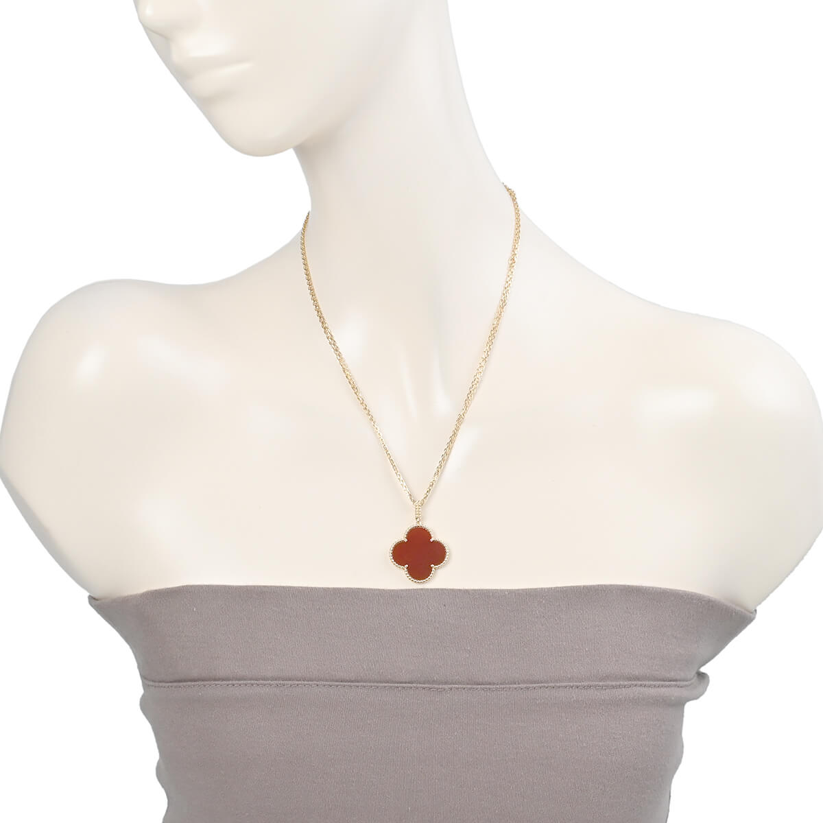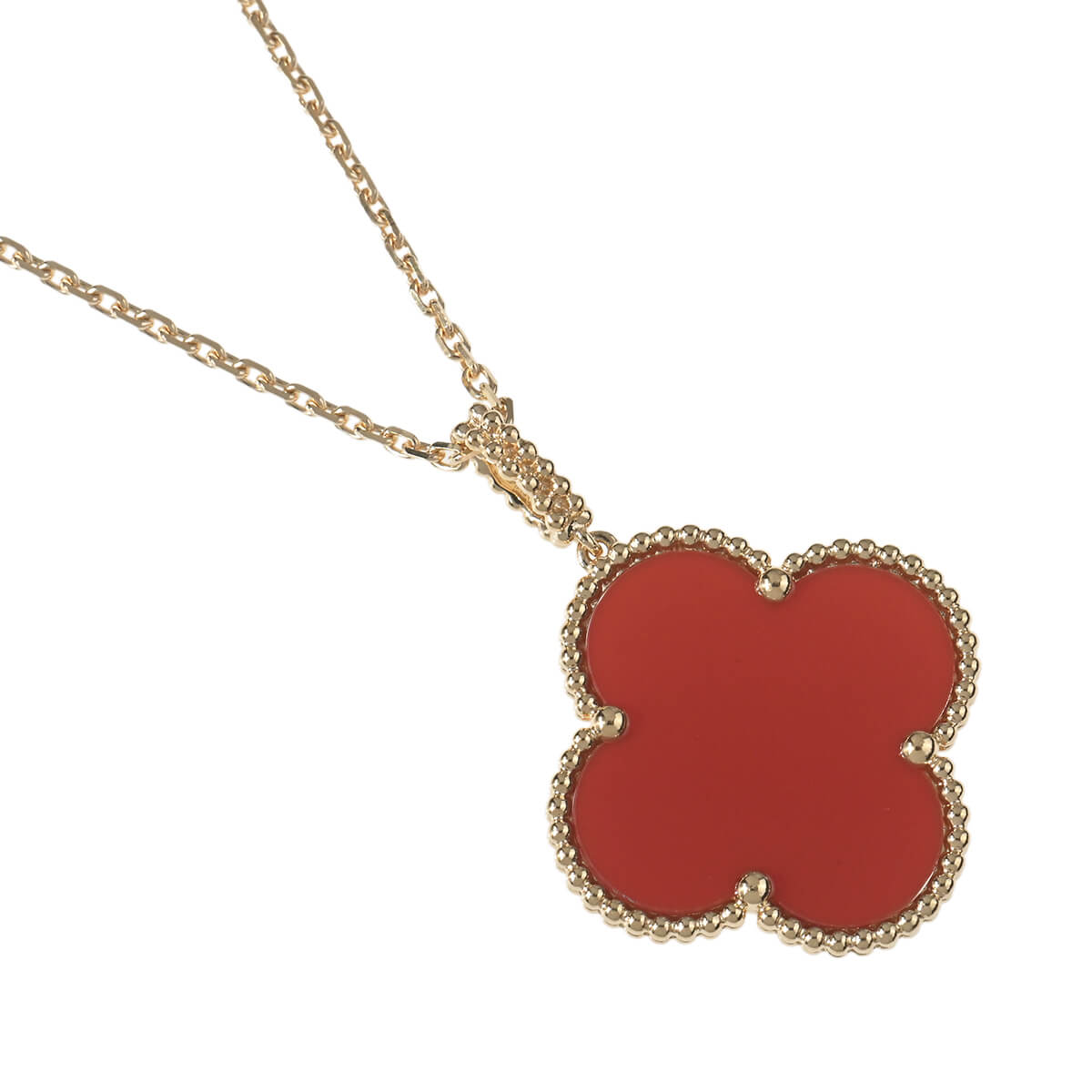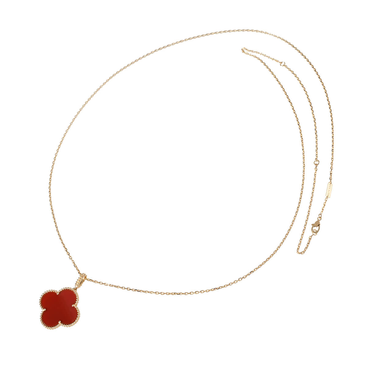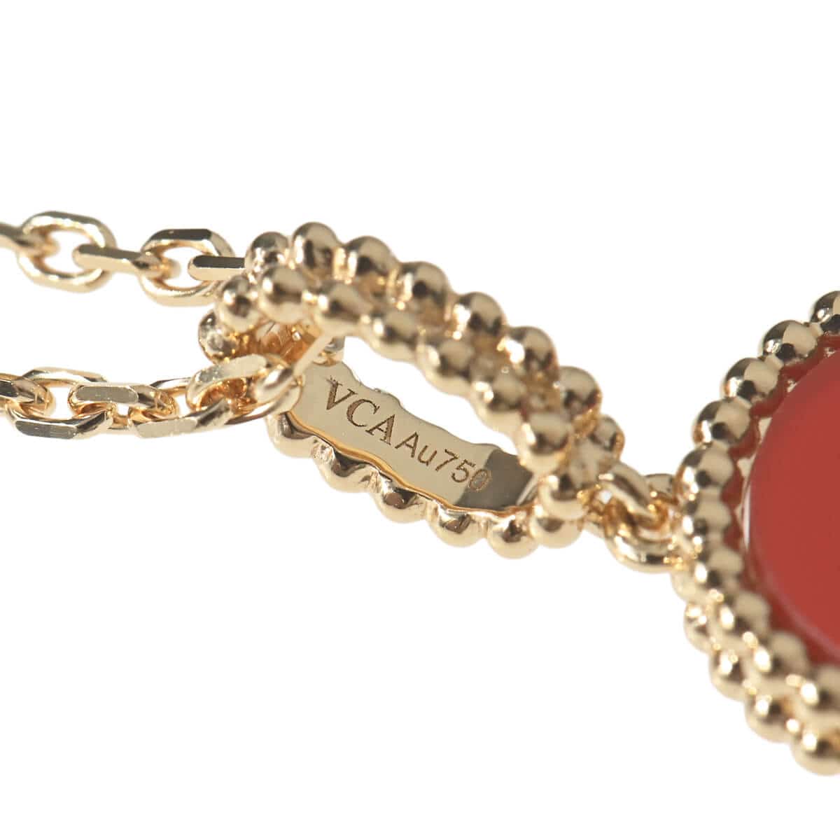 1968年に初めて誕生した幸運のシンボル「アルハンブラ」の特徴を受け継ぎ、『VanCleef&Arpels(ヴァンクリーフ&アーペル)』ならではの独創性と時を超えるエレガンスを湛える「ヴィンテージアルハンブラ」コレクションは、エレガントで清楚、控えめでありながら洗練された、メゾンを代表するアイコン。2006年にヴァンクリーフ&アーペルが新たに制作した「マジックアルハンブラ」は、さまざまなサイズのアルハンブラモチーフが作品に輝きと色彩をもたらし、楽しげなハーモニーを奏でる魅惑的なコレクションです。フェミニンなビーズに縁取られたアイコニックなカーネリアンのクローバーモチーフが、約90cmものロングチェーンにひとつあしらわれた、定番アルハンブラとは違う、ドラマティックな存在感たっぷりのペンダント。ひとめでそれとわかるラッキーチャームを、どのタイミングで、どのカラーで迎えるかを考えるのも楽しい、エレガントに映えるハッピーな魅力にあふれたコレクションジュエリーです。