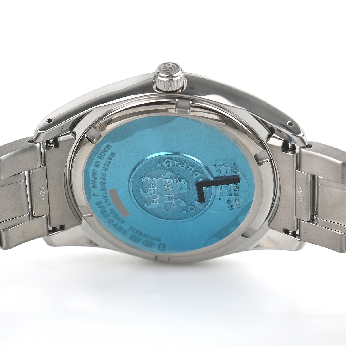 年差±10秒を誇るキャリバー9Fを搭載した「SBGX355」。スプリングドライブの故郷、諏訪地方から望む美しい北アルプスに降り積もる新雪をイメージした文字盤が特徴で、セイコーが得意とするブライトチタンをケース素材に採用したこだわりの一本。
