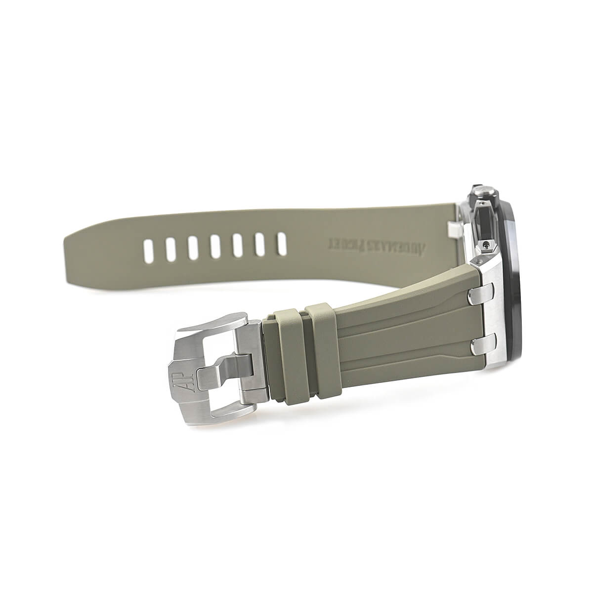 43mmのボディーで堂々と存在を主張する「ロイヤルオーク オフショアクロノグラフ」。こちらはスモークライトブラウン文字盤に、ラバーベルトも同色で合わせたモデルです。