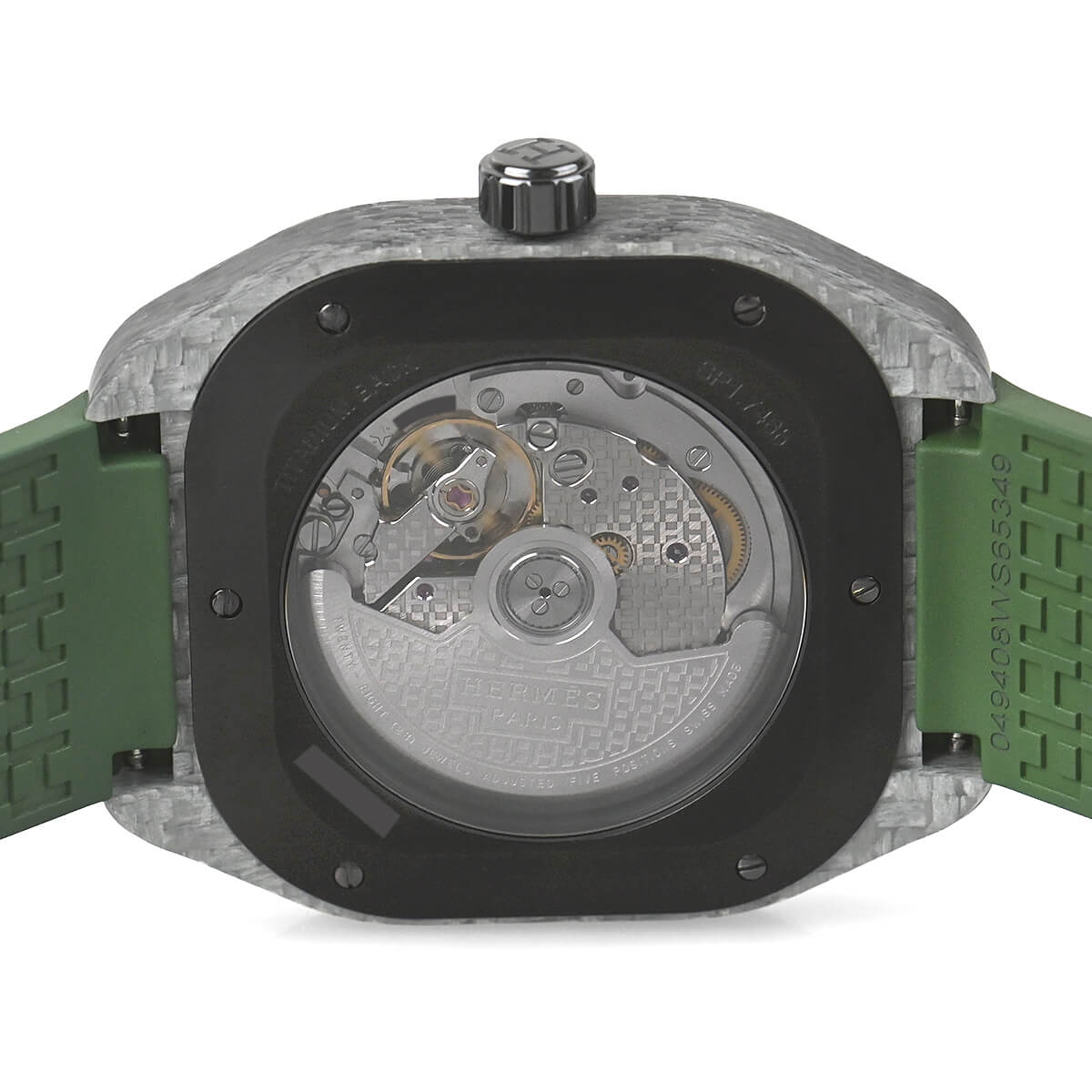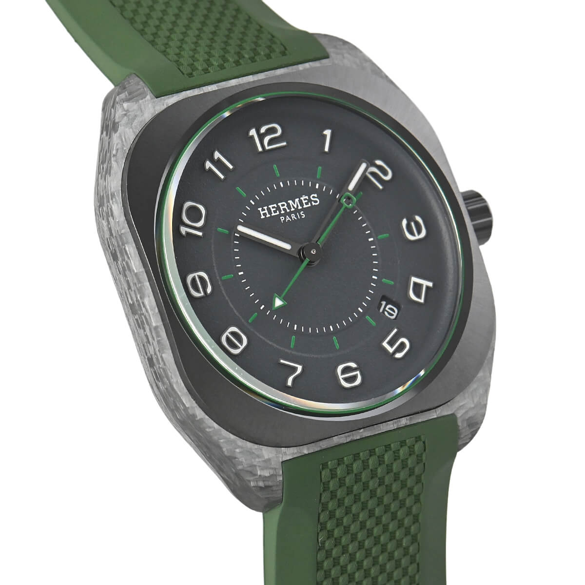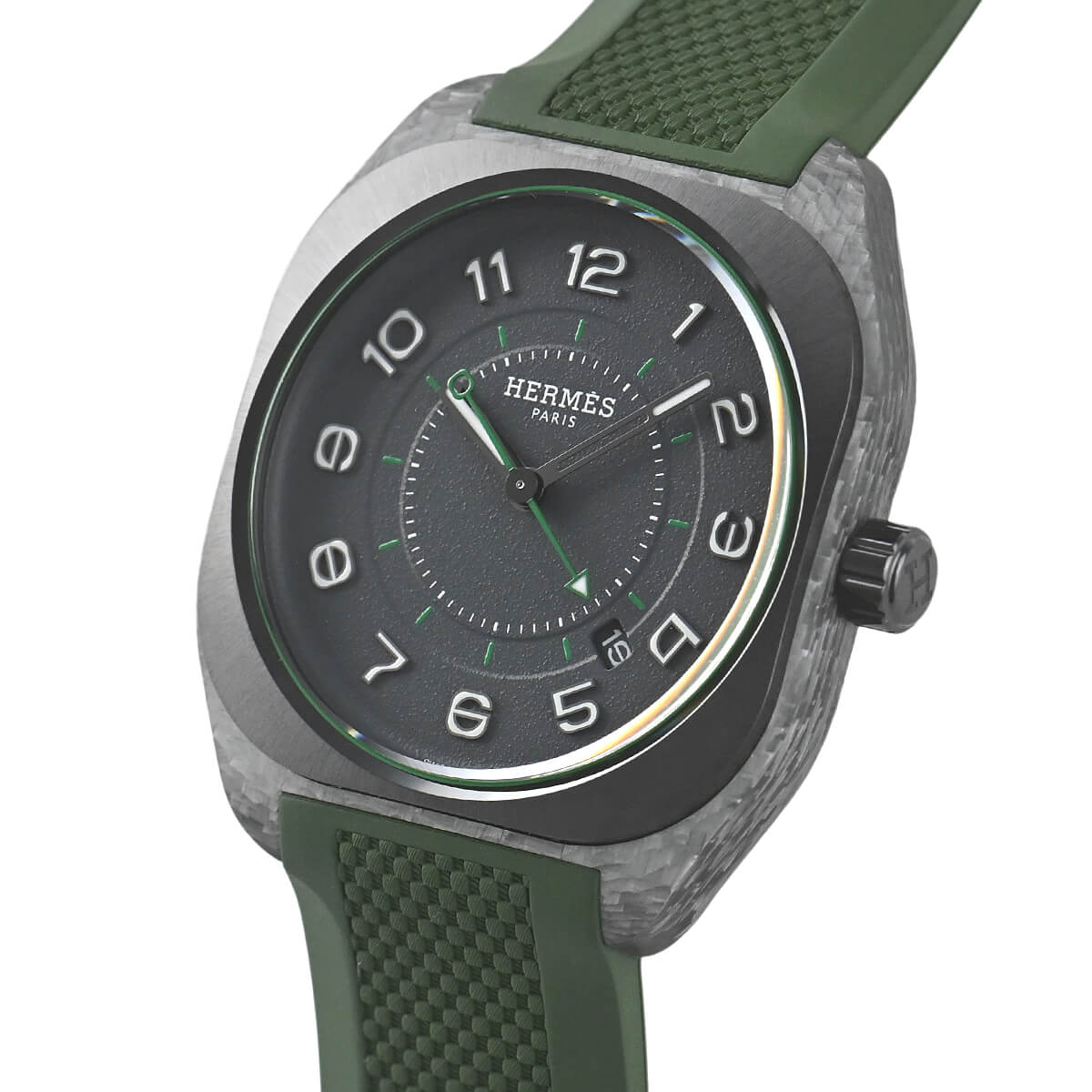 ガラス繊維複合素材(グラスファイバーとアルミニウム)のケースにセラミックベゼルを組み合わせた「エルメス H08」のXLサイズが入荷しました。ムーブメントはパワーリザーブ約50時間の自社製Cal.H1837を搭載。