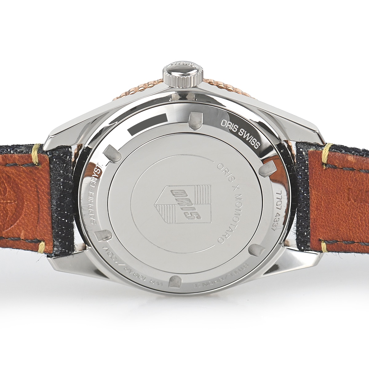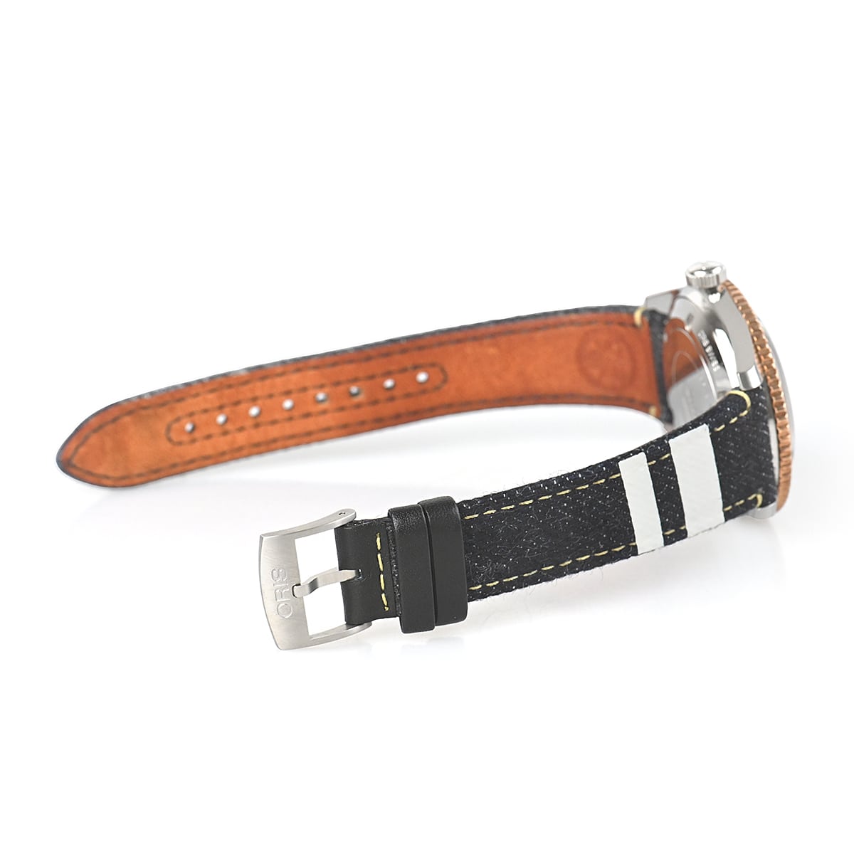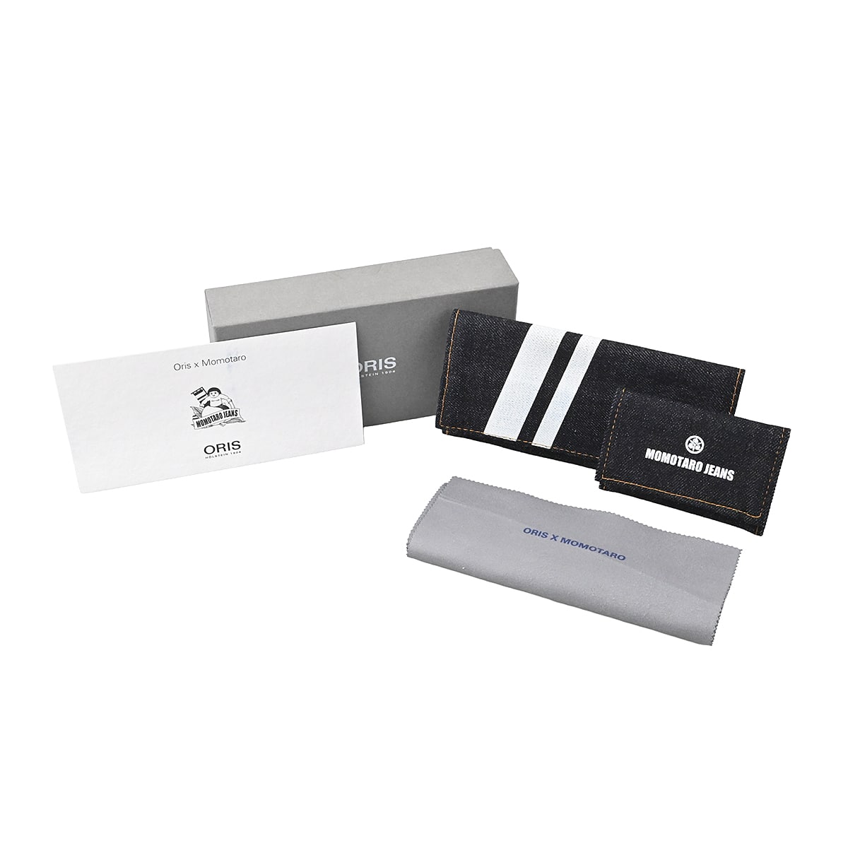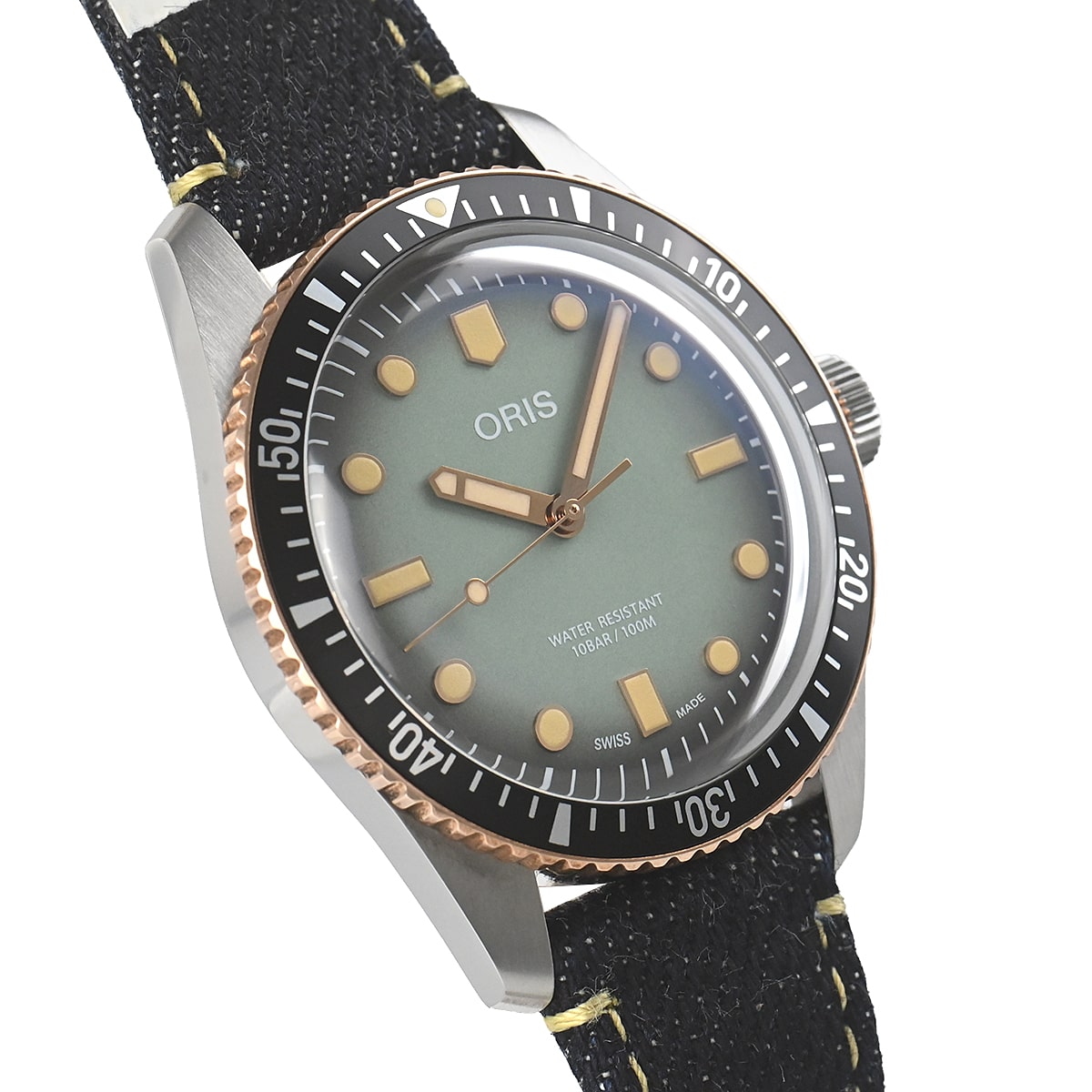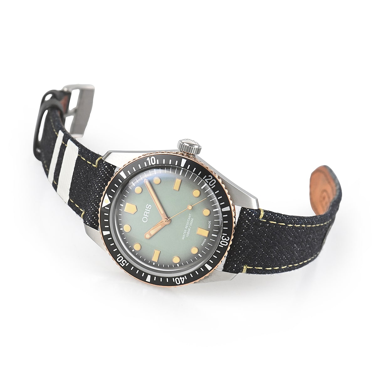 オリスと「桃太郎ジーンズ」のコラボレーションウォッチ「ダイバーズ65 オリスx桃太郎 特別モデル」。人気モデルの「ダイバーズ65」のステンレス+ブロンズタイプに、インディゴ染めのデニムストラップに桃太郎のシンボルである二本線をあしらったベルトをセットしました。