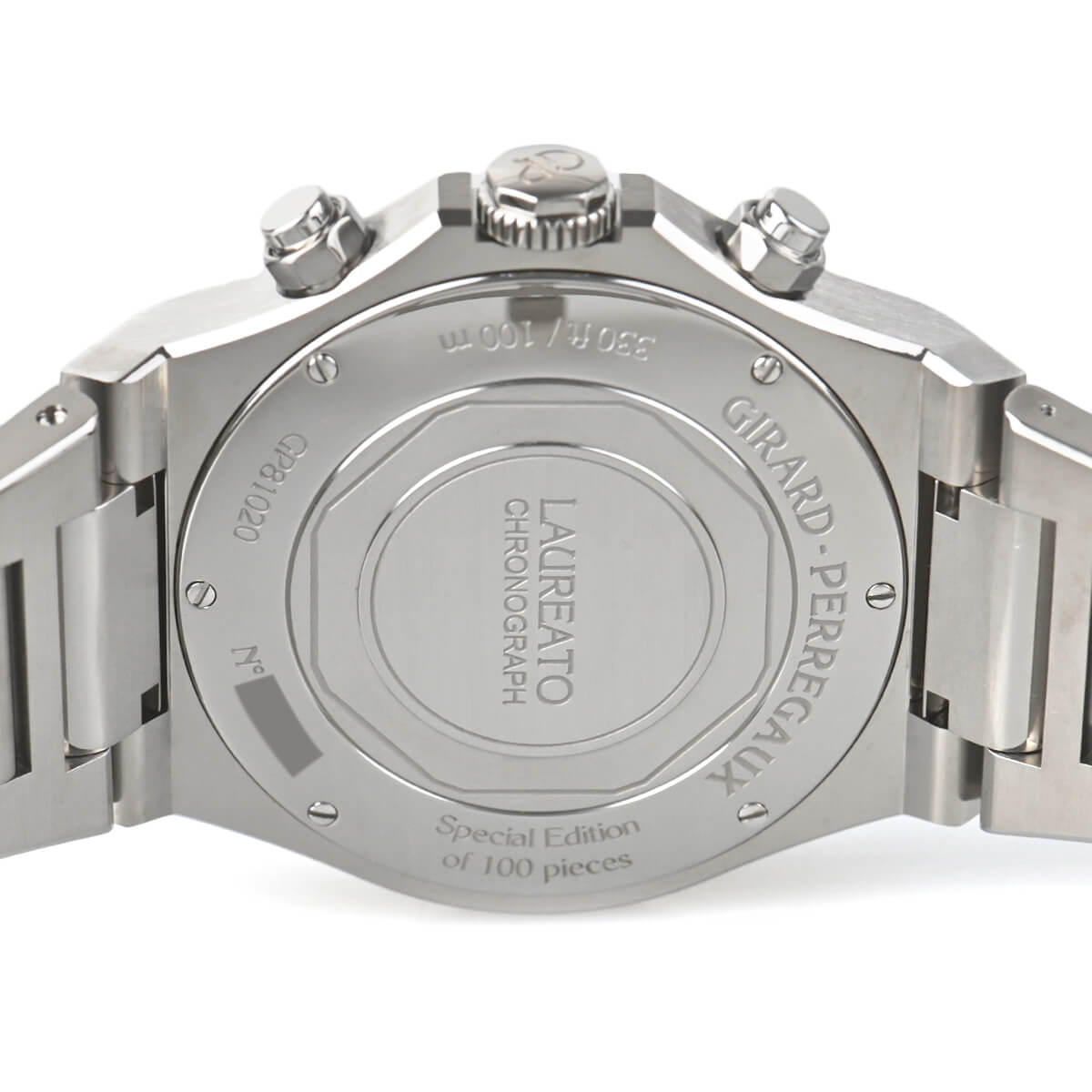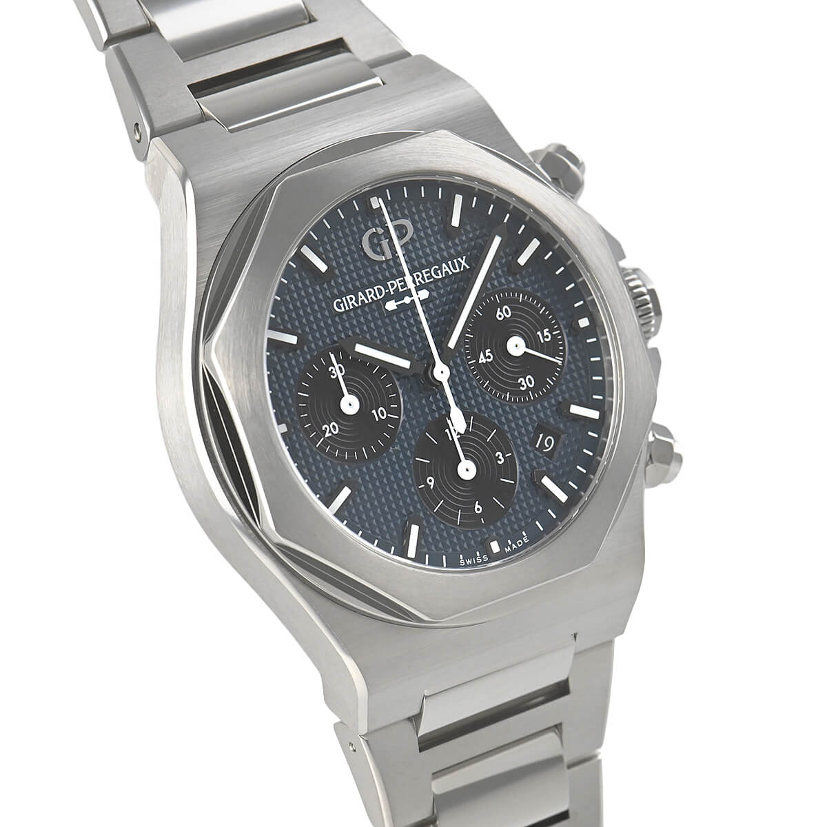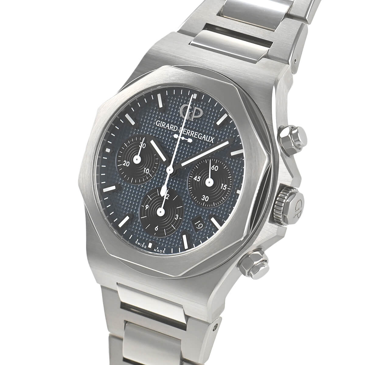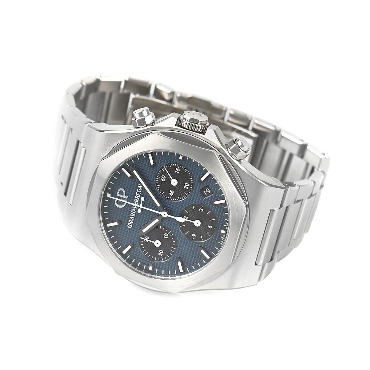 ブルーカラーの文字盤には一つ一つが小さなピラミッド型を成すクル・ド・パリ装飾が施されていて、46時間パワーリザーブの自社製クロノグラフキャリバーGP03300が搭載されています。