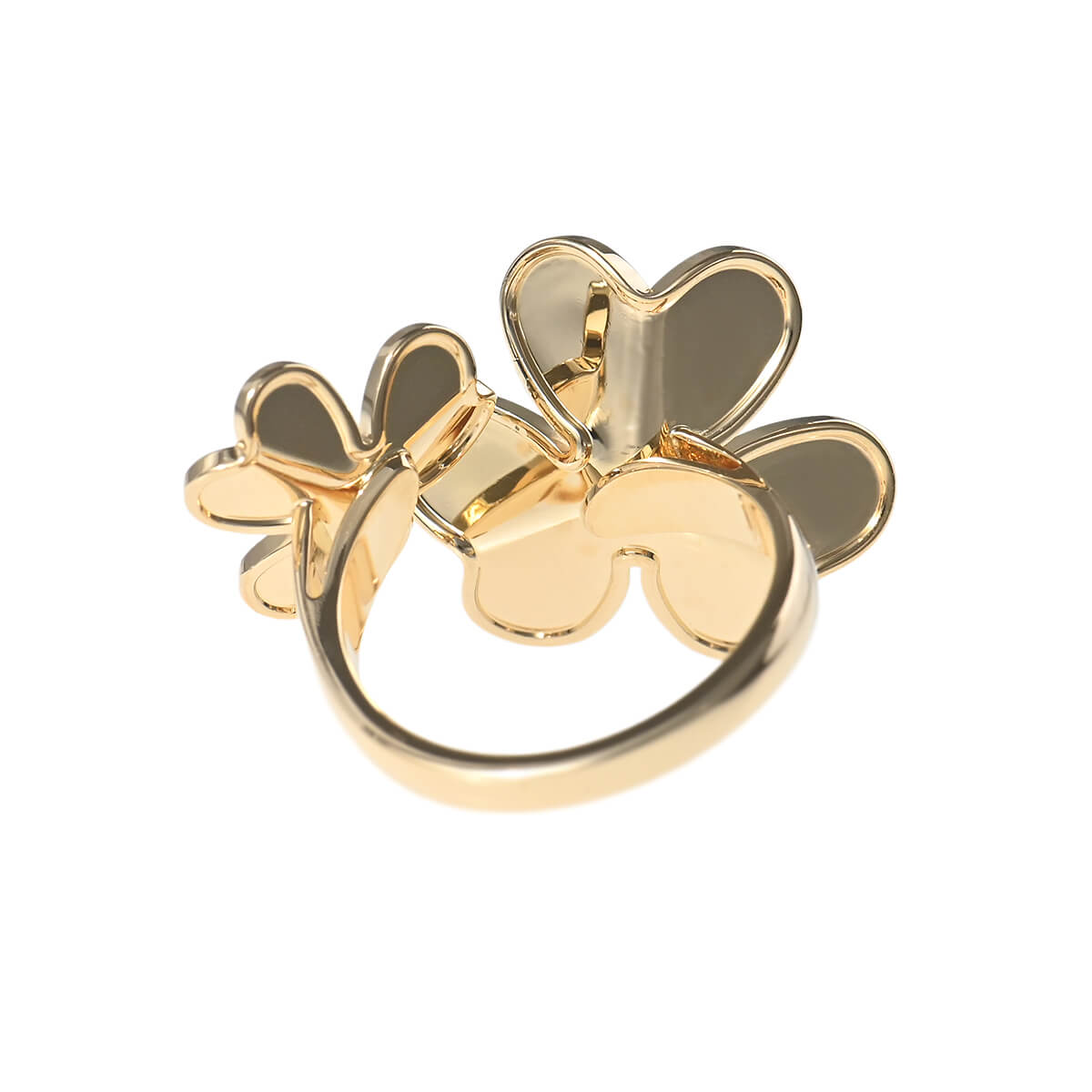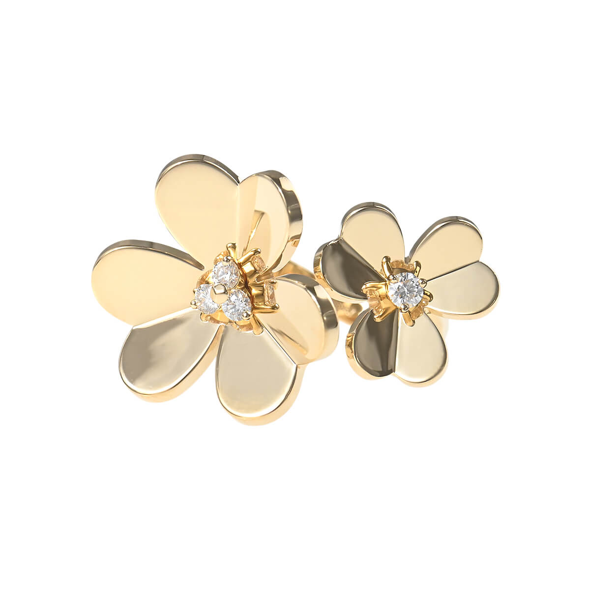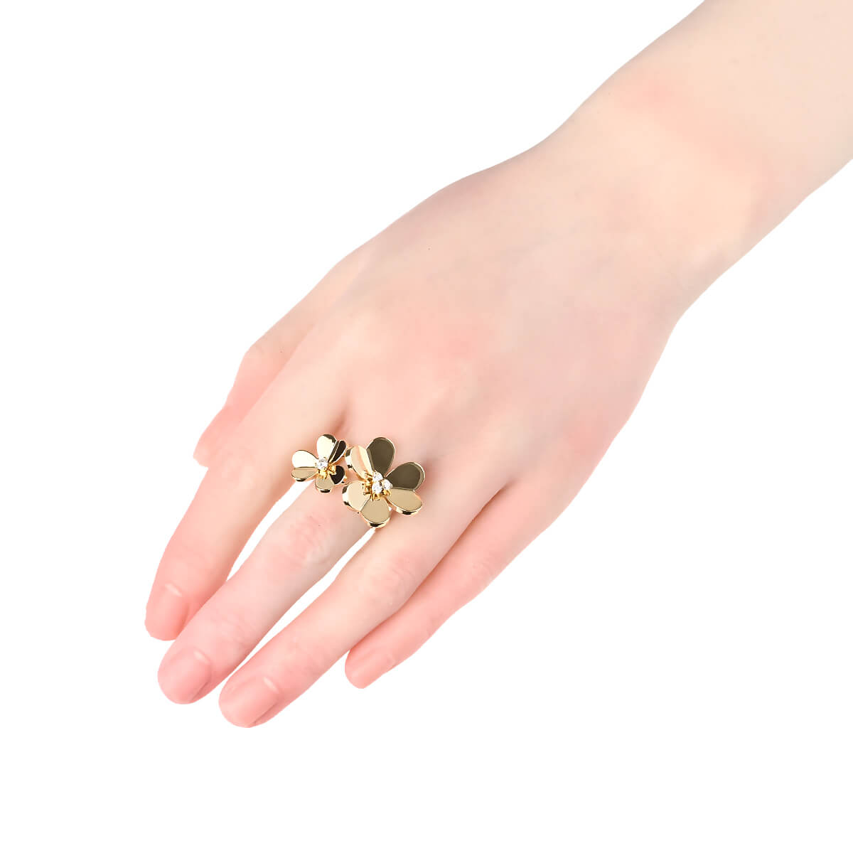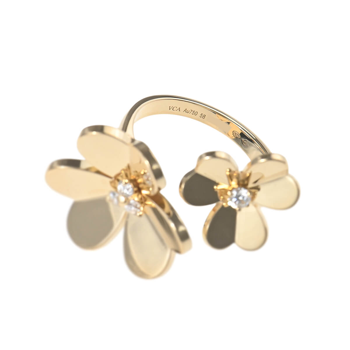 そよ風の中で花々が踊るように、グラフィカルに、軽やかに輝く『VanCleef&Arpels(ヴァンクリーフ&アーペル)』の「フリヴォル」コレクション。心安らぐ愛らしい自然の形を詩的に表現したグラフィカルなハート型の花びらが愛らしい、「フリヴォル」フラワーがふたつあしらわれた、イエローゴールド製アントレレドアリングです。つけると指と指の間にモチーフが出るアントレレドアリングは、個性的な指輪のつけ方を提案したヴァンクリーフの名作。フリヴォルフラワーの花びら一枚一枚をメゾンの研磨職人が特別な技法で丁寧に磨き上げ、真ん中にあしらわれたダイヤモンドの煌めきとあいまって、まるで鏡のようにまばゆく輝くお花を咲かせています。絶え間なく再生を繰り返す花々が、いつも新たな魅力を生み出す、ヴァンクリーフの“フローラ”コレクション。フェミニンでエレガントに咲き誇る、「フリヴォル」フラワーの存在感は格別です。