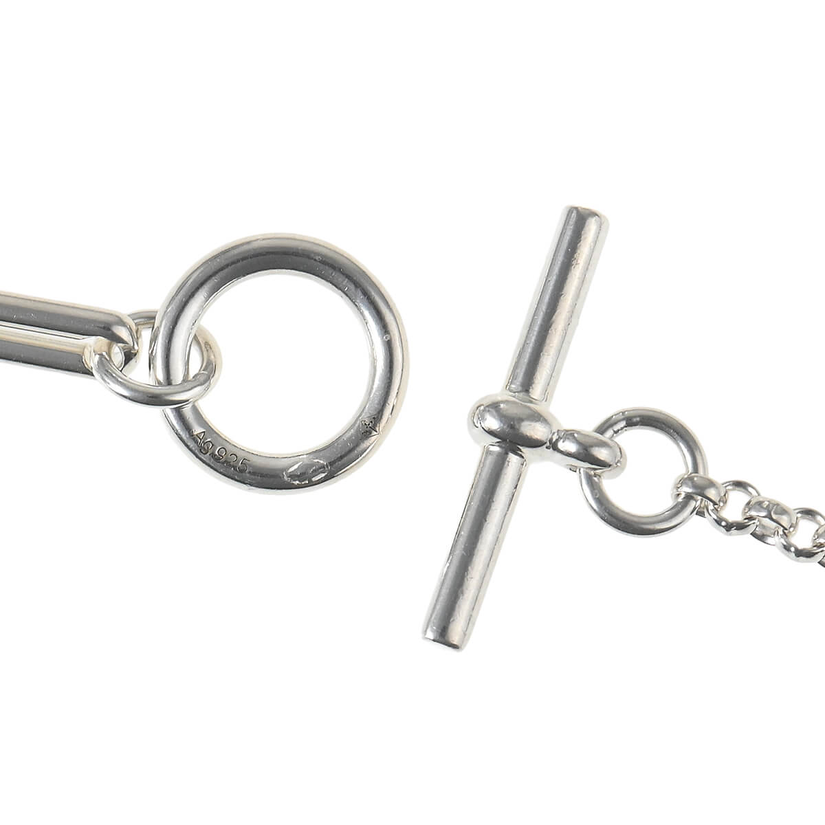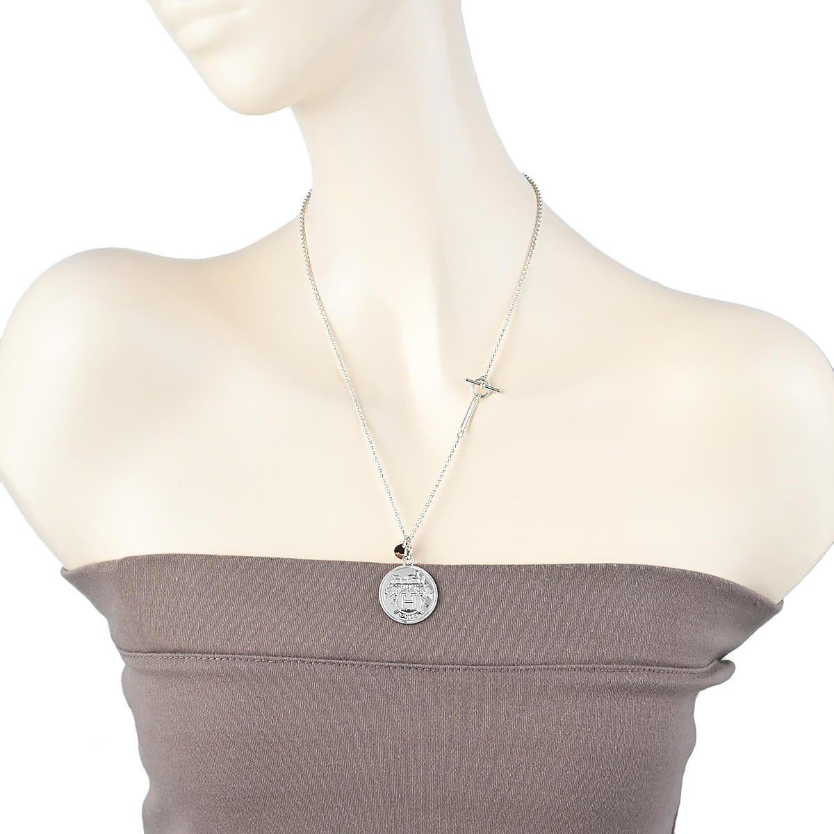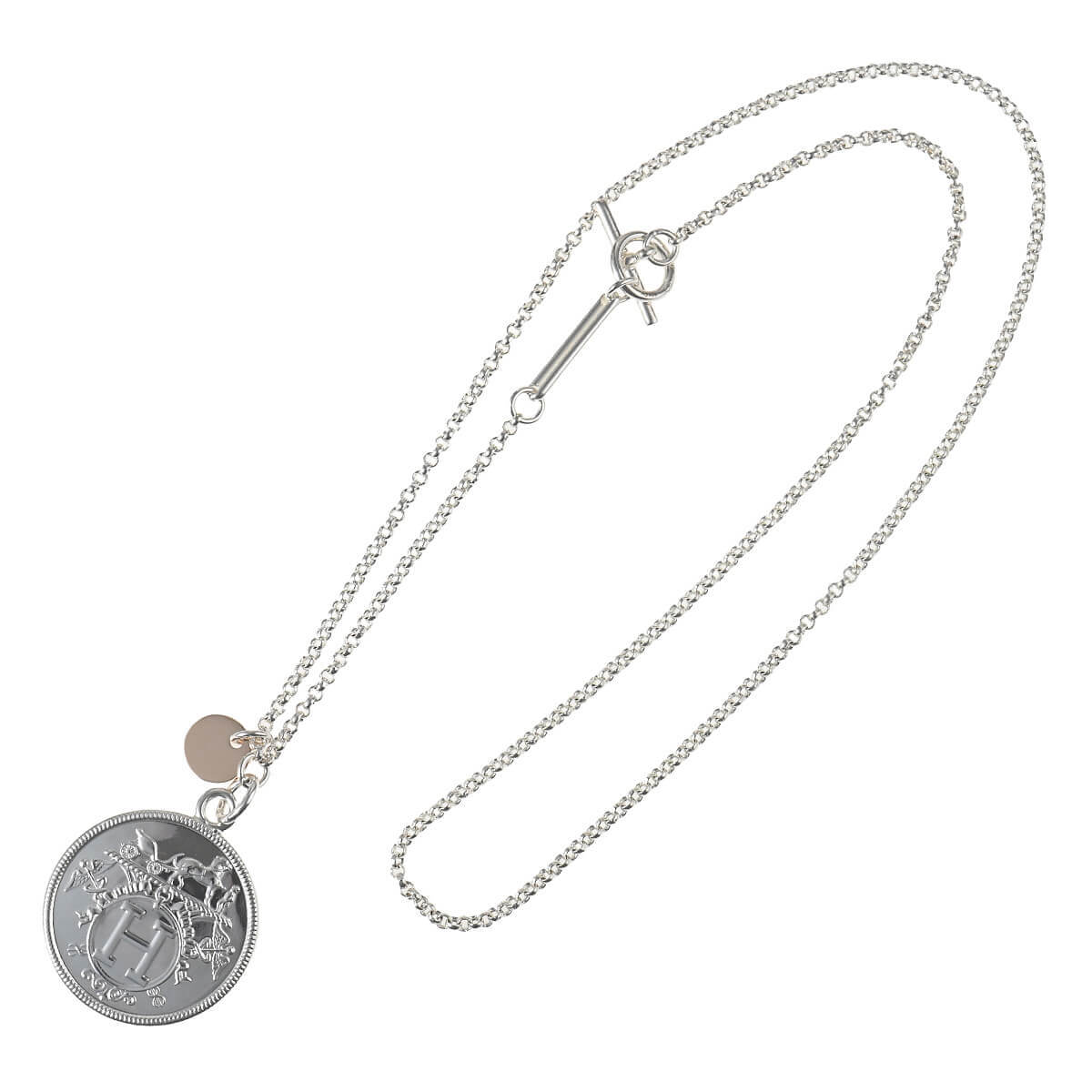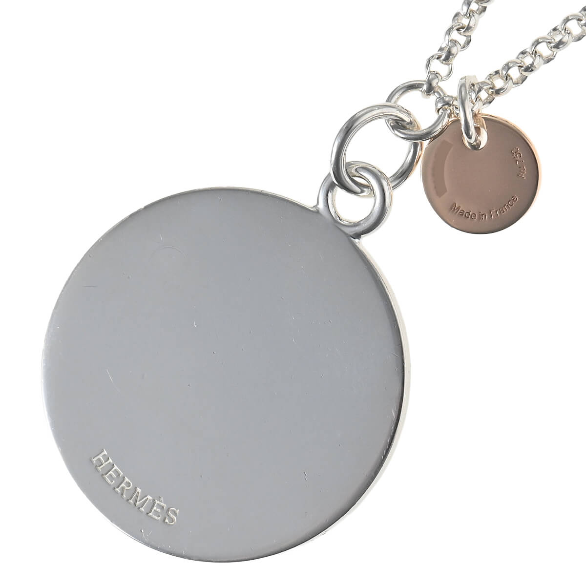 1837年、パリでティエリ・エルメスが高級馬具の製造工房として創業し、職人によるものづくりとそれに関わるすべての人を大切にするという価値観を守り続けている、歴史ある世界的ブランド『HERMES(エルメス)』。本の所有者がわかるように本の見返しなどに貼る小紙片、“蔵書印”の意味を持つ「エクスリブリス」コレクションのネックレスです。一般的に名前や標語、シンボルなどが図案化される“蔵書印”をモチーフにしたシルバーのラウンドモチーフには、エルメスのロゴマークとして知られる“デュック(主人が自身で馬を御す馬車)”と“従者”、それにブランドの頭文字“H(アッシュ)”が描かれています。ブランドがひと目で分かるものの、図案としての完成度の高さは流石エルメス。大胆なフォルムと洗練された存在感でスタイリングをお洒落に、エレガントに印象づける、エルメスらしいジェンダーレスなジュエリーです。