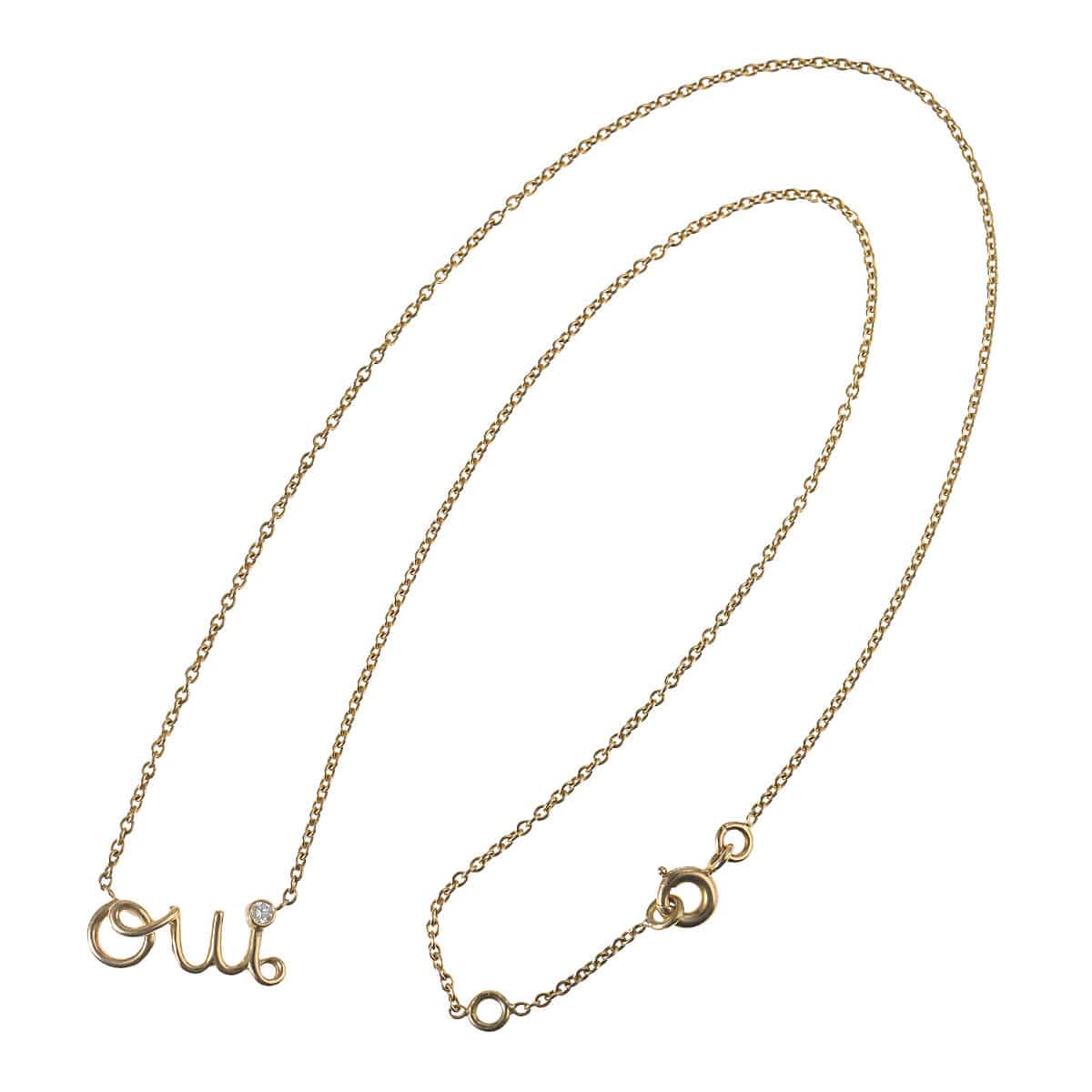 1946年の創業以来、フランスを代表するオート・クチュールメゾンとしてトップに君臨し、いまも革新をもって進化し続ける世界で最も愛されている老舗一流ブランドのひとつ『Dior(ディオール)』。パリ宝飾界の歴史に残るドラマチックなストーリーを持つ、数々のジュエリーコレクションがあるメゾンでもあります。diorのファインジュエリー部門アーティスティックディレクターである、ヴィクトワール・ドゥ・カステラーヌが手掛けた代表的な「Oui」コレクションのイエローゴールド製ネックレス。フランス語で“イエス”を意味するポジティブなメッセージを1本のゴールドの糸で綴ったようなモチーフに、一粒のダイヤモンドが煌めきを添えています。“自分自身への肯定”や“自分の人生に対するYES”という自由でポジティブな意味が込められた“Oui”がお洒落な存在感でデコルテを彩るディオールらしいファインジュエリーです。