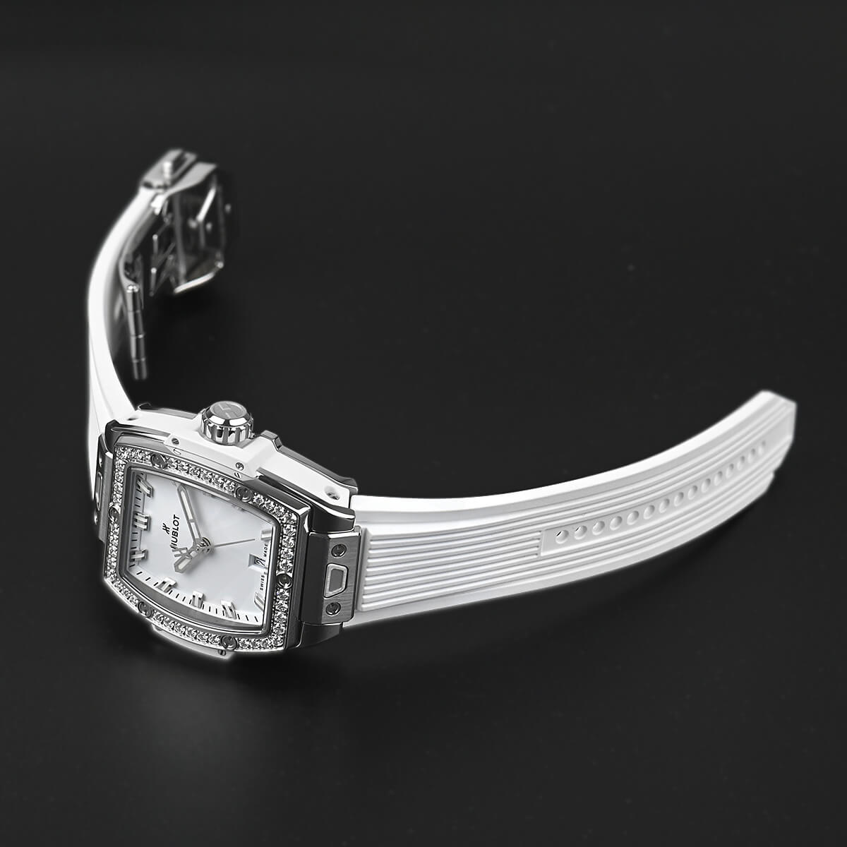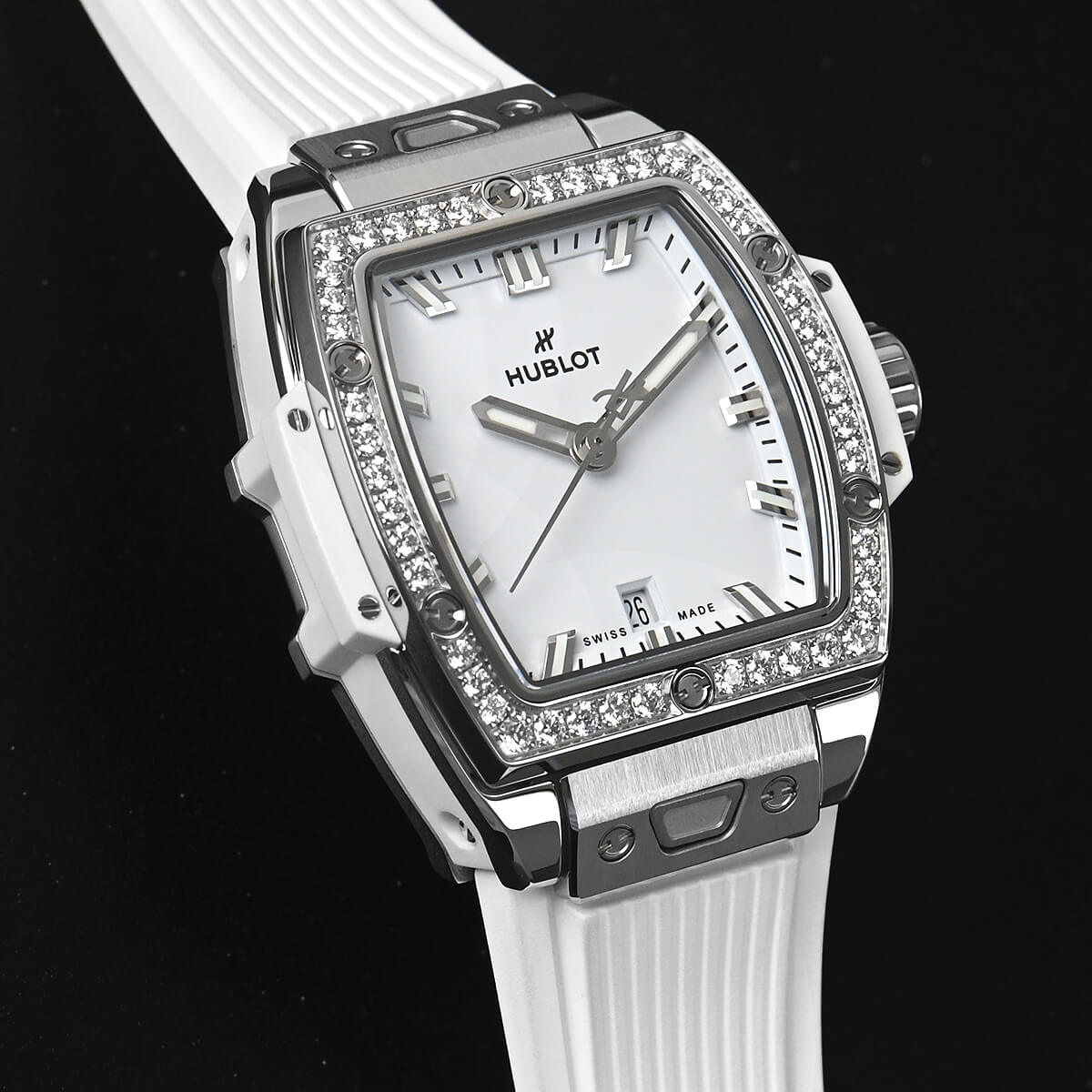 ベゼルにはダイヤモンドセッティングが施されており、腕もとを華やかに彩ります。