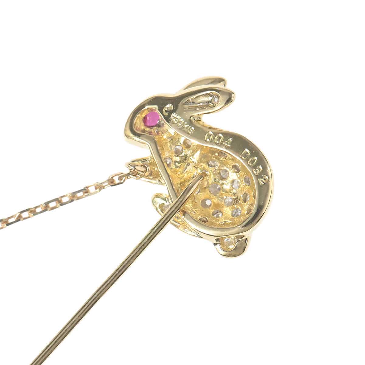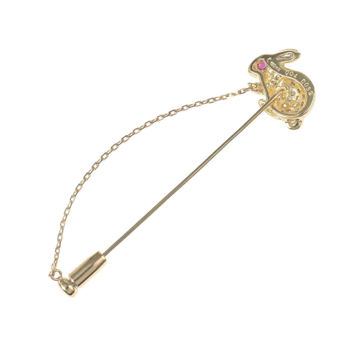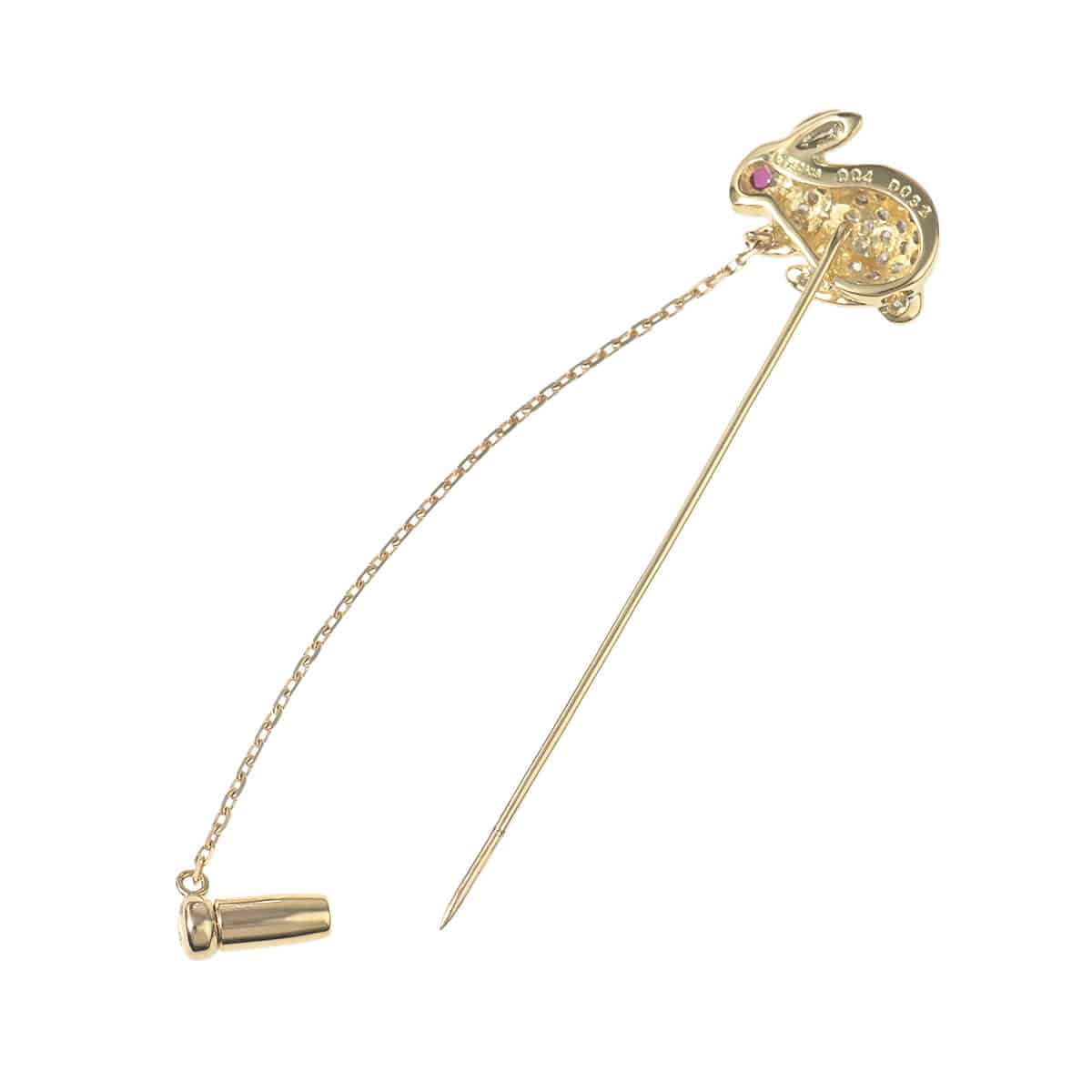 目にルビーがあしらわれた愛らしいフォルムのウサギを先端に飾った、イエローゴールド製スティックピンブローチ。ウサギにセッティングされたダイヤモンドの土台にはロジウムコーティングが施され、ストーンひと粒一粒が美しく際立ち、眩い輝きを放ちます。大人の遊び心とエレガンスが感じられる、愛らしくも洗練された個性を感じるピンブローチはユニセックスに。自分だけの個性を楽しみながら、日々のスタイリングのアクセントに活躍してくれそうですね。