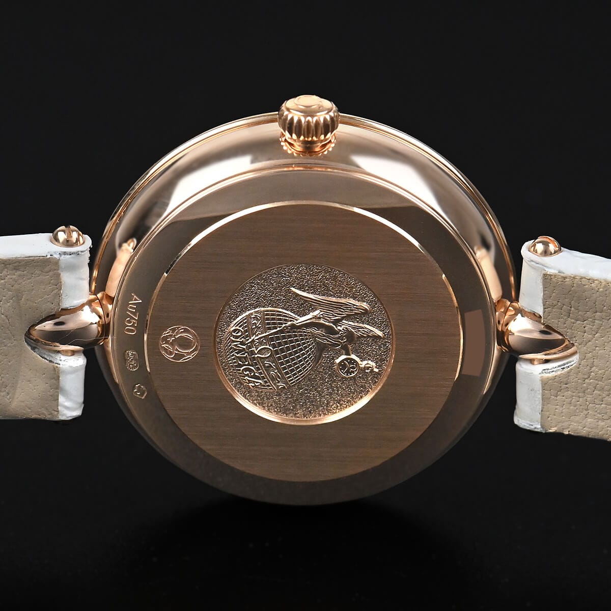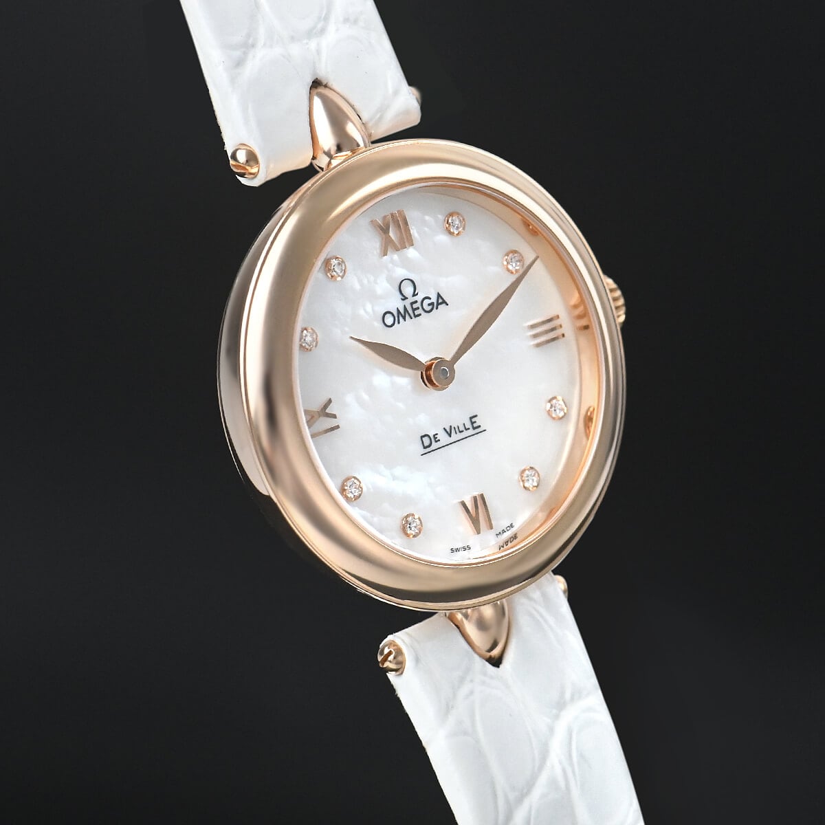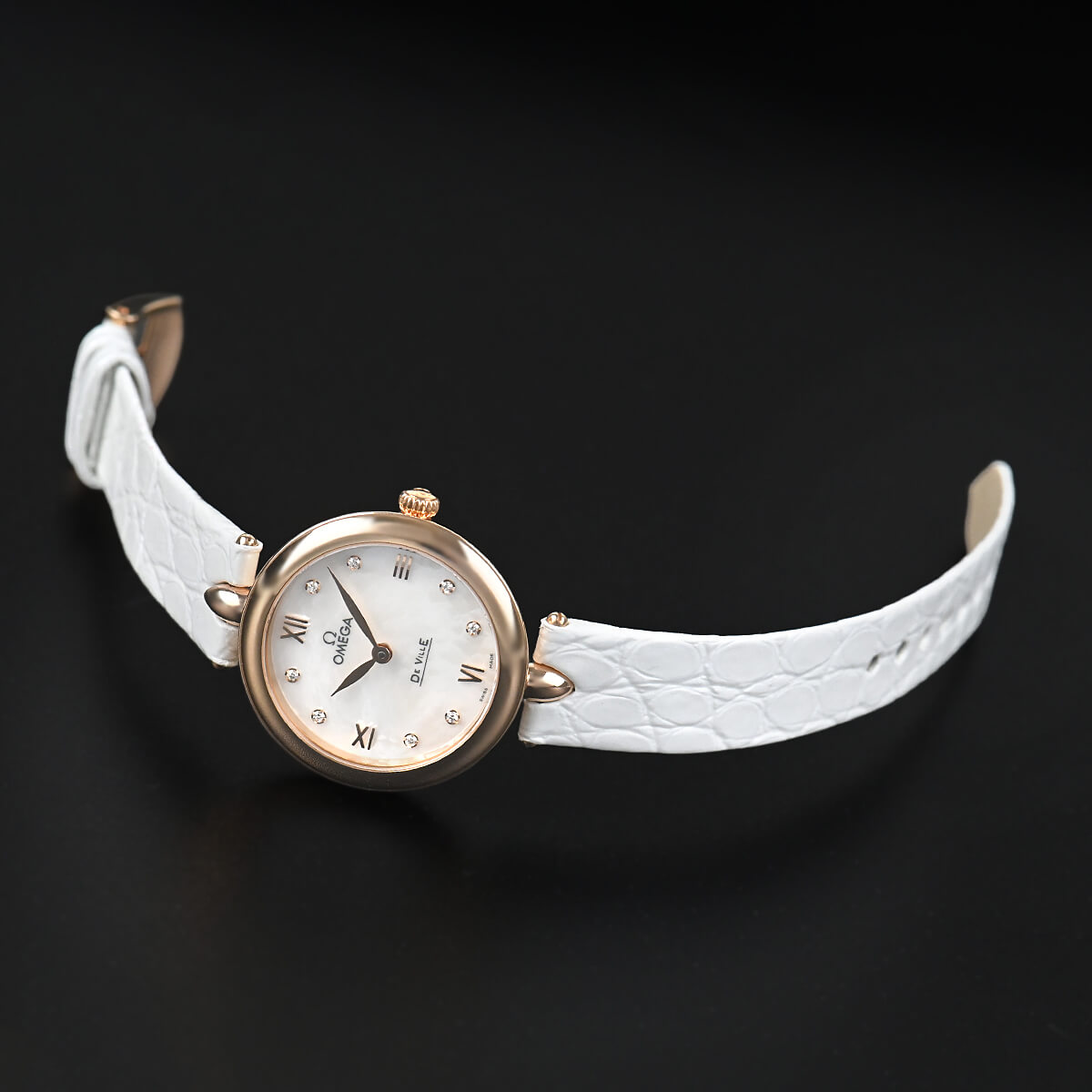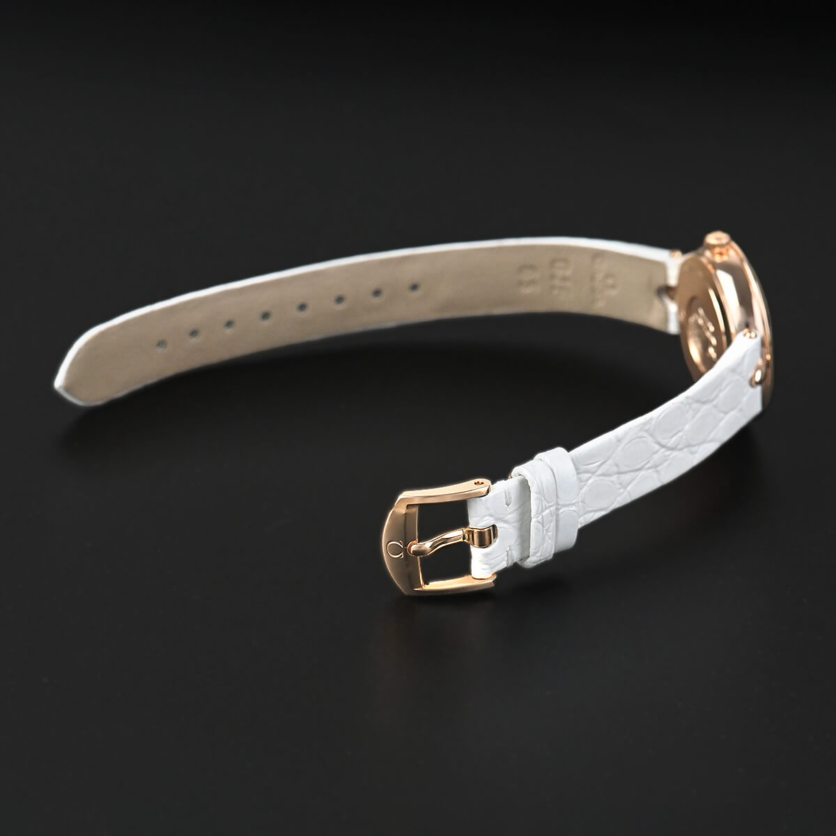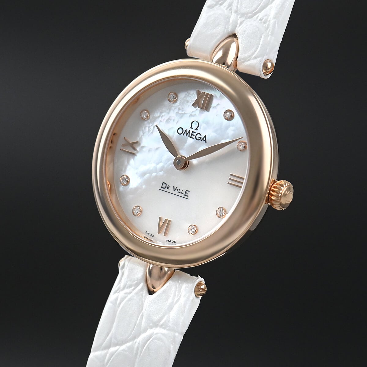 これまでのデ・ヴィル・コレクションにロマンティックでフェミニンな雰囲気を加えた【デ・ヴィル プレステージ デュードロップ】。直径27.4mmのケースを採用し、ホワイトシェルダイアルには、8ポイントのダイヤモンドをセッティングし、レッドゴールドケースとの相性も非常にエレガントなドレスウォッチです。