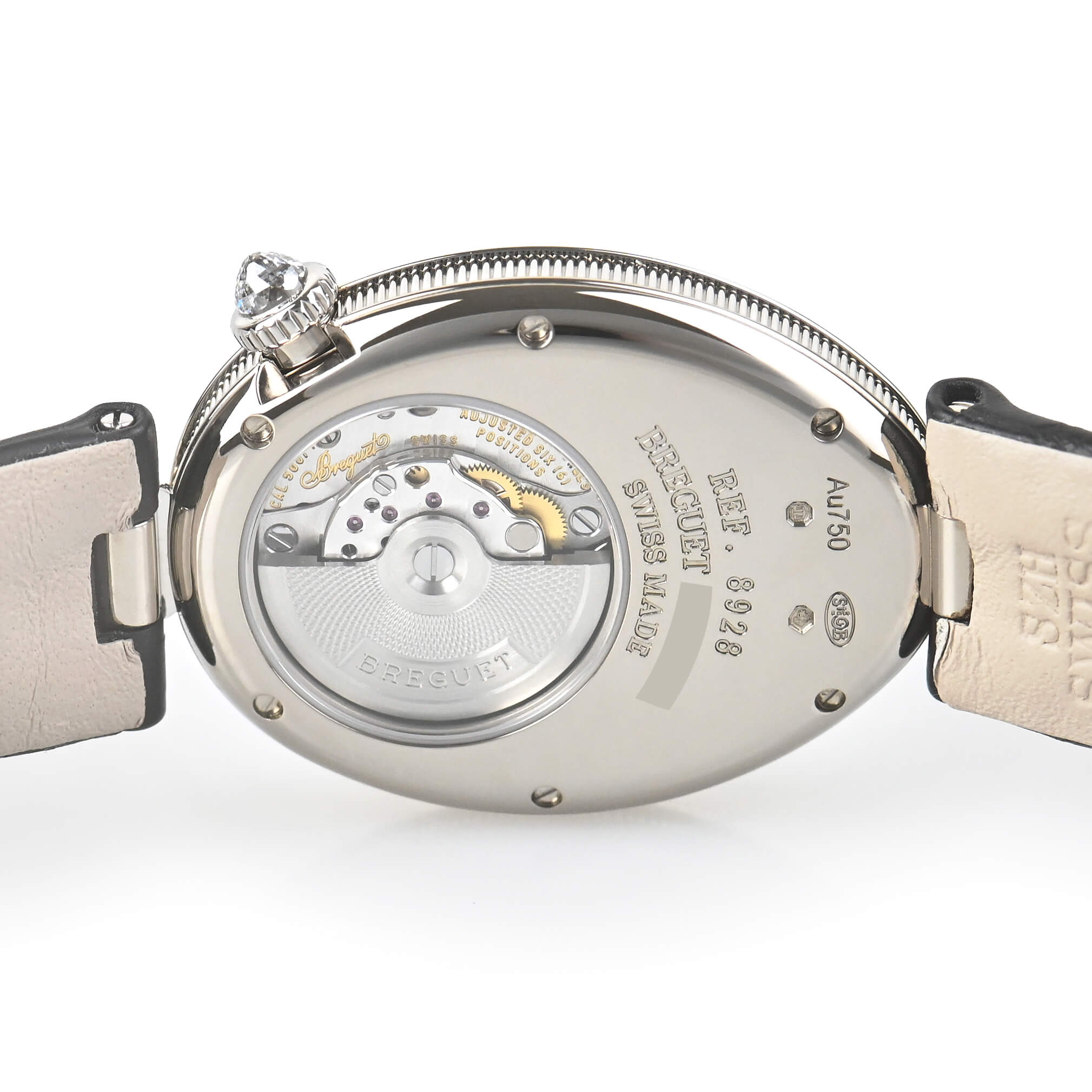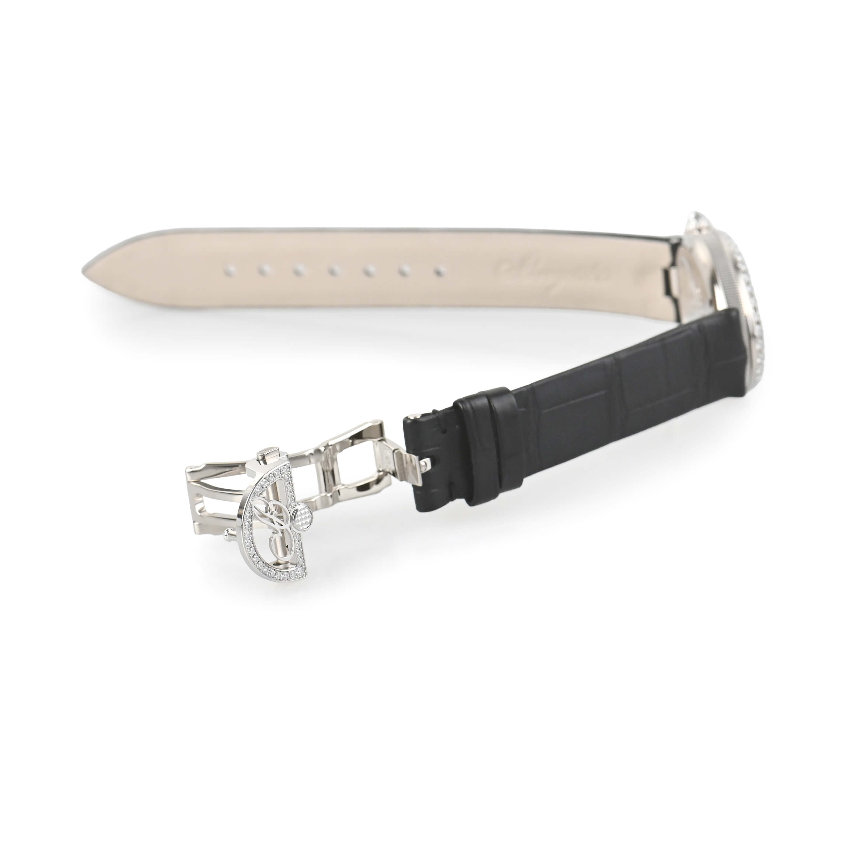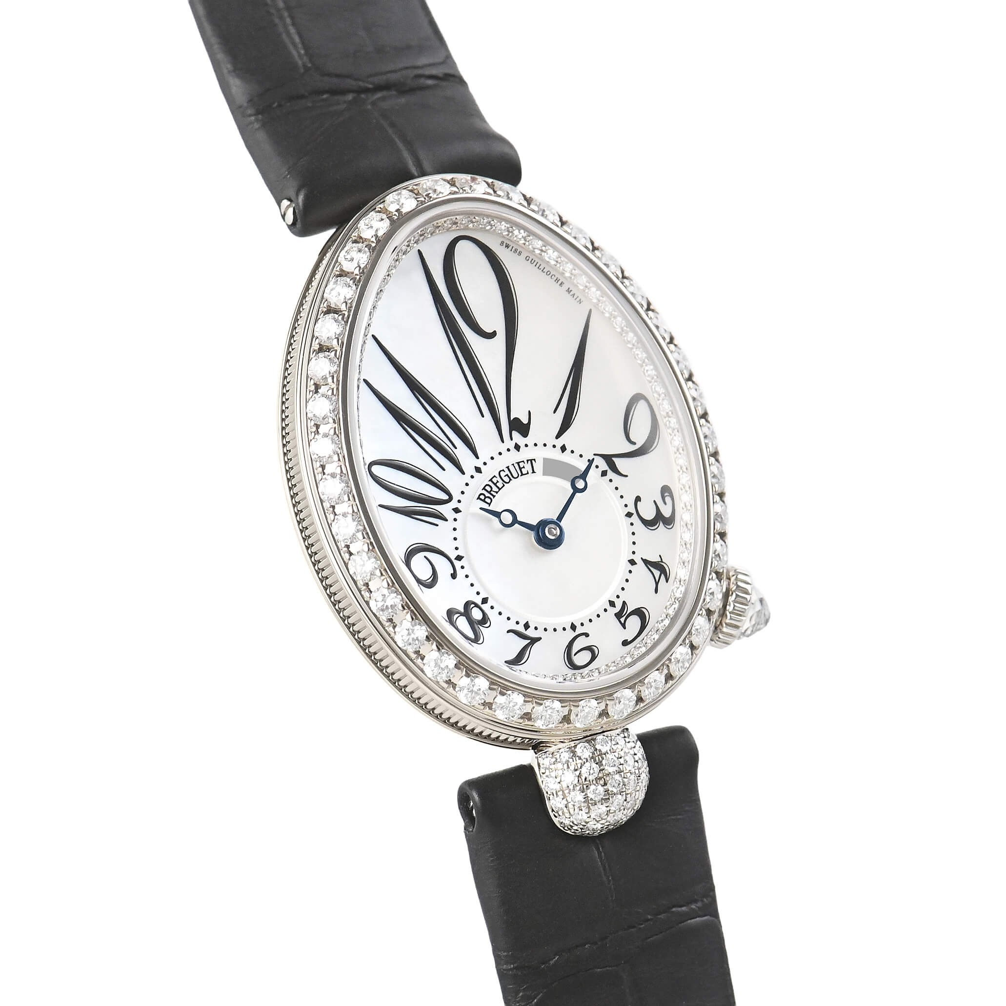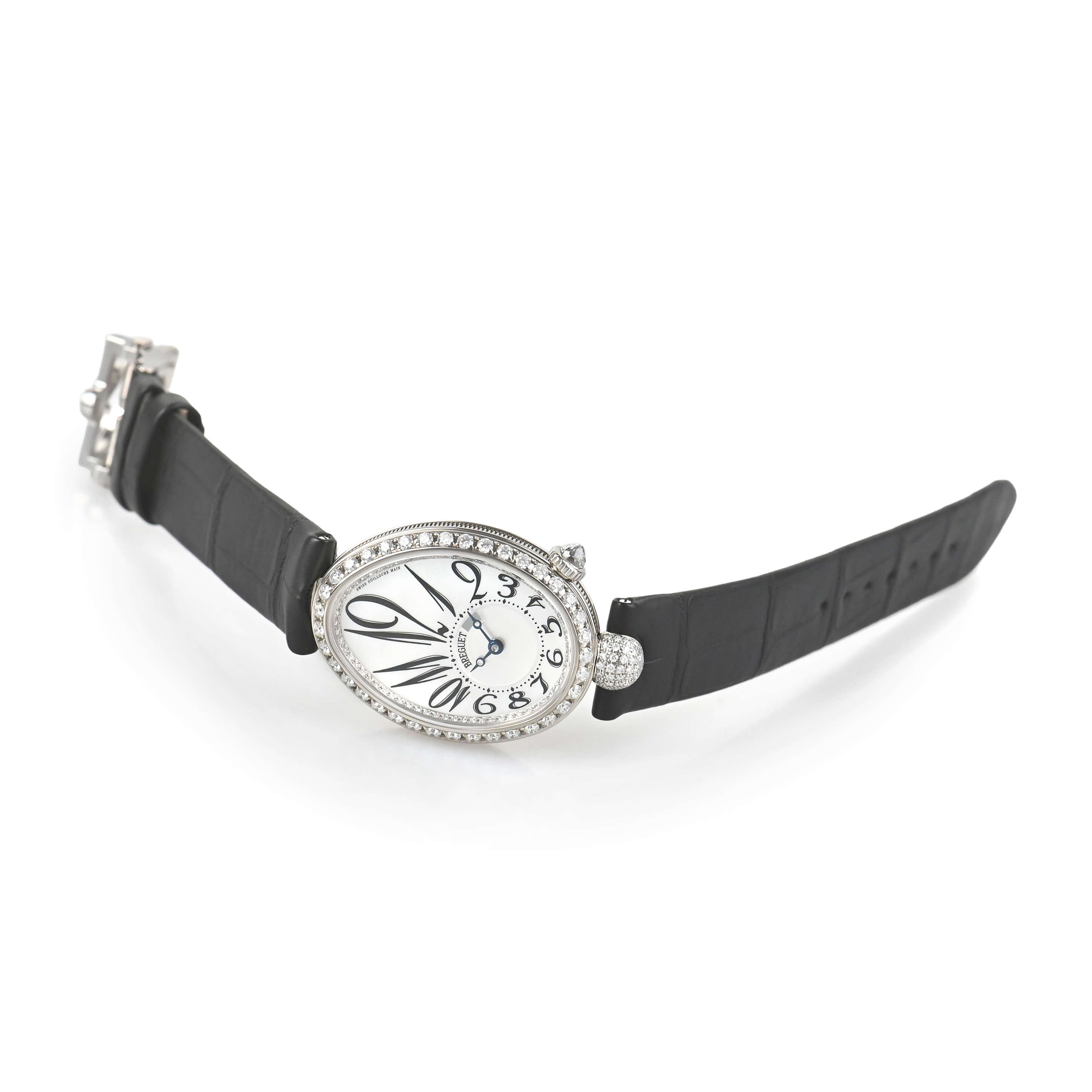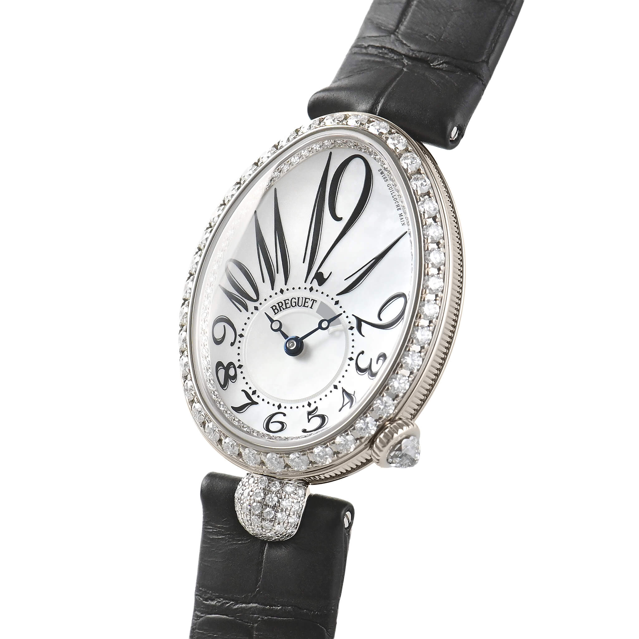 ベゼルにはダイヤモンドがセッティングされ、ホワイト・マザーオブパールのダイヤルと共に華やかさを演出。時計が貴族ための特別なものだった時代の雰囲気を今に伝えています。