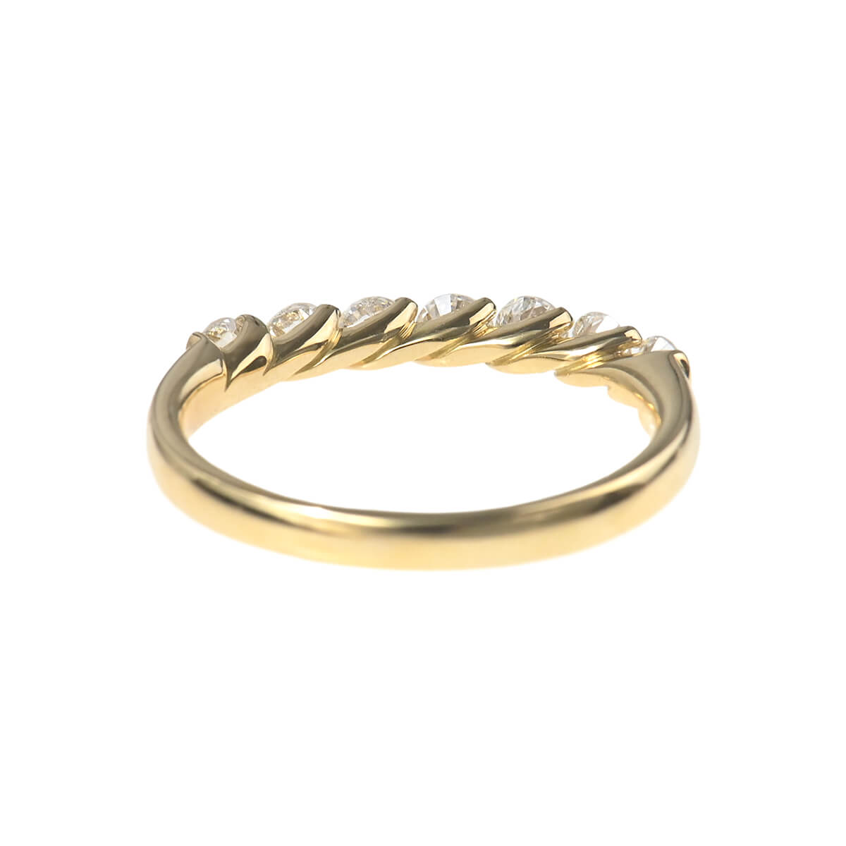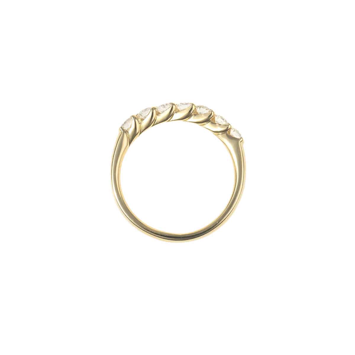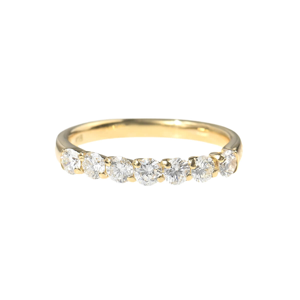 トータル0.74ct、7石のダイヤモンドがサイドから見ると波打つようなラインを描いたプロングでセッティングされ1列にならぶイエローゴールド製リング。シンプルながら細部までつくりこまれた、美しいダイヤモンドジュエリー。ダイヤモンドひと粒1粒が際立ってきらめき程よい存在感を放ちながら、日常に本物の輝きを添えてくれるハーフエタニティリングです。