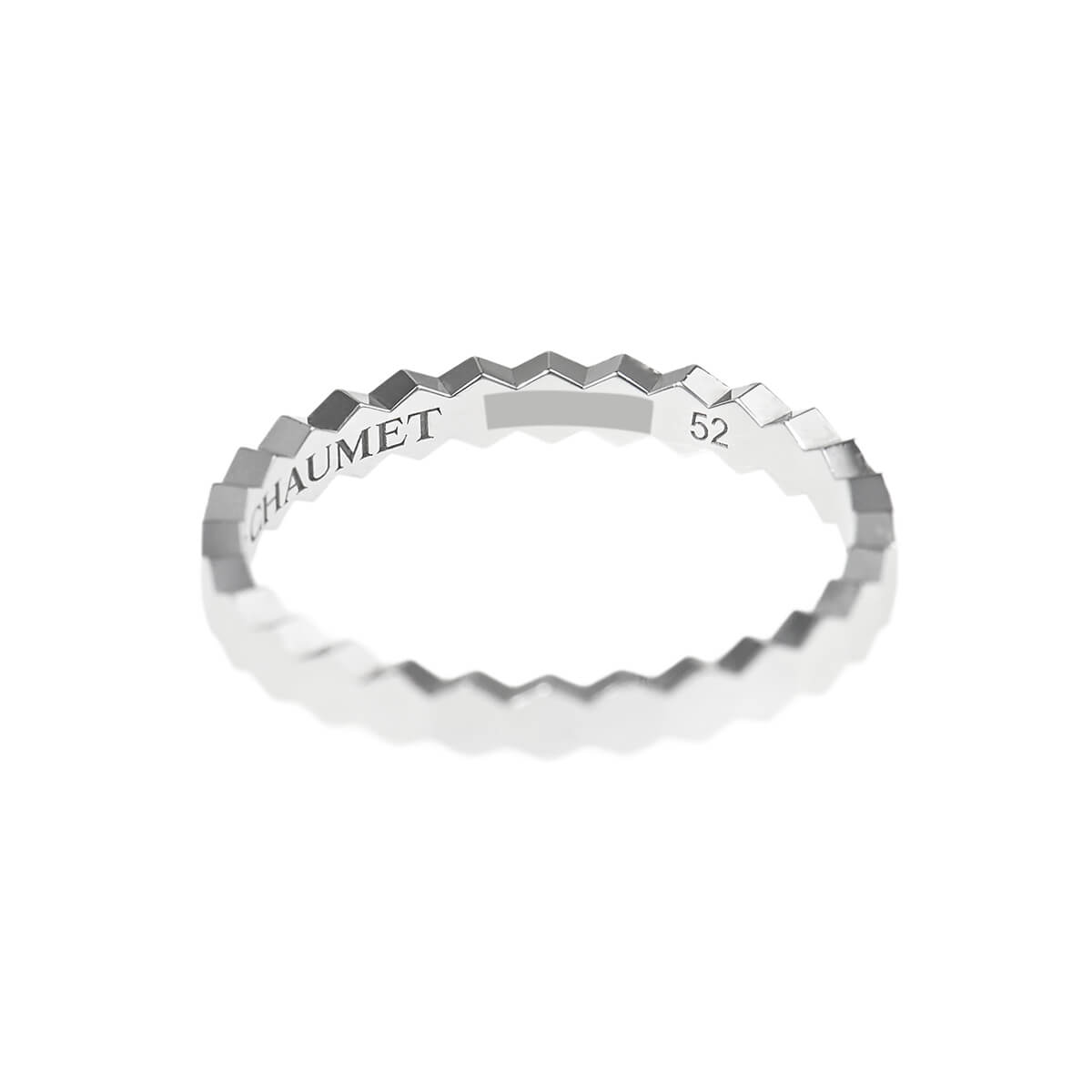 1780年、フランスのサントノレ通りにMarie-Etienne Nitot(マリ・エティエンヌ・ニト)が立ち上げた小さな宝石店からその長い歴史をスタートさせた、「グランサンク(5大宝飾店)」のひとつでもあるパリの名門老舗ジュエラー『CHAUMET(ショーメ)』。皇室の象徴であるミツバチを現代的に再解釈し、ミツバチの巣からインスピレーションを得た象徴的なハニカムデザインが印象的な「Bee My Love(ビーマイラブ)」コレクションは、グラフィックでタイムレスなジュエリーコレクションです。連なるハニカムモチーフが指先で際立つ、「Bee My Love(ビーマイラブ)」のホワイトゴールド製リング。1本でシンプルに身につけるのはもちろん、素材やサイズの異なる同コレクションとのレイヤードを楽しむのも。輝きと洗練を兼ね備えた完璧な幾何学模様が指先を彩って、装いをフェミニンに、スタイリッシュに格上げします。