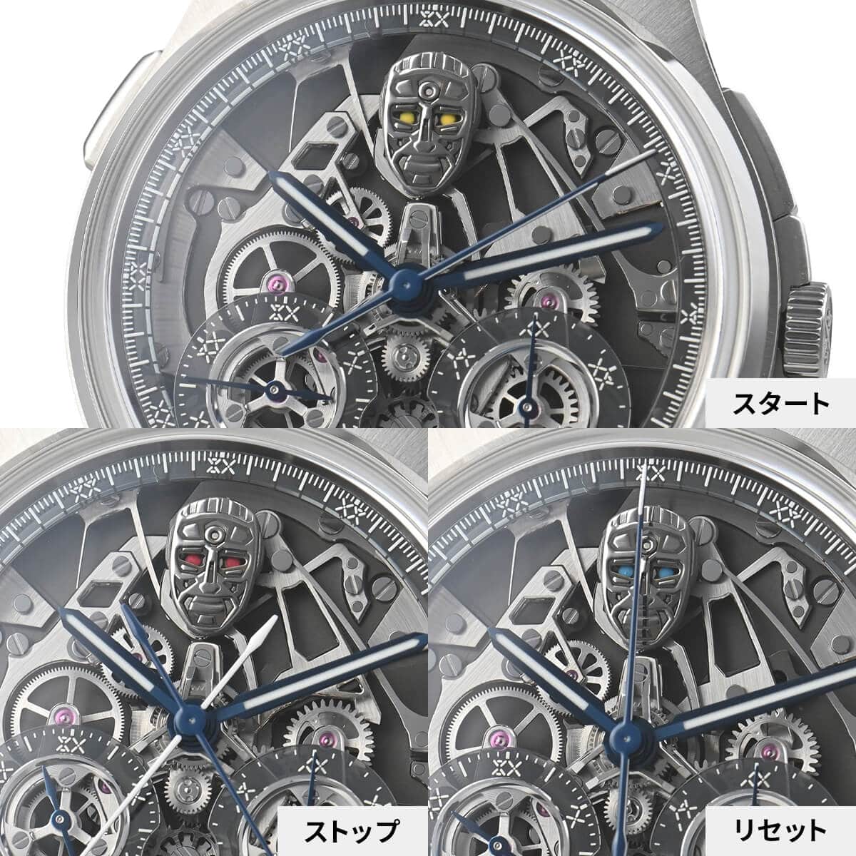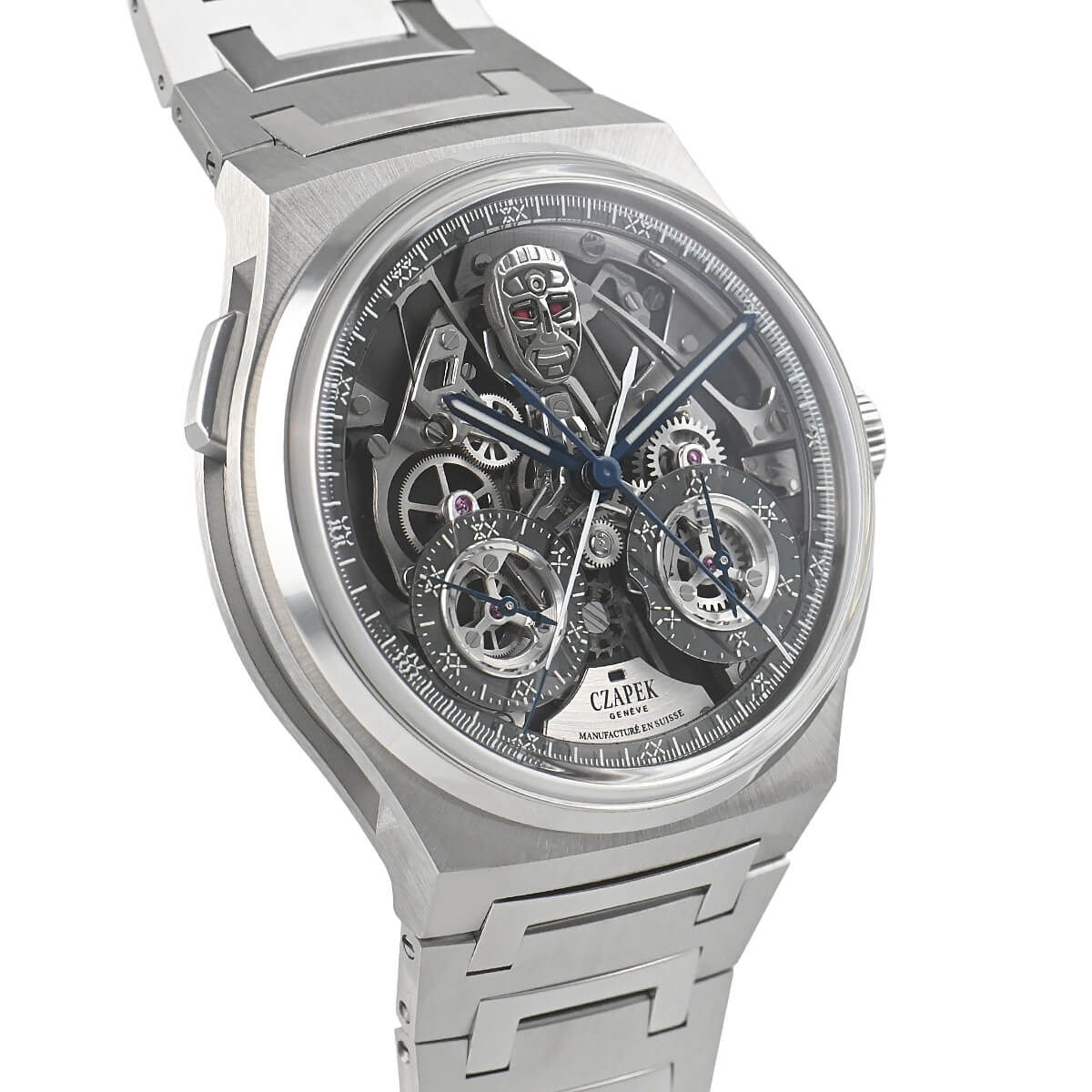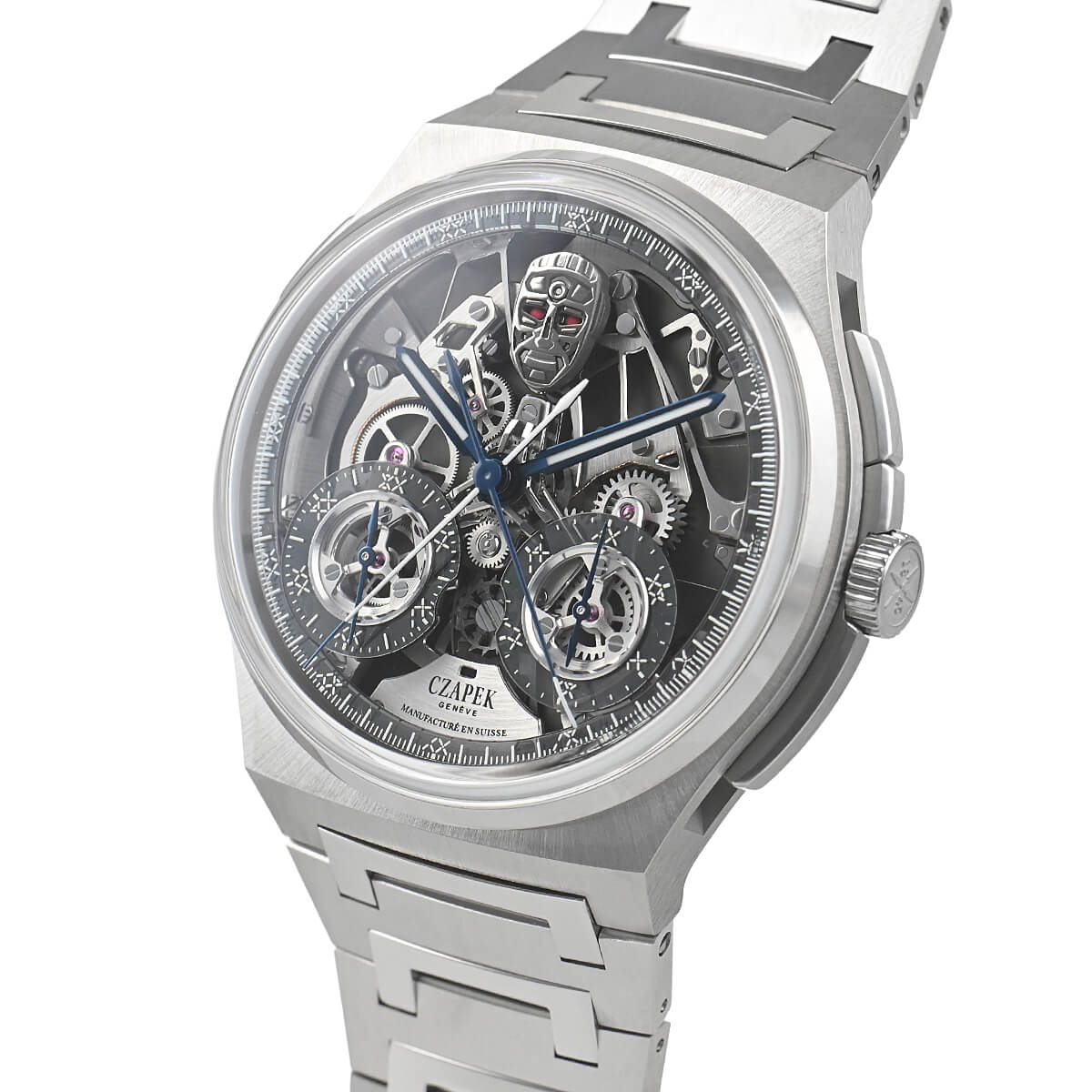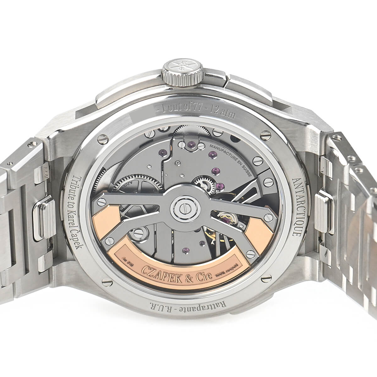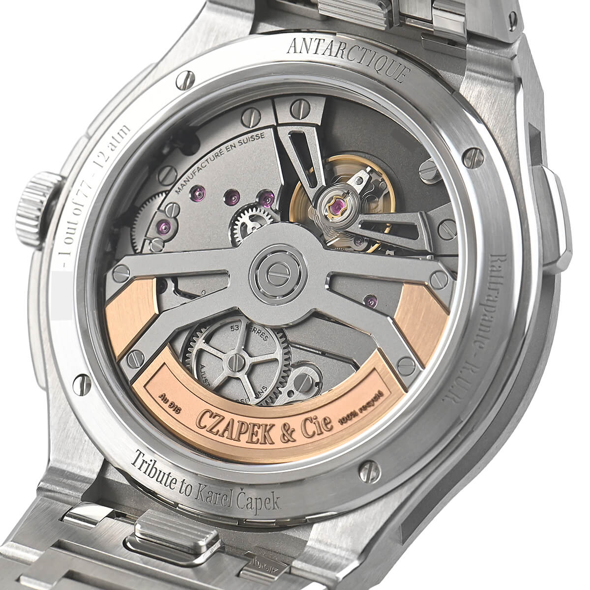 時計師のフランソワ・チャペックはポーランドからの亡命貴族であったアントワーヌ・ド・パテックと1839年にパテックフィリップの前身ブランドの「パテック・チャペック社」を設立し、1845年の契約終了後に自身のブランド「チャペック社」をジュネーブに設立した人物です。そのフランソワ・チャペックに名の由来を持つ「チャペック」が、100年前に同じ“チャペック”を持つ作家「カレル・チャペック」が戯曲R.U.R.(原題: チェコ語: Rossumovi univerzalni roboti、ロッサム万能ロボット会社)を書いたことを記念して作られたのが、こちらの「アンタークティック・ラトラパンテ R.U.R トリビュート・トゥ・カレル・チャペック」。