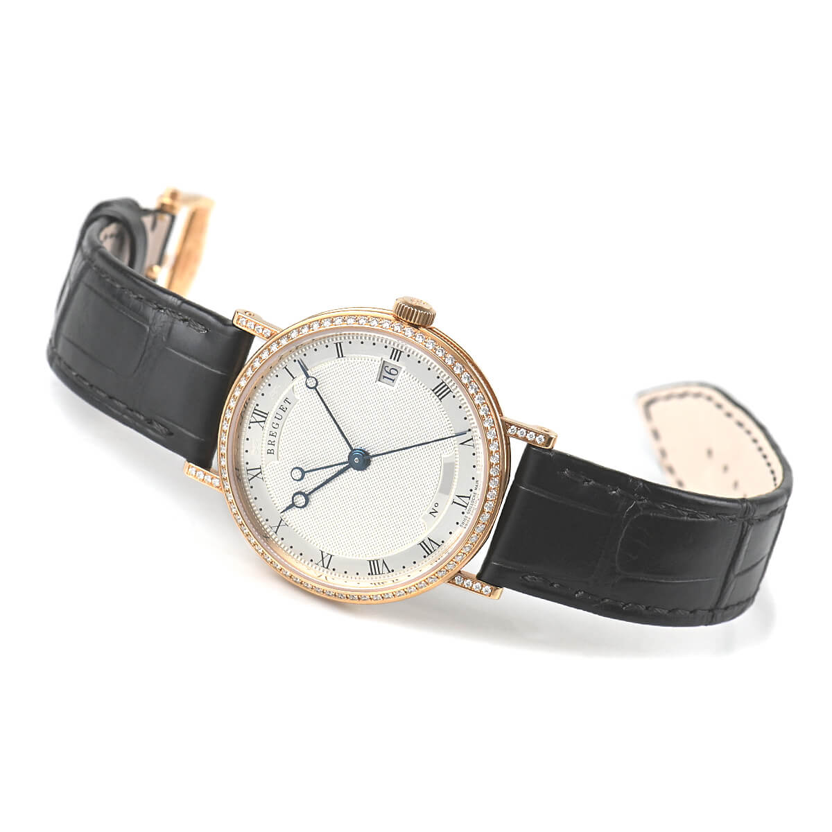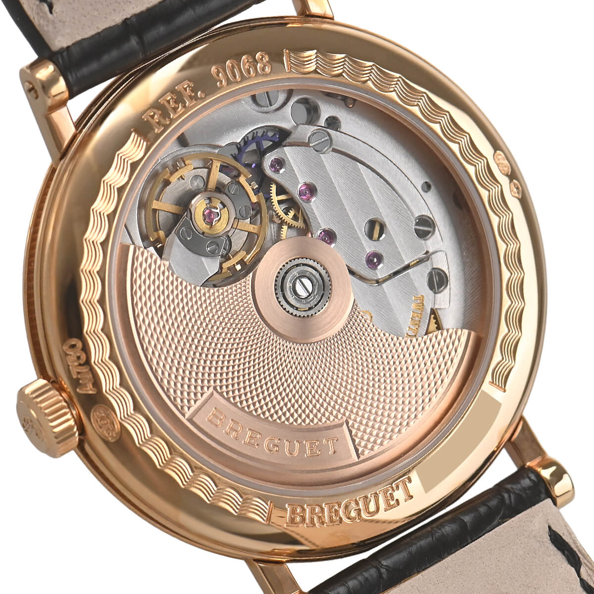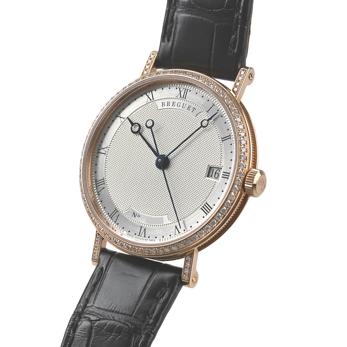 ピンクゴールドのケースにダイヤモンドをセッティングした華やかな「クラシック 9068」。繊細に刻まれたギョーシェダイアル、ブルースチールのブレゲ針、コインエッジが刻まれたケースサイドなど、様々なブレゲらしい特徴を持ち合わせながらも、クラシックで落ち着いたデザインが特徴です。