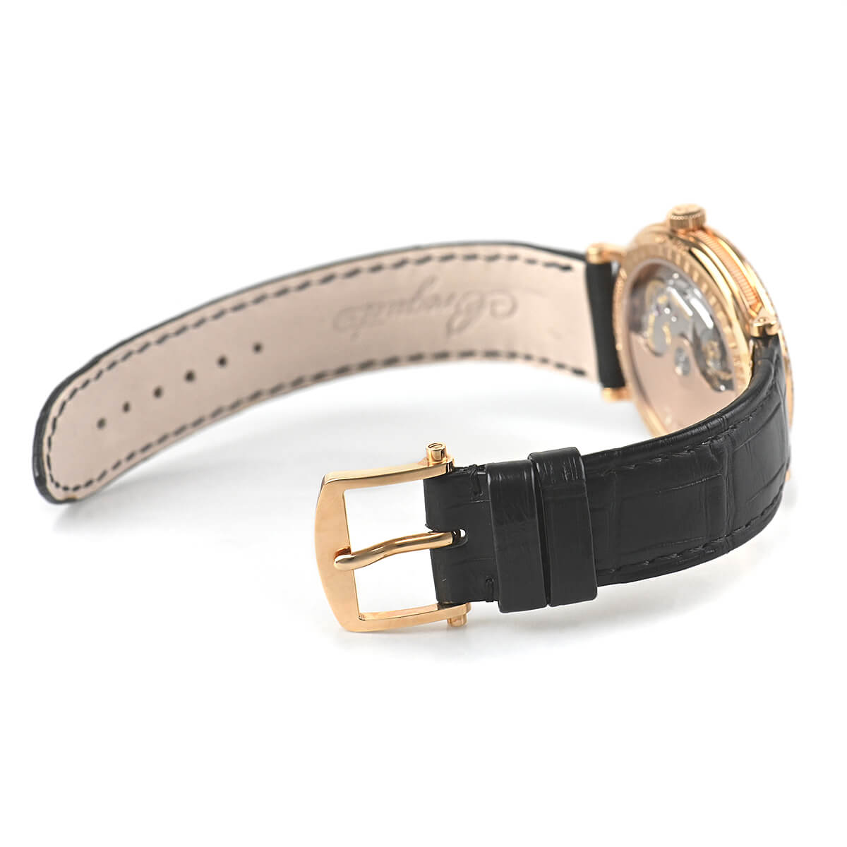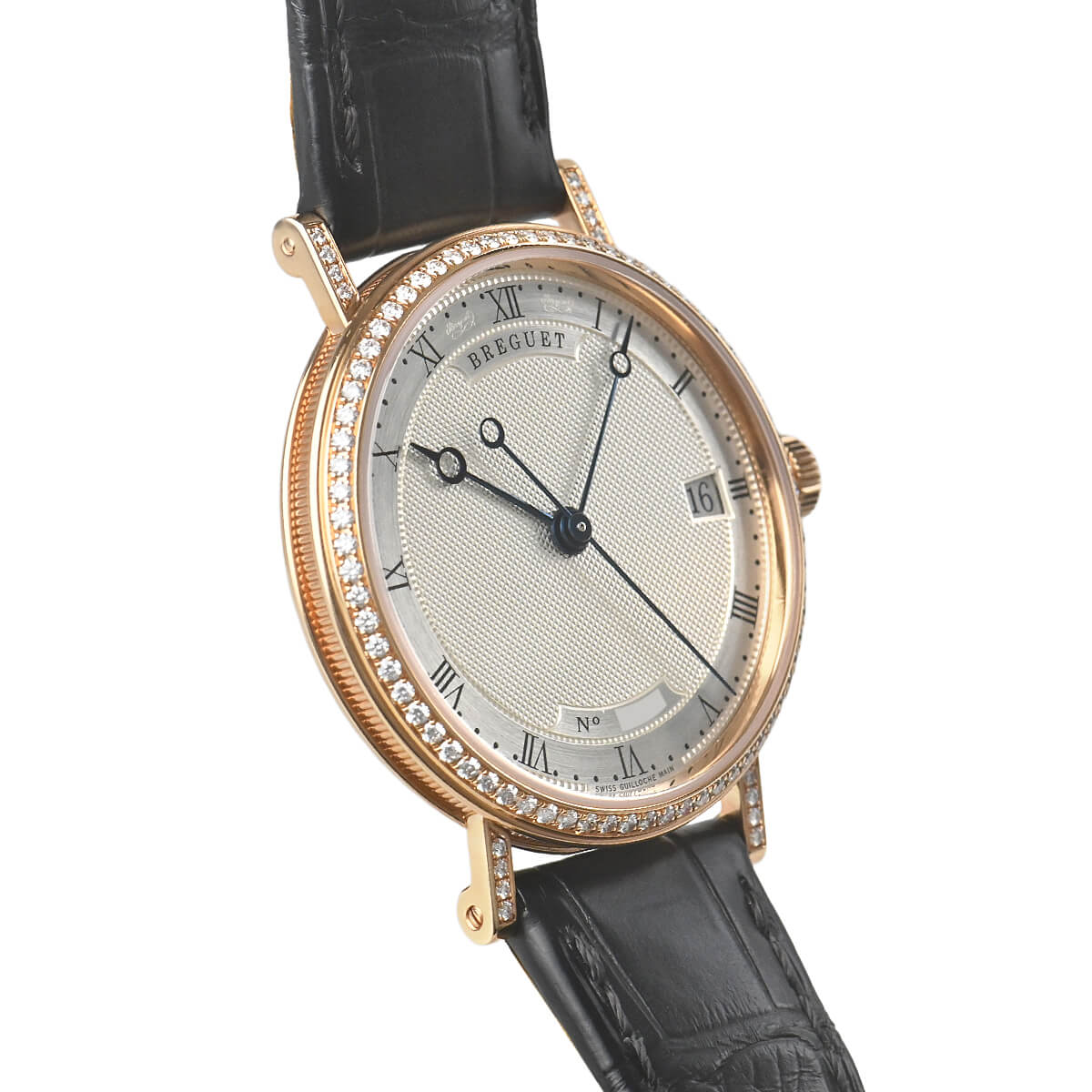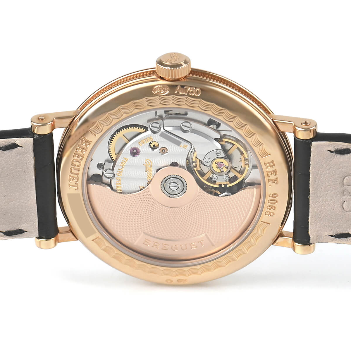 ピンクゴールドのケースにダイヤモンドをセッティングした華やかな「クラシック 9068」。繊細に刻まれたギョーシェダイアル、ブルースチールのブレゲ針、コインエッジが刻まれたケースサイドなど、様々なブレゲらしい特徴を持ち合わせながらも、クラシックで落ち着いたデザインが特徴です。