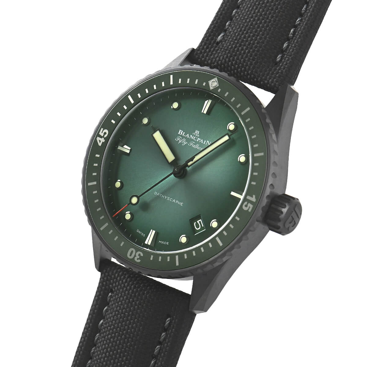 1950年代後半にオリジナルモデルが生産され、2013年にフィフティファゾムス誕生60周年を記念して製作された【フィフティファゾムス バチスカーフ】。ブラックセラミックケースにグリーンダイアルを合わせたモデルで、43.6mmケース径です。