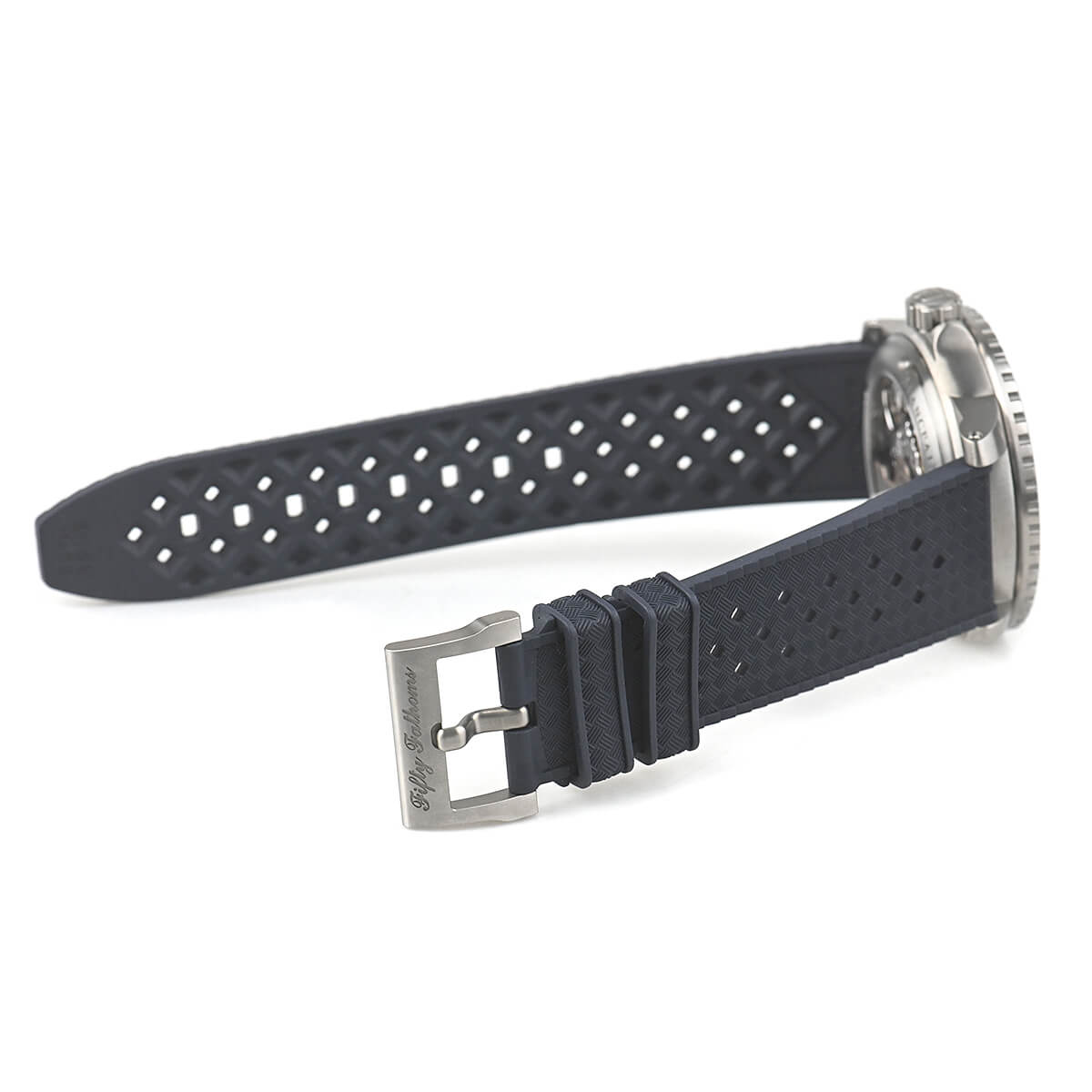 チタンケースの裏蓋はシースルーバックとなっており、美しく仕上げられたムーブメントがご覧いただけます。