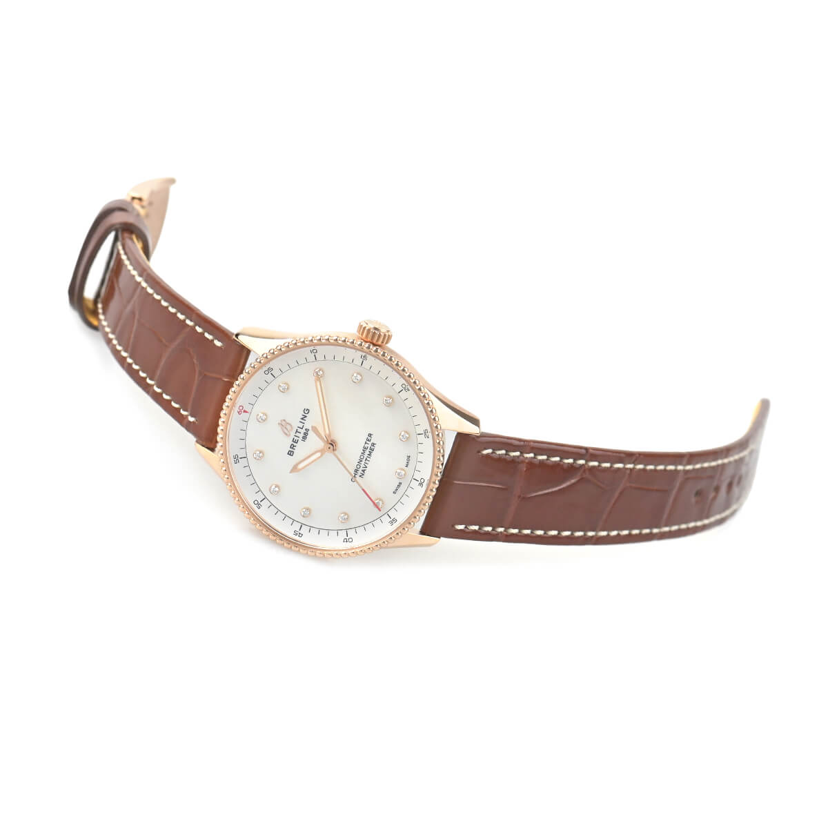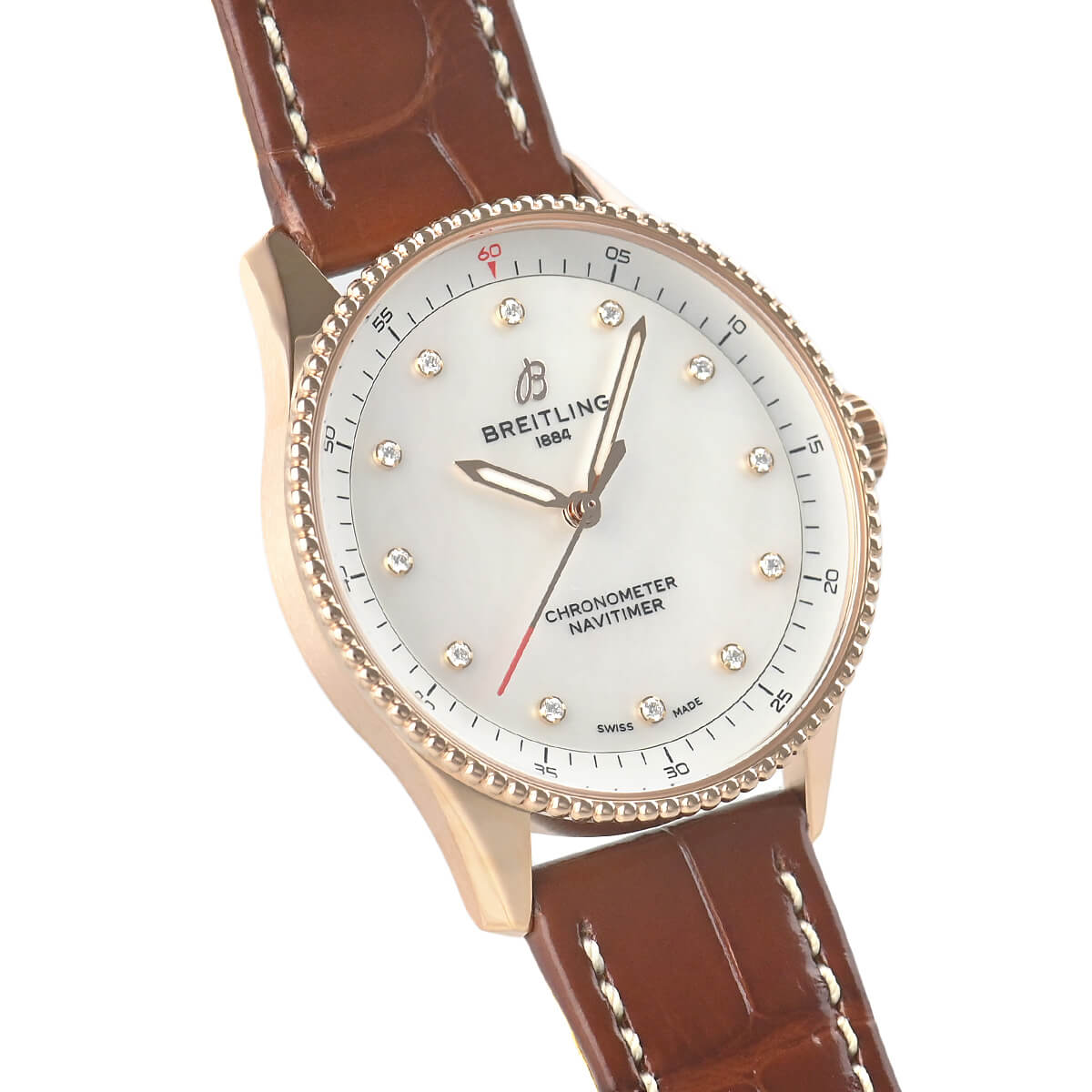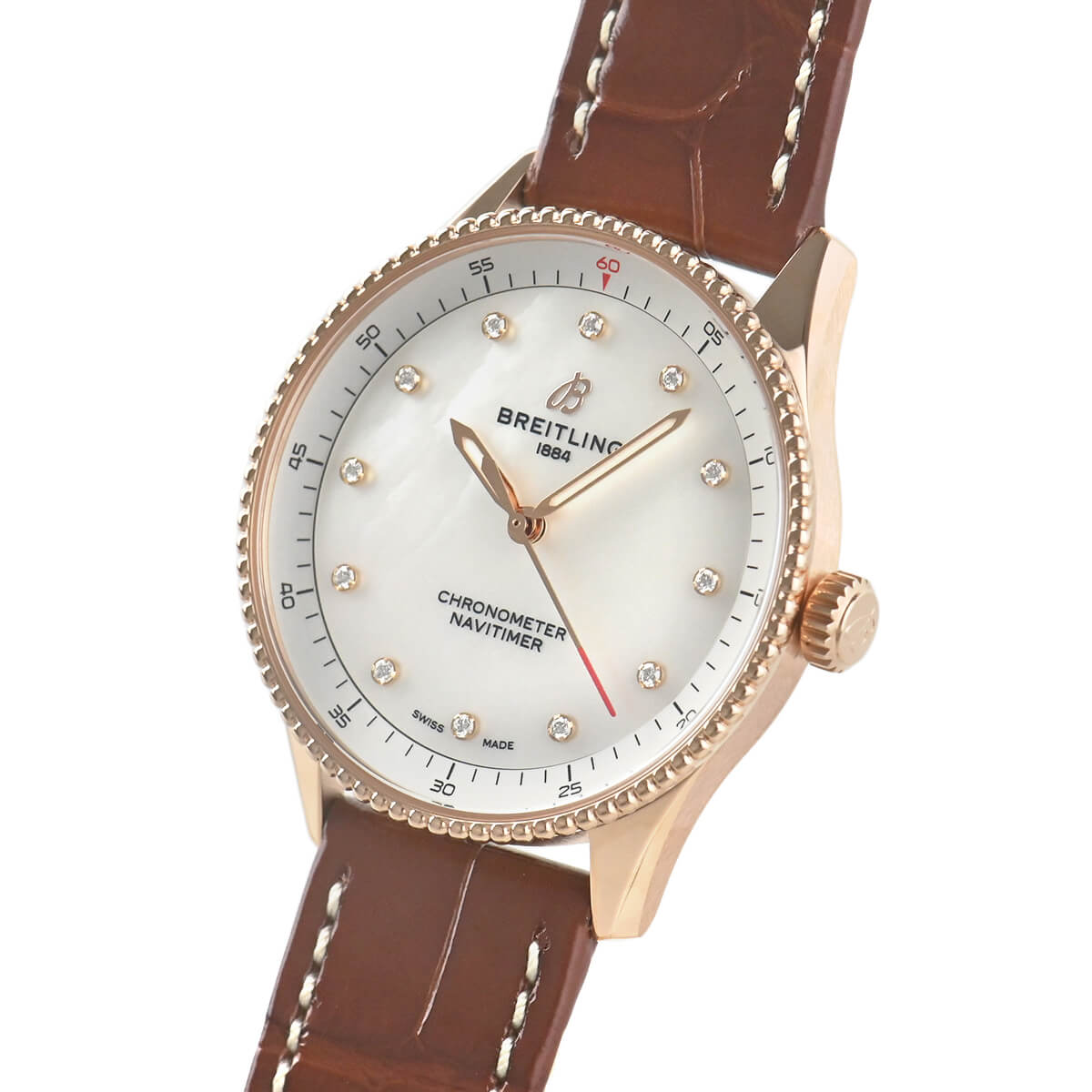 ケース径32mmのレディースモデル【ナビタイマー32】は、かつてブライトリングが3針モデルを初めて発表した1950年代まで時をさかのぼりつつデザインされた新しいナビタイマーです。クロノグラフ機能を取り除きすっきりとした印象の文字盤で、素材にレッドゴールドを採用しホワイトシェル文字盤に12ポイントダイヤをあしらったラグジュアリーなモデルとなっております。