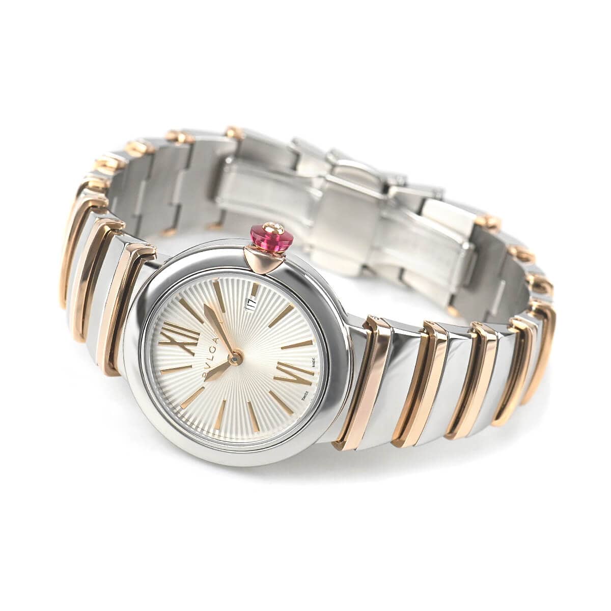 光を意味するイタリア語の“ルーチェ”とラテン語の“ルクス”から名づけられた「ルチェア」。カボッションカットのピンク シンセティック サファイアを使用したリューズに、ダイヤモンドをマウントするなど、ハイジュエラーならではの細工が施された一本です。