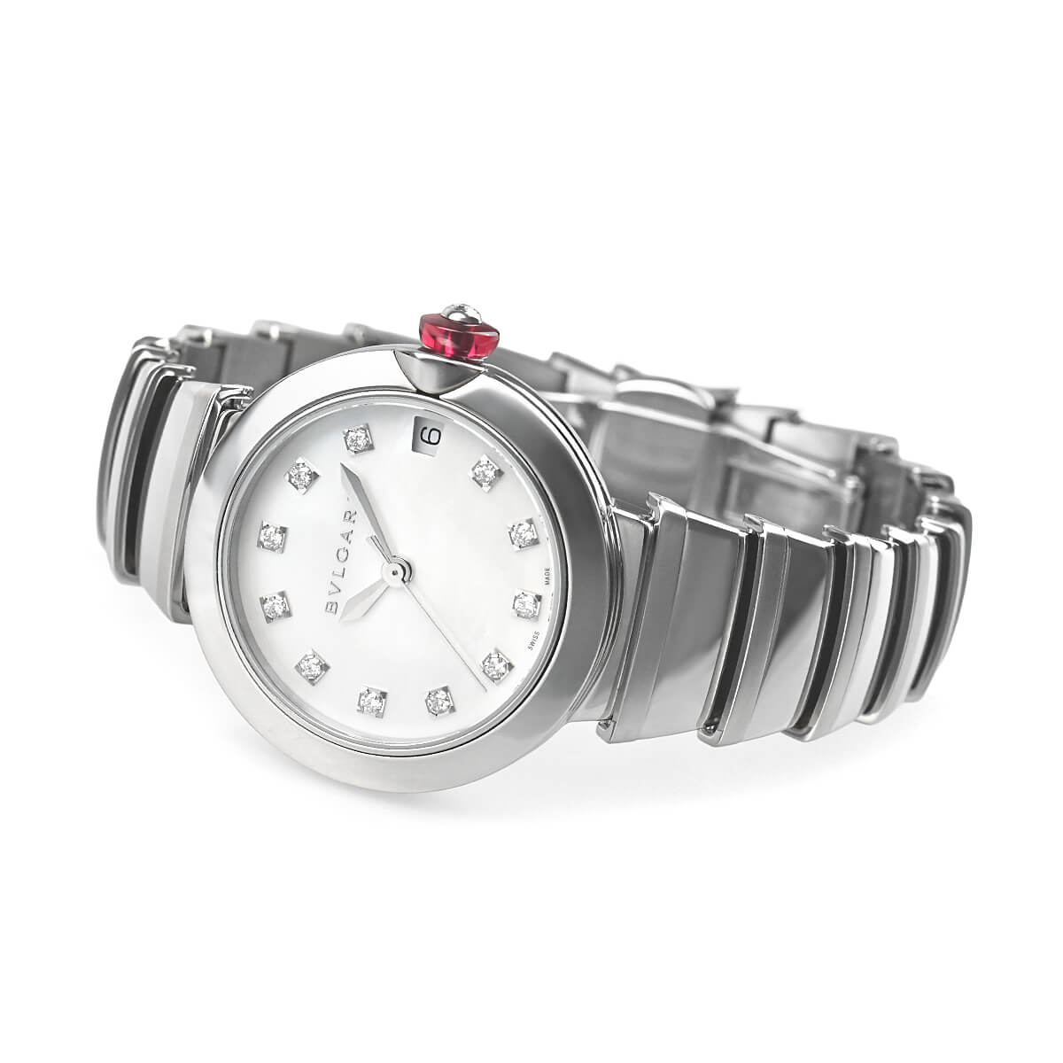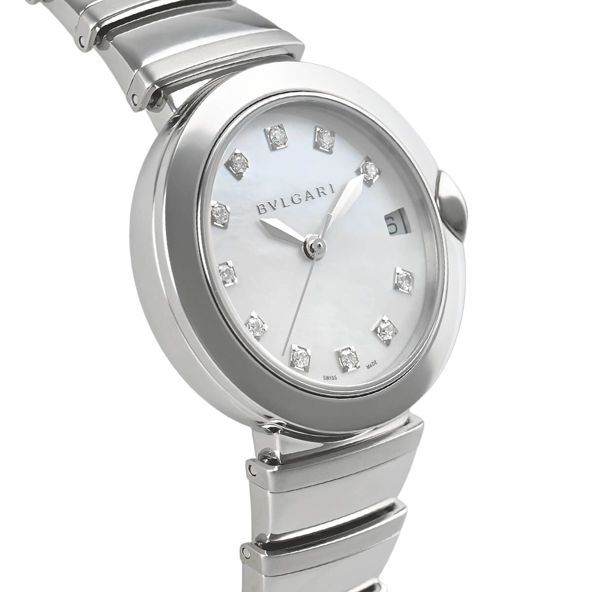 シンプルな円筒形のケースにブルガリらしい斬新なブレスレットが合わさり、モダンな印象を与えています。