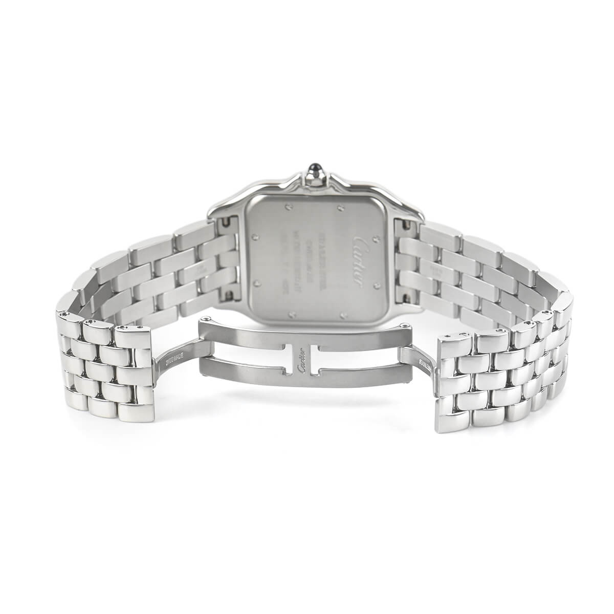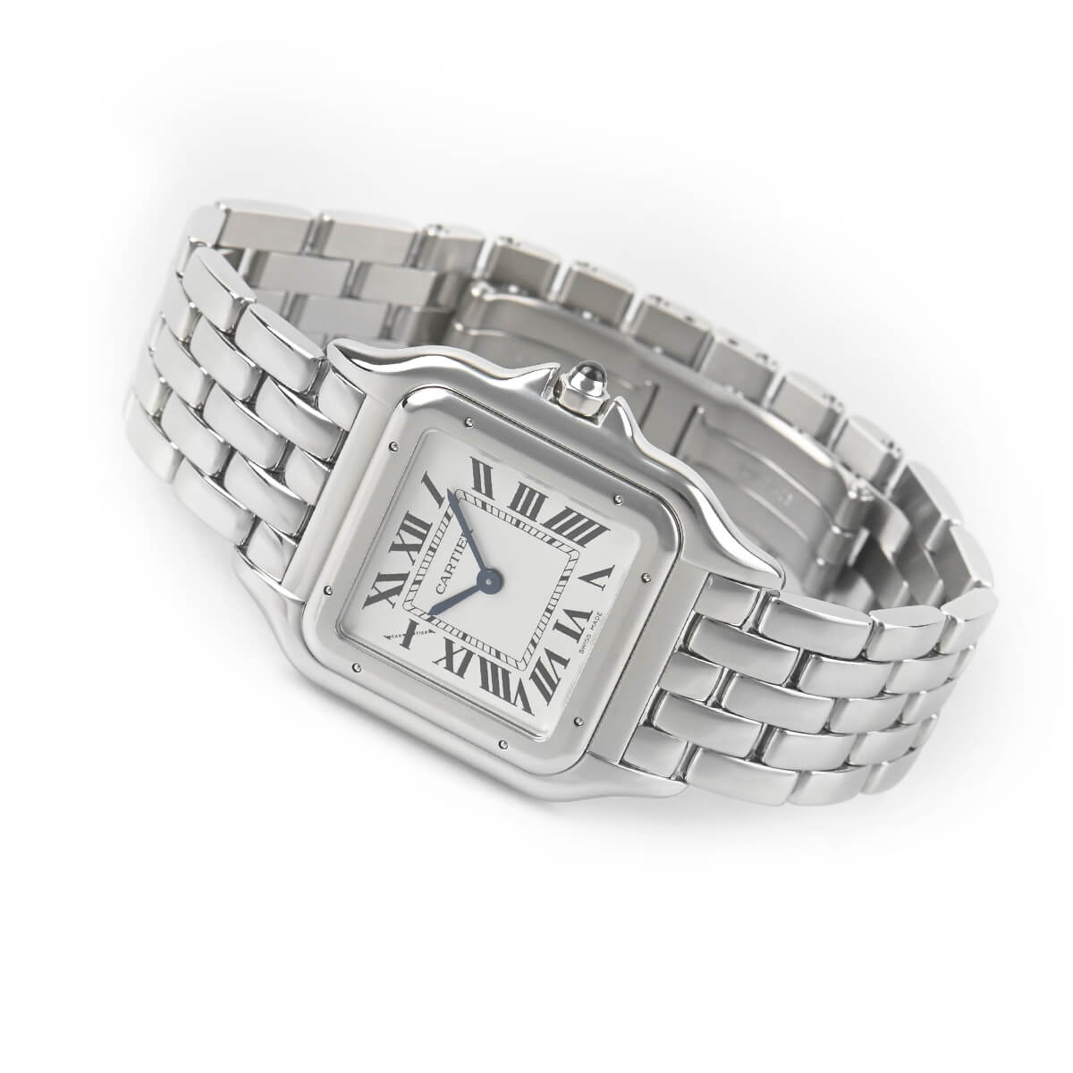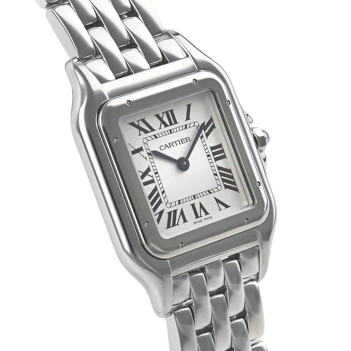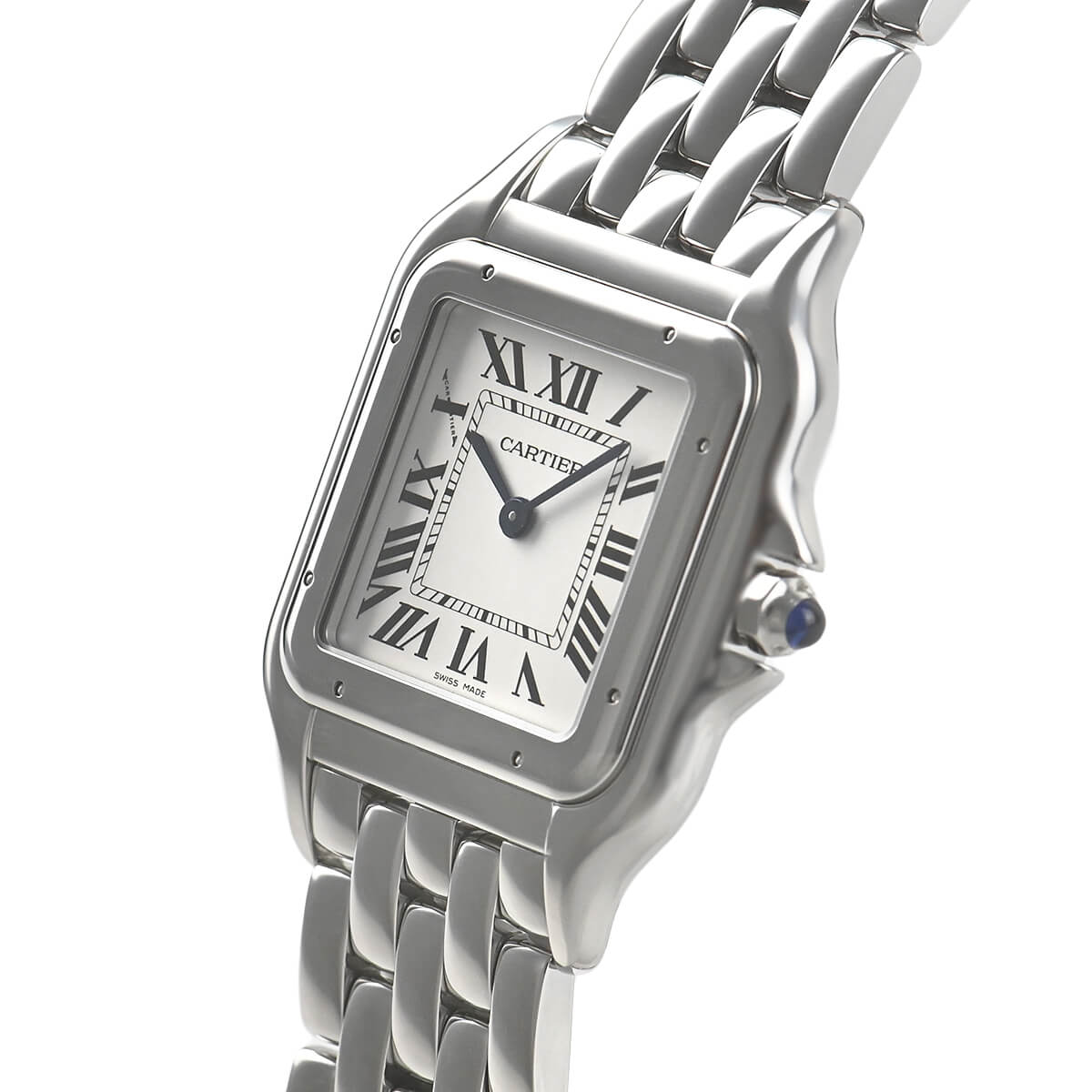 文字盤は内側にレイルロードを設けたローマインデックスで、美しく仕上げられたブルースチール針との組み合わせもカルティエらしく絶妙なバランスを保っています。