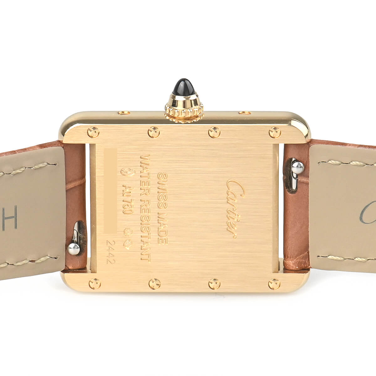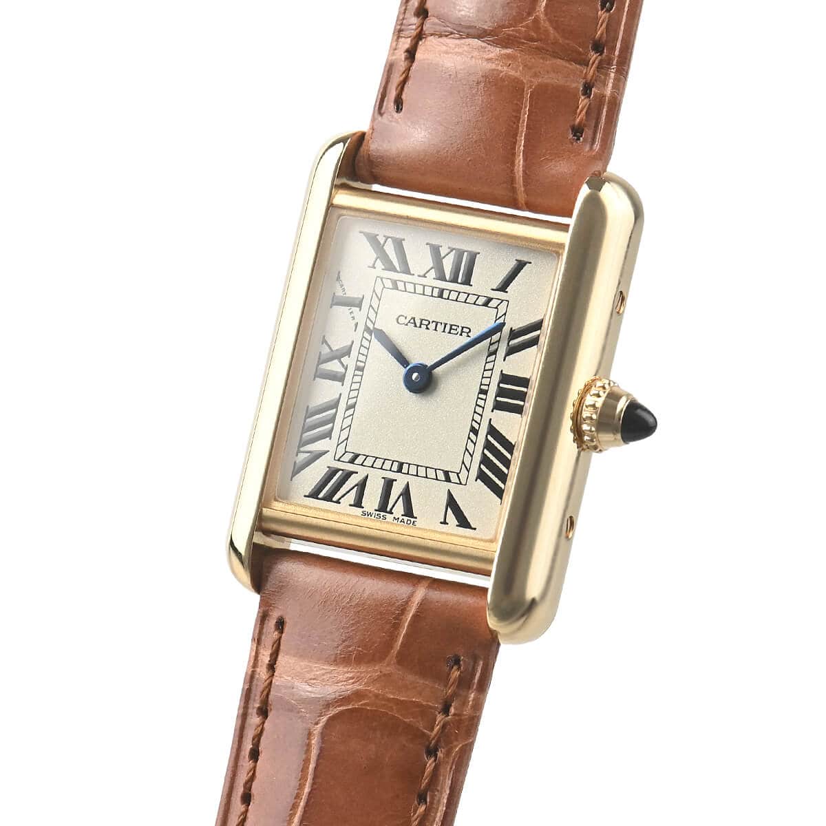 1917年、ルノー製の戦車の図面からヒントを得てデザインされたタンクは1919年にウォッチコレクションが発売されました。直線と曲線が端正なラインを描く完成されたデザインで、カルティエのアイコン的な存在となっています。こちらはイエローゴールドとカルティエらしいローマ数字のダイヤルの組み合わせが素敵なレディースモデルです。