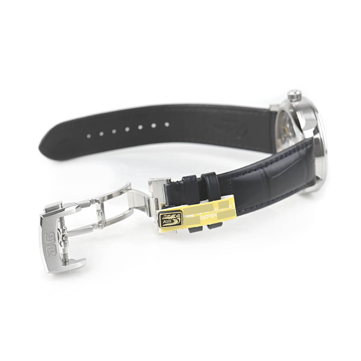 セネタシリーズに新たに追加された40mmケース採用のクラシカルなスタイルのムーンフェイズモデルです。ビッグデイト表示は、ふたつの数字の間を仕切るバーが無い特殊な構造になっています。