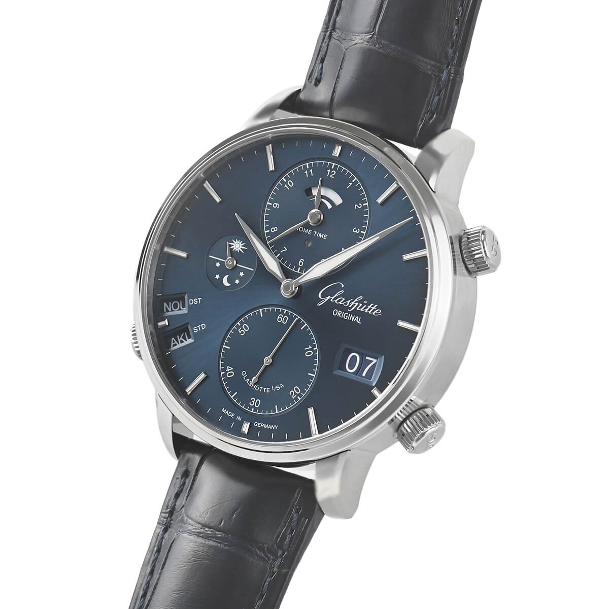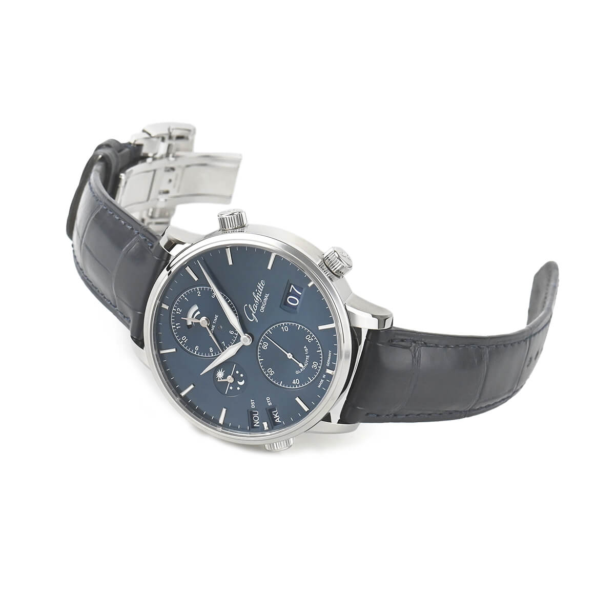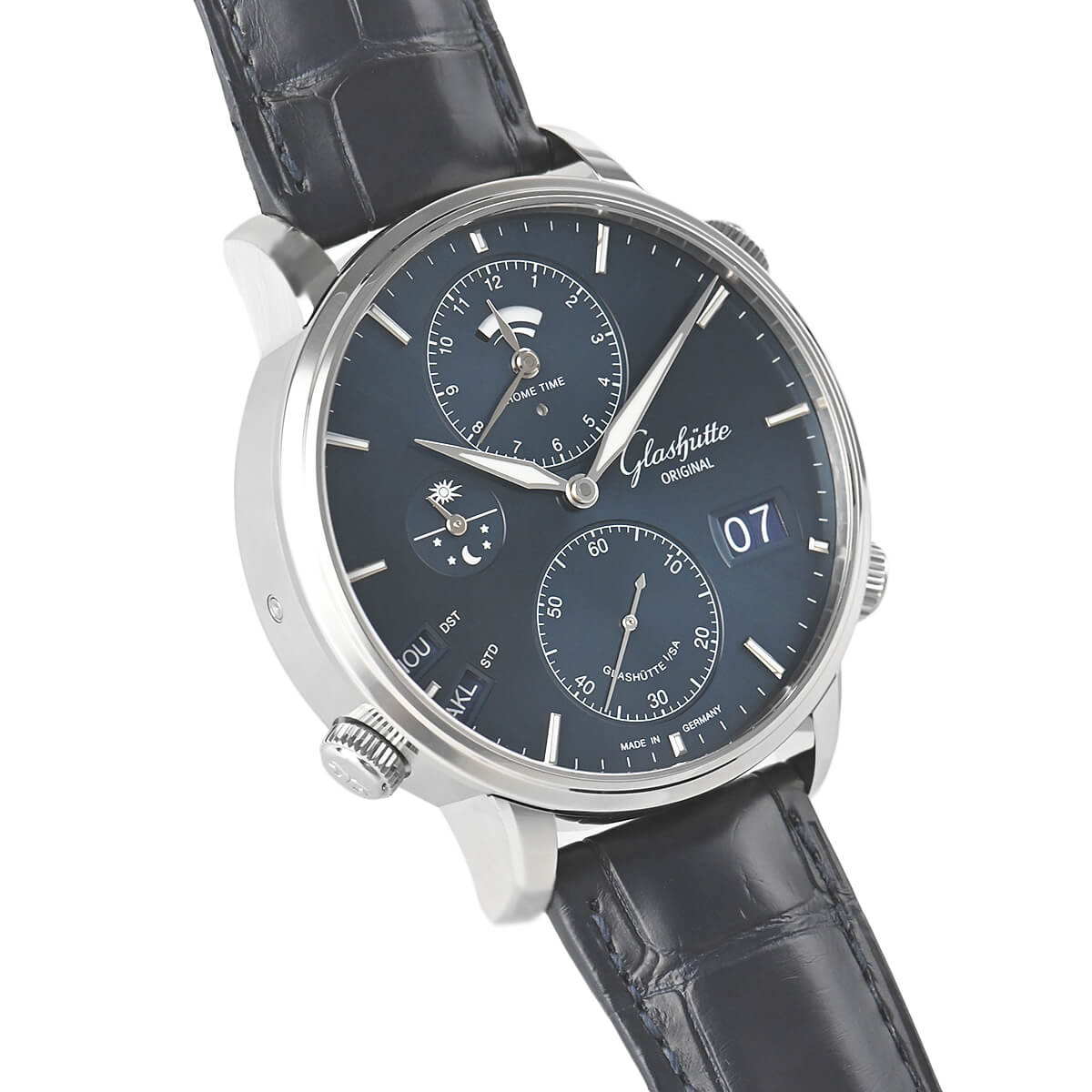 ブランド名にも入っているグラスヒュッテ地方の伝統的なドイツ時計を作っている「グラスヒュッテ オリジナル」。こちらは「セネタ・コスモポリト」44mmのステンレスケースを採用。現地時間とホームタイムを同時に表示する機能を備えております。