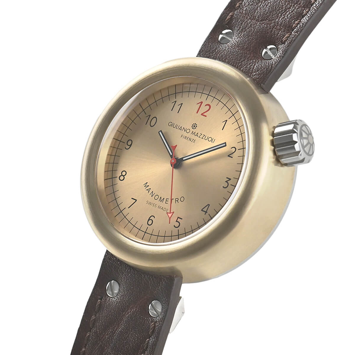 「ジュリアーノ・マッツォーリ」は、デザイナーのジュリアーノ・マッツォーリが2001年にイタリア・フィレンツェに設立したブランドです。「マノメトロ」とはイタリア語で圧力計を意味し、モデル名のごとく厚みのある肉厚なケースフォルムを採用したブランドを代表するモデル。