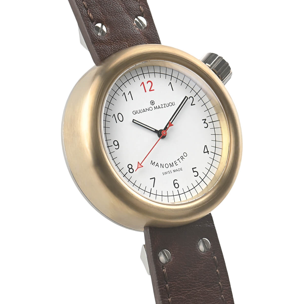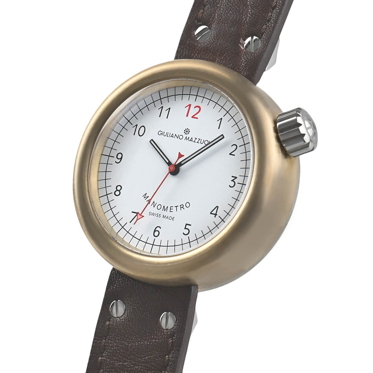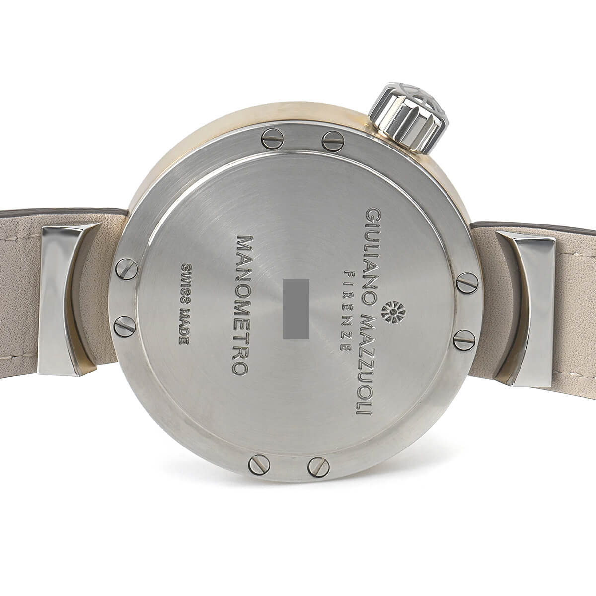 「ジュリアーノ・マッツォーリ」は、デザイナーのジュリアーノ・マッツォーリが2001年にイタリア・フィレンツェに設立したブランドです。「マノメトロ」とはイタリア語で圧力計を意味し、モデル名のごとく厚みのある肉厚なケースフォルムを採用したブランドを代表するモデル。