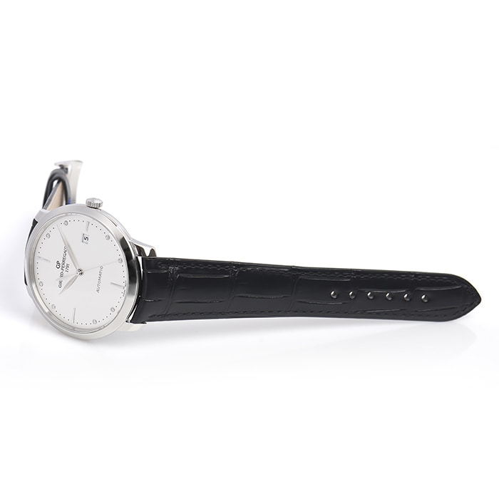 8ポイント・ダイヤモンドをセッティングしたアワーインデックスとリーフハンドがクラシックでありながら上品で落ちついた雰囲気を演出します。