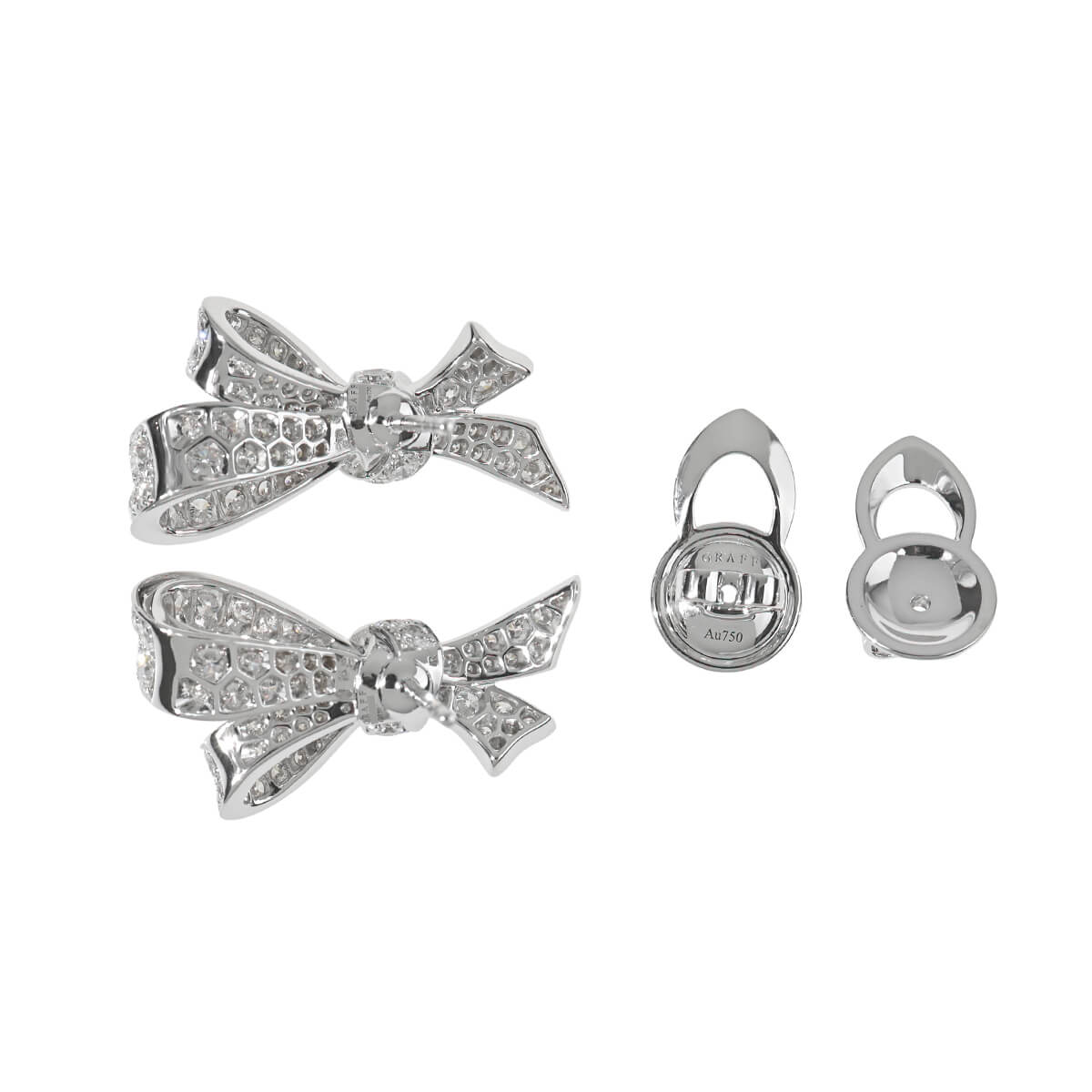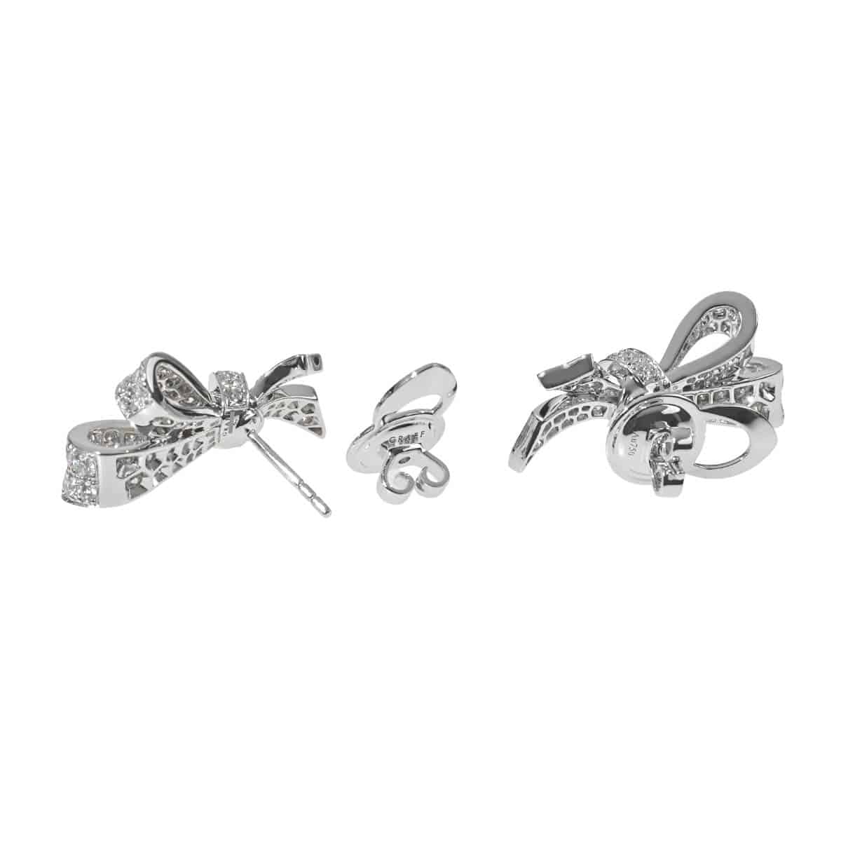 ボウ(リボン)モチーフを『GRAFF(グラフ)』らしく、新しい視点で捉えデザインした「ティルダズ ボウ」は、ダイヤモンドのラインで描かれたモチーフが毎日を甘い煌めきで彩るコレクション。この愛され続けるモチーフが華麗なハイジュエリーにいたるまで、すべてのジュエリーのクリエーションへインスピレーションを与え誕生したコレクションです。手でふんわりと結ったかのような、繊細なホワイトゴールドで創りだされた、優美な魅力に包まれたボウモチーフがフェイスラインに寄り添い光り輝く「ティルダズ ボウ」スタッドピアス。滑らかな曲線にあしらわれたダイヤモンドがどのアングルからも美しい輝きを放ち、眩い輝きに包まれたまるで本物のリボンを思わせる繊細なデザインが、身につける人の表情までも美しく生き生きと彩ります。