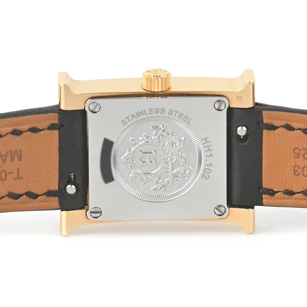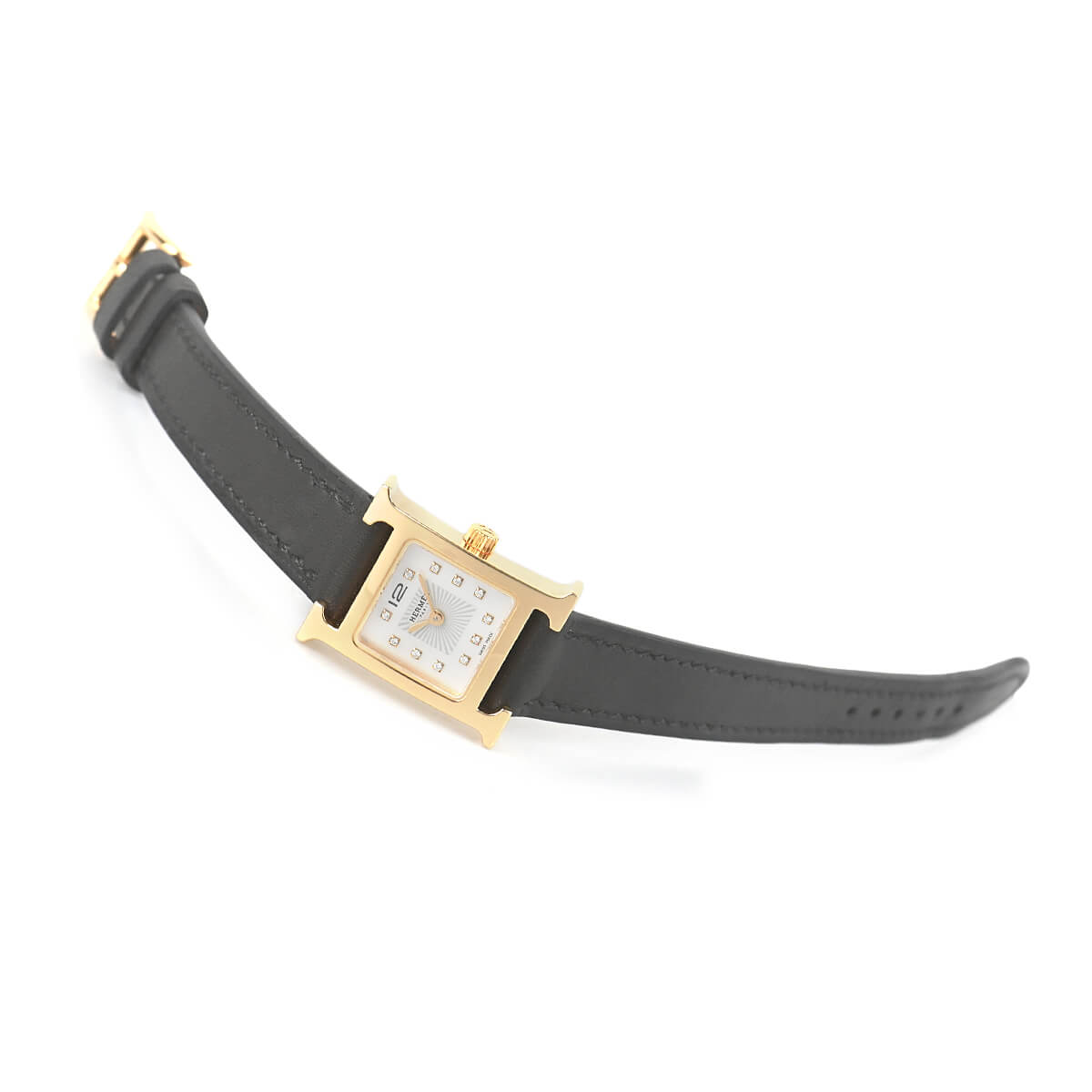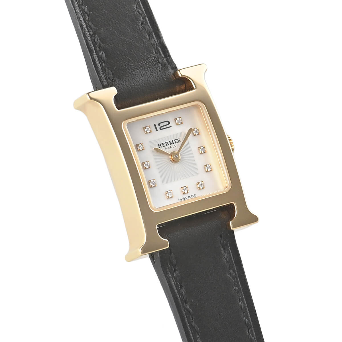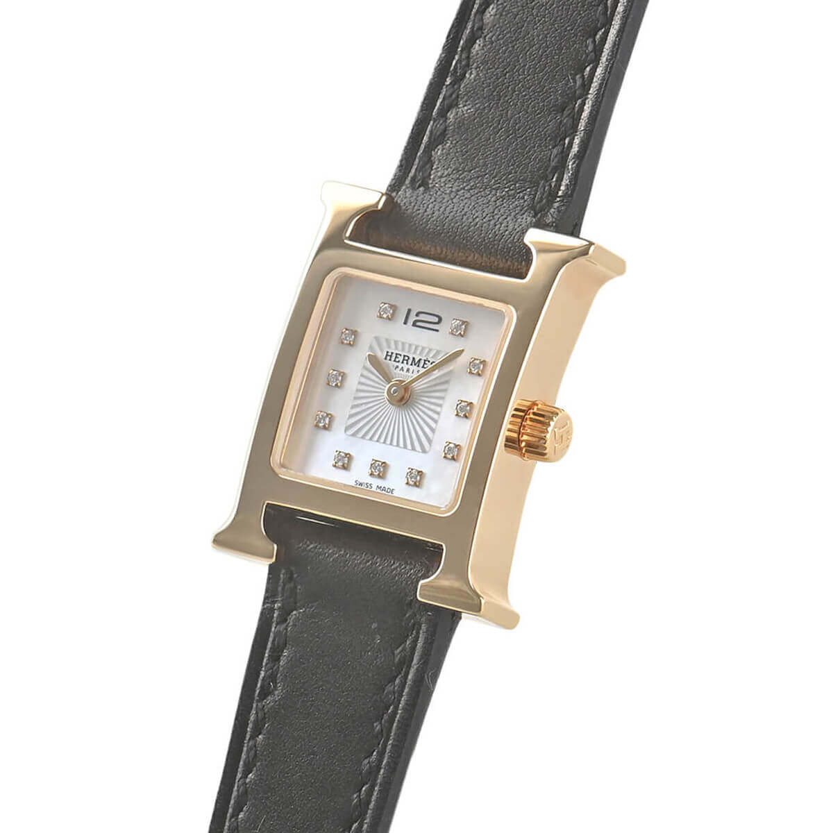 エルメスの頭文字「H」をモチーフにデザインされた「Hウォッチ」こちらは、通常のHウォッチより一回り小ぶりなモデル【Hウォッチミニ】ケース径縦17.2×17.2mmに文字盤にはシェル文字盤を採用。11ポイントダイヤモンドを施したモデルとなっております。