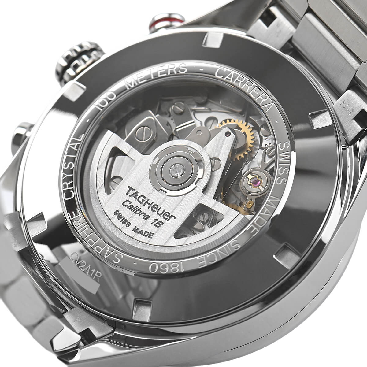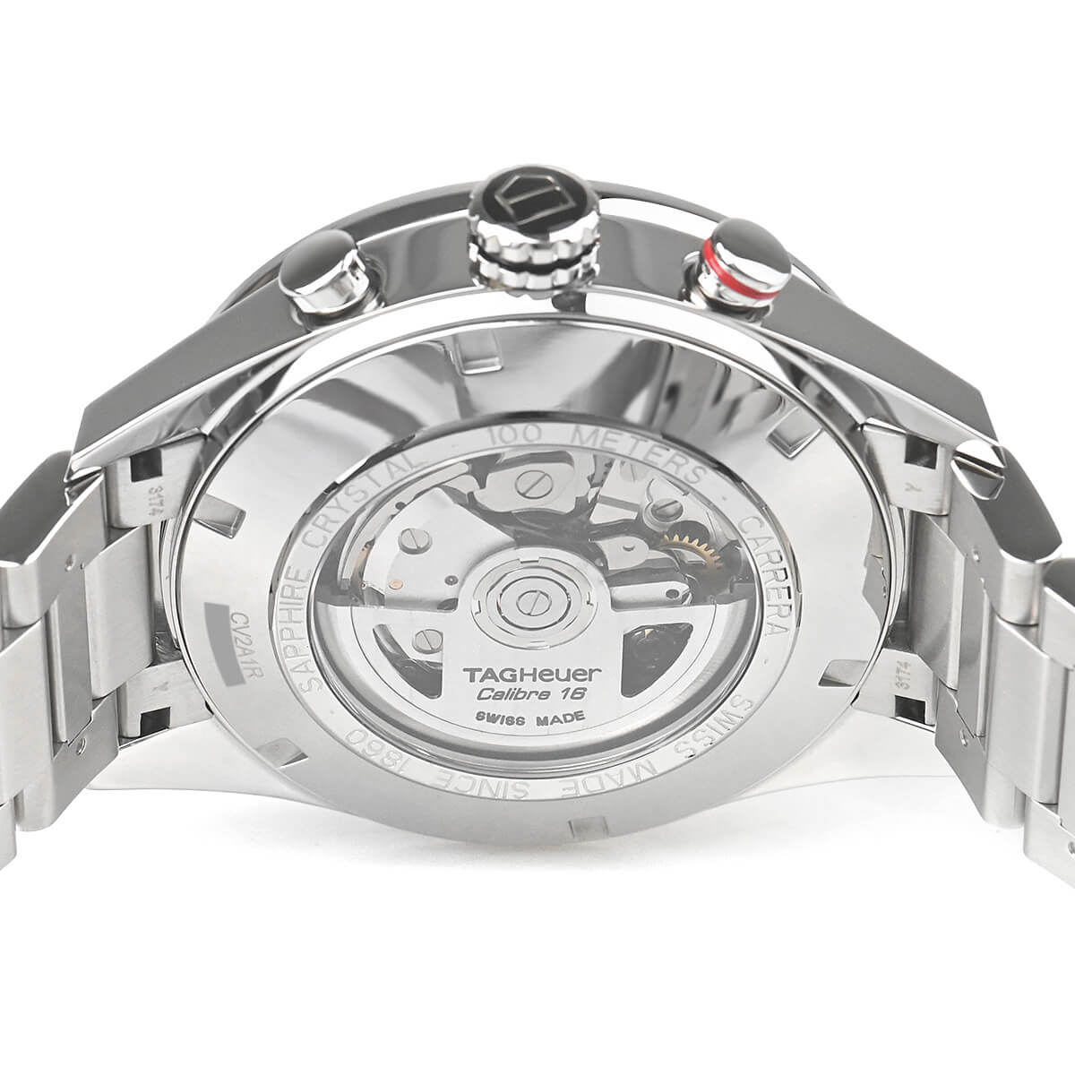 ケースはシースルーバックになっており、機械式クロノグラフの動きが鑑賞できます。