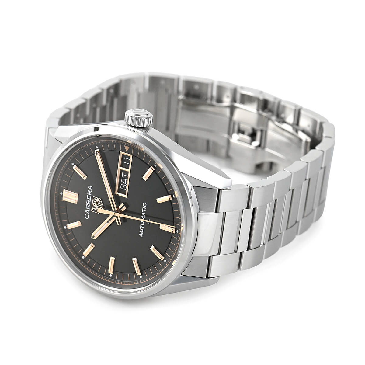 タグホイヤーの【カレラキャリバー5・デイデイト】が細かい変更を受け、NEWリリースされました。ブラックオパーリンダイヤルに、18Kの5Nローズゴールドプレートがシャープな印象を与えます。他にも実用的な造り込みがされており、細かい部分では針の夜光部分が大型化され視認性が向上。