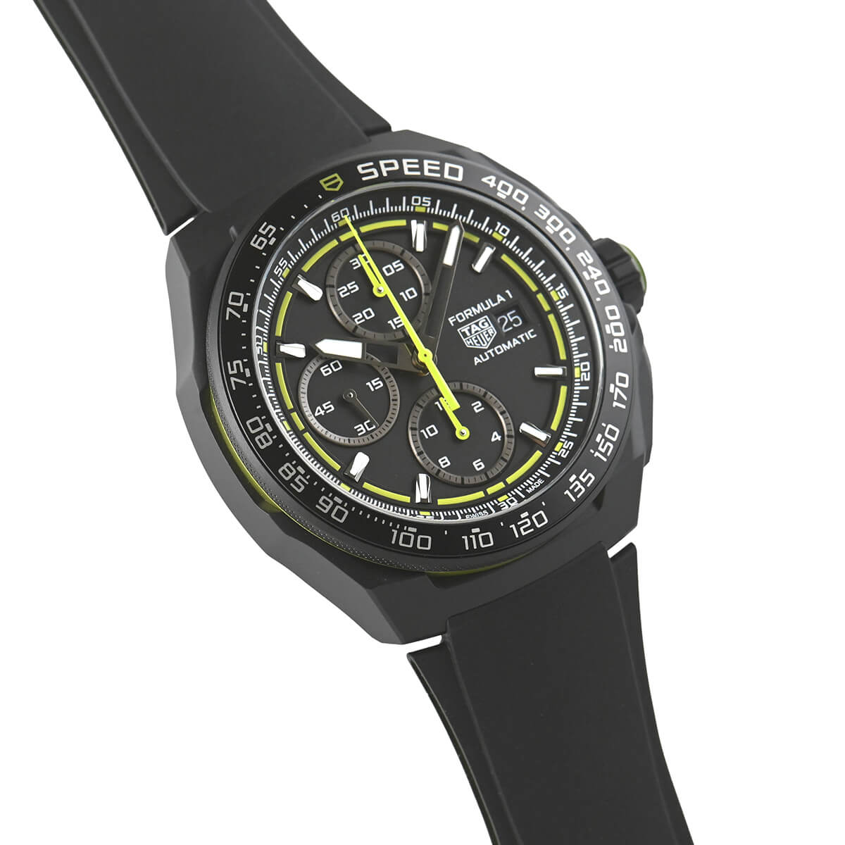 「フォーミュラ1 クロノグラフ」は、モータースポーツから着想を得たスポーティなデザインで知られるシリーズですが、本モデルは従来のスタイルから大きく進化を遂げています。ケースには軽量かつ耐久性に優れたグレード2チタンを採用し、サンドブラスト仕上げによってマットな質感を強調。これまでの「フォーミュラ1 クロノグラフ」とは一線を画す、洗練されたインダストリアルな雰囲気を演出しています。